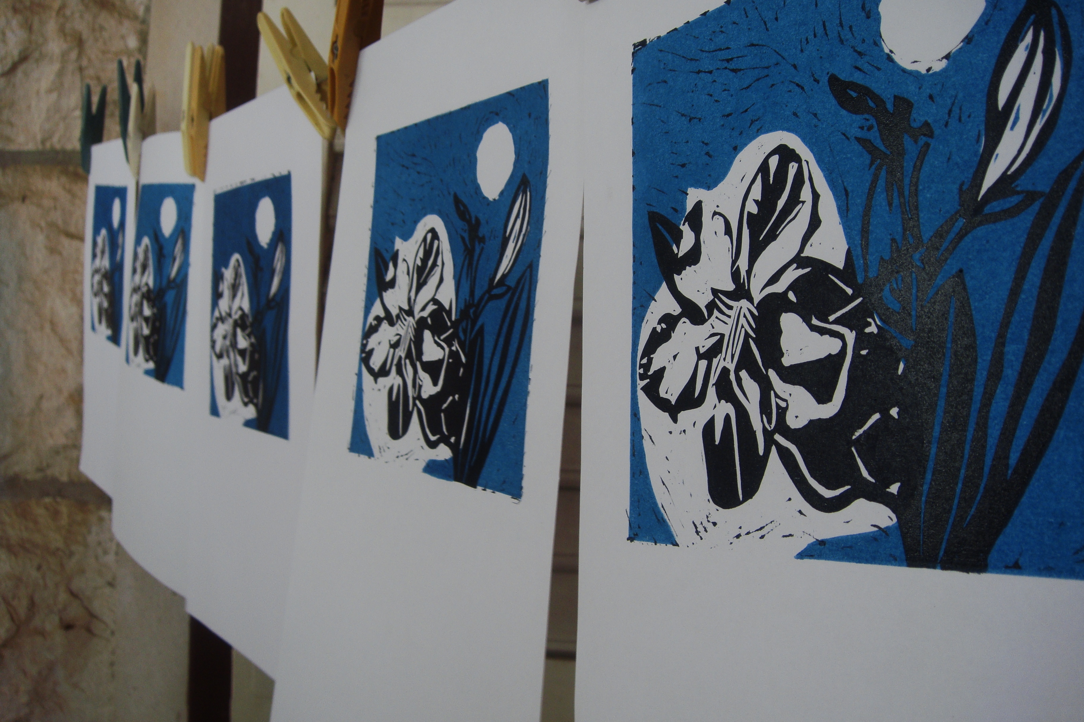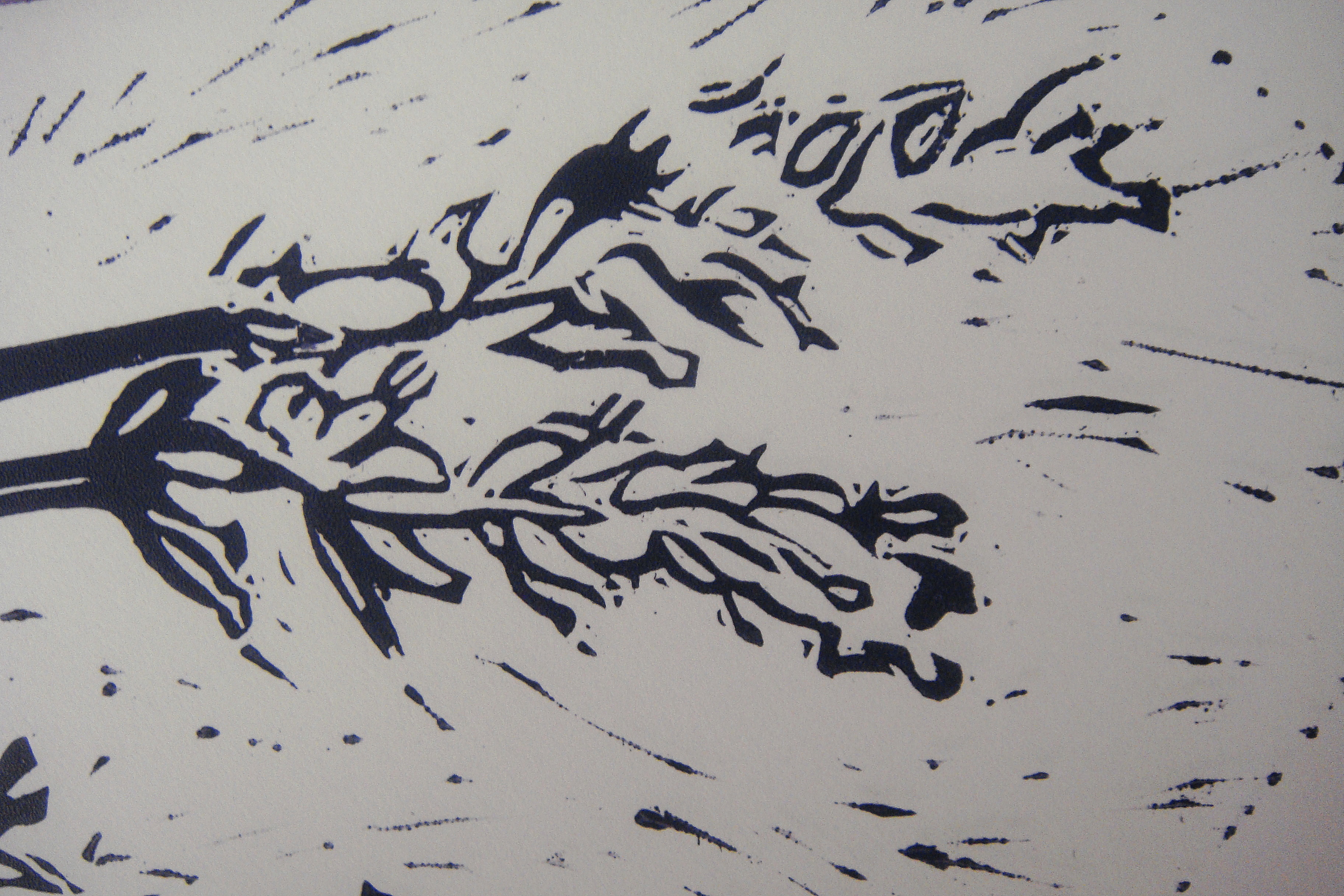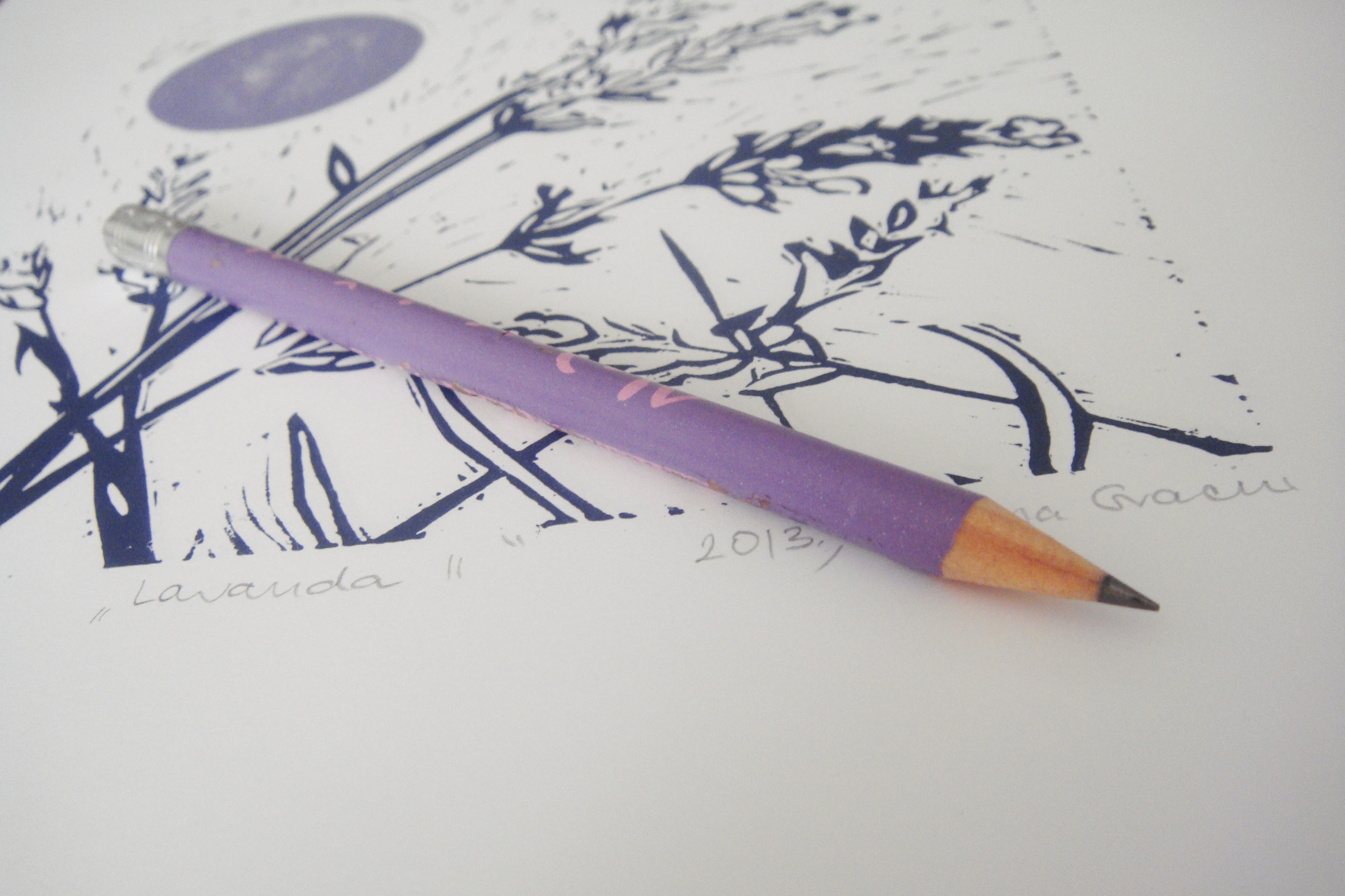 Kad sam otiskivala “lavande” odlučila sam ostaviti “pjege” na mjesecu; boja na toj plohi nije do kraja otisnuta. To doduše više nije klasičan linorez zato što bijele mrlje koje ostaju (u ovom slučaju “pjege”) ne mogu svaki puta biti iste.Tako je mjesec na ovom linorezu više monotipija.
