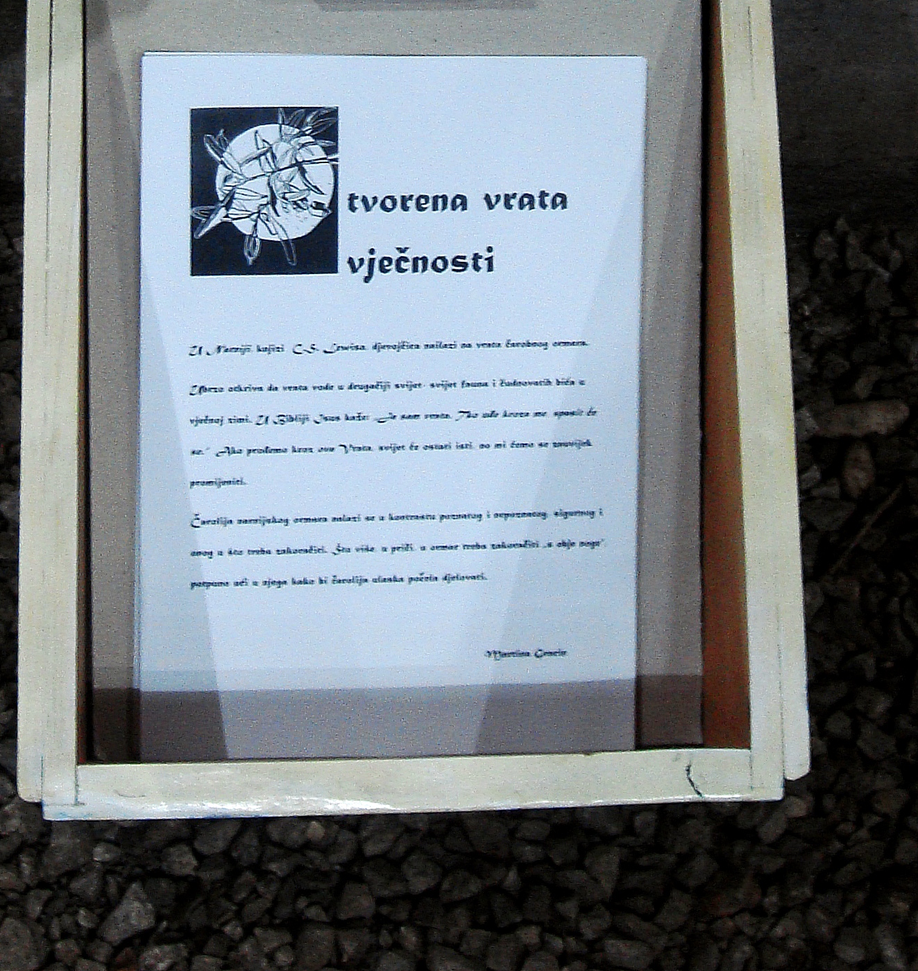 Izložba se, sad već tradicionalno, održava u Vršilnici Novih dvora, gospodarskom objektu iz XVII. stoljeća. Tema me izložbe (Otvorena vrata vječnosti) podsjetila na C.S. Lewisa i čudesni ormar koji vodi u Narniju.