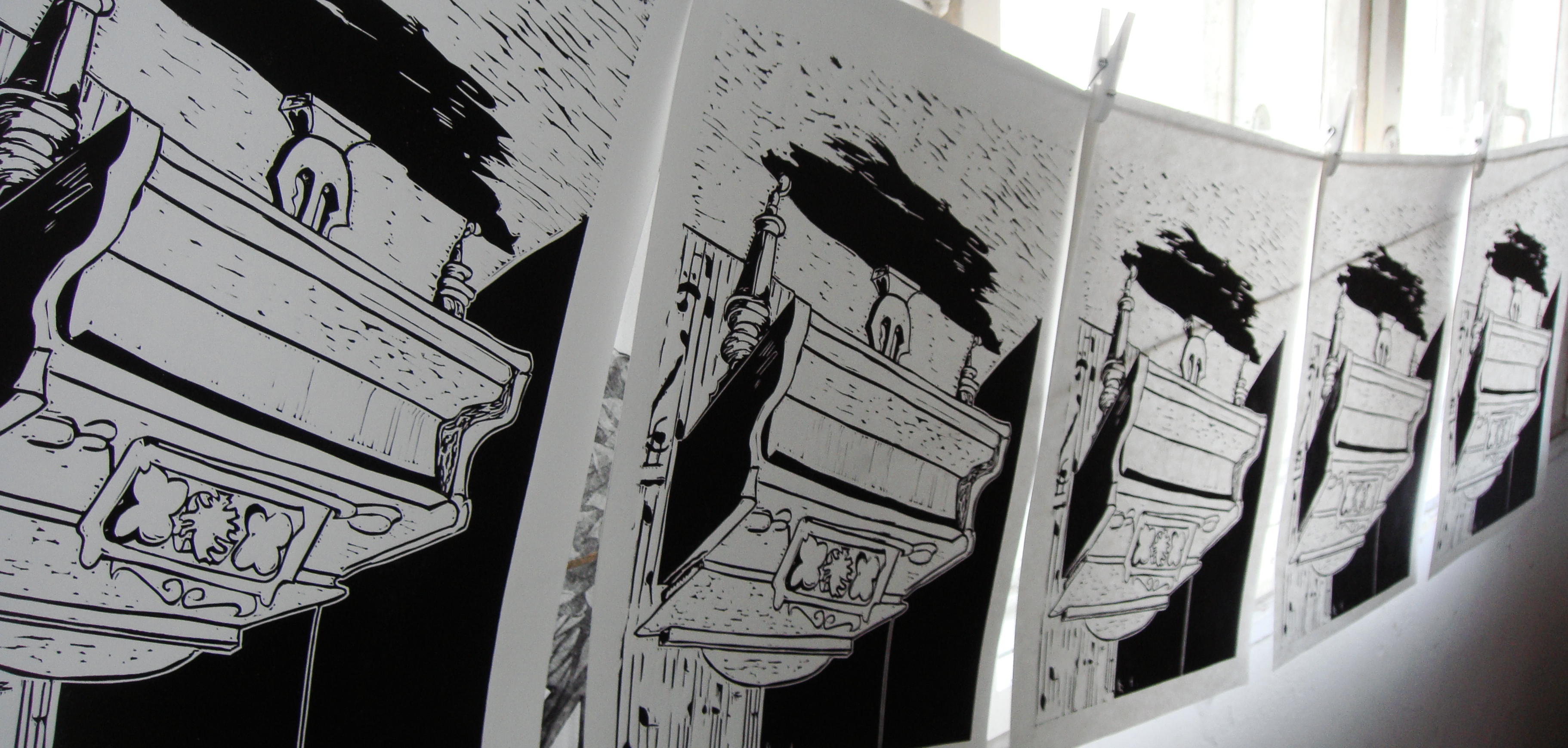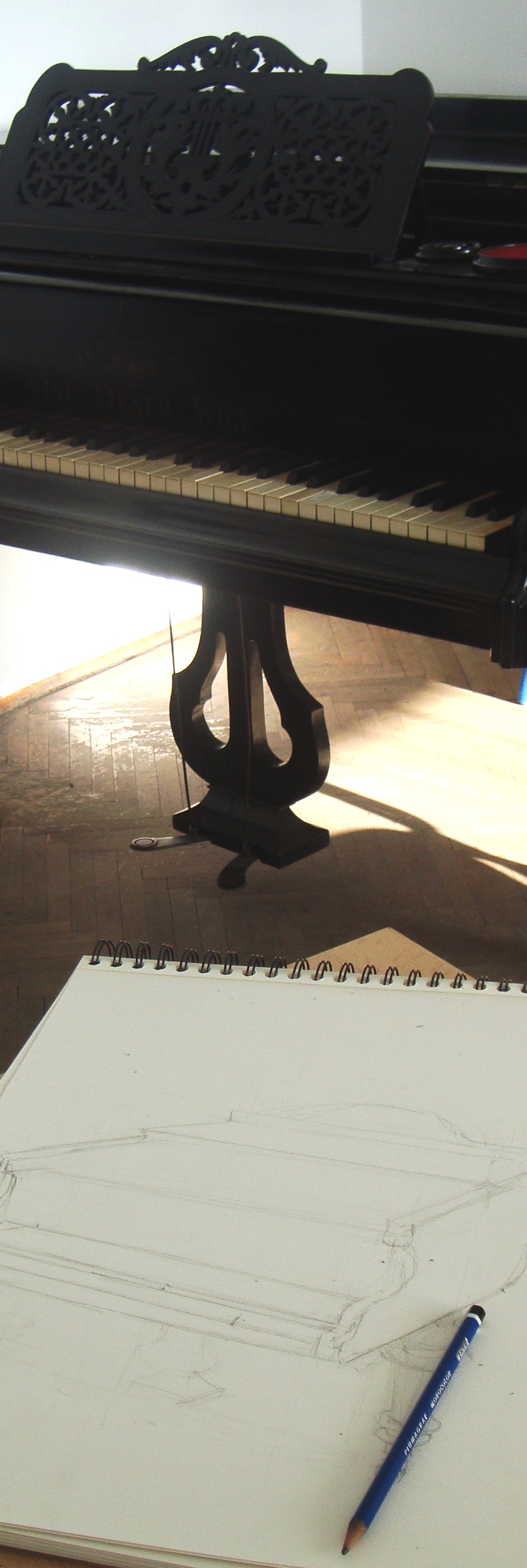 Stari klavir koji mi je bio motiv za ovu grafiku doduše nisam pronašla u kutu nekog gospodskoga stana, već u jednoj glazbenoj školi. Ali ostali uvjeti odgovaraju- klavir je u glazbenu školu stigao iz Beča, a i je star više od 100 godina…Vinc. Oeser. Vien. U svakom slučaju, detaljno izrezbaren, s mjestima predviđenim za svijeće…Vizualno zanimljiv! To je ono što je meni bilo presudno.