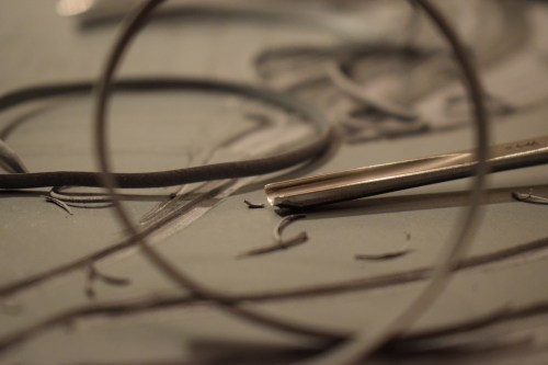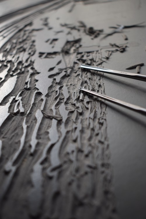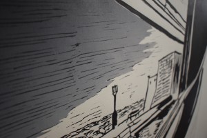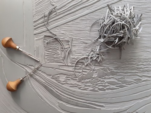 Veće dijelove prozora, one koji u otisku trebaju ostati bijeli, dubila sam širim nožićem. Interesantno je dubiti bjeline jer su to dijelovi ploče koji omogućavaju duži i širi potez. Taj dio posla mi ne zahtjeva toliku koncentraciju (niti količinu svjetla) pa je prikladan za rad po noći. Uz to, noću te duge vijuge linoleuma koje se vade, proizvode i zanimljive sjene. To djeluje čudesno smirujuće i terapijski, što uvijek dobro dođe. A pogotovo ovih dana.