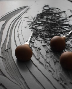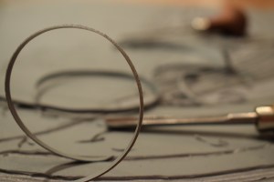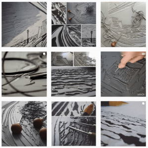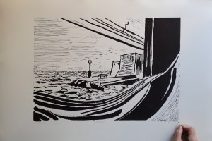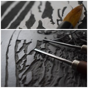 Set kistova za kinesku kaligrafiju pronašla sam u svom kućnom ateljeu. Tata mi ih je prije nekoliko godina donio iz Šangaja. Među gomilom papira našao se i komad klobučnog, pa sam se bacila na posao. Fluidnost poteza koju omogućava tehnika korištenja ovih kistova bio mi je idealan za crtanje površine mora. Mnogi stručnjaci debatiraju o tome ima li smisla detaljno prenositi karakteristike crteža u grafiku. No meni je, za moju površinu mora, upravo to prenošenje bilo ključno. Htjela sam svoje valovite crte što detaljnije izdubiti u linoleumu.