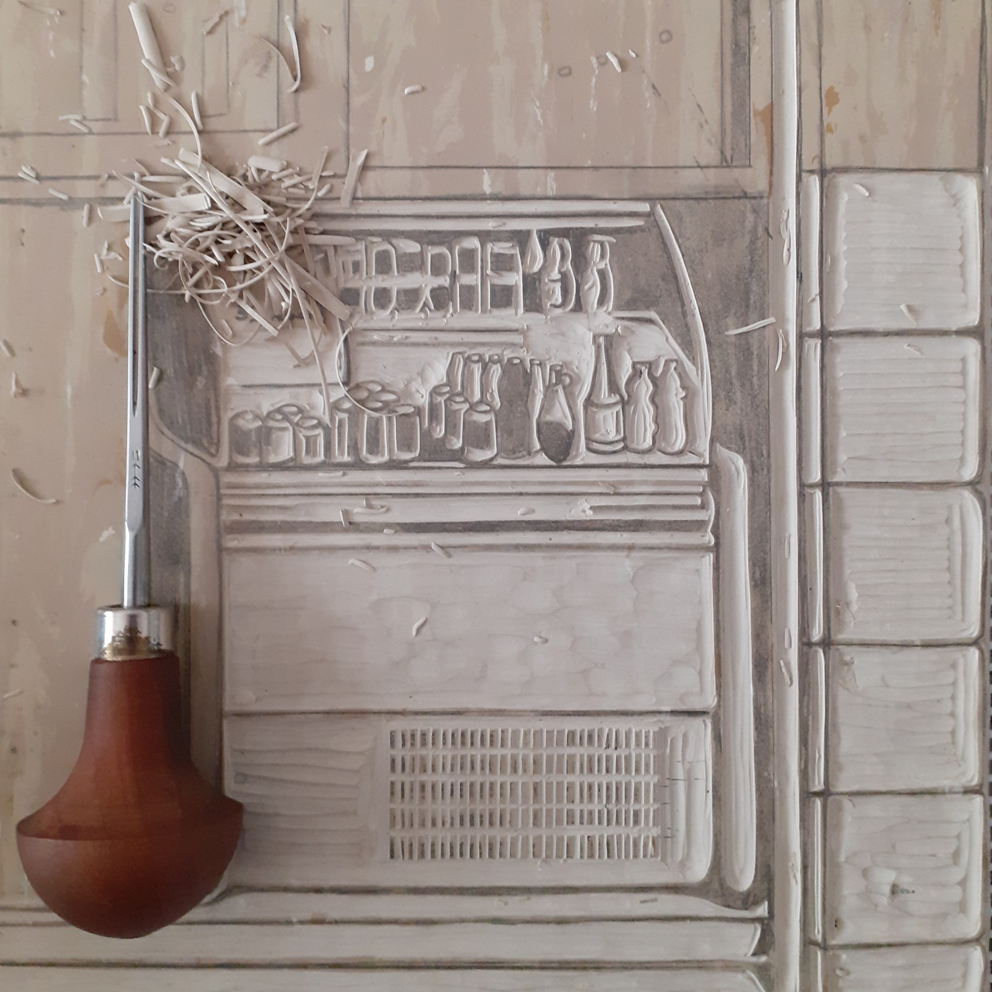 Nakon jesenskog koloriranja nekad ranije otisnutih grafika, uslijedilo je zimsko otiskivanje otprije izdubljenog linoreza manjeg formata. Ovog, na kojem je (na gornjim fotografijama) već nanesena grafička boja, izdubila sam 2016. godine.