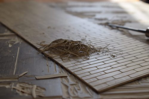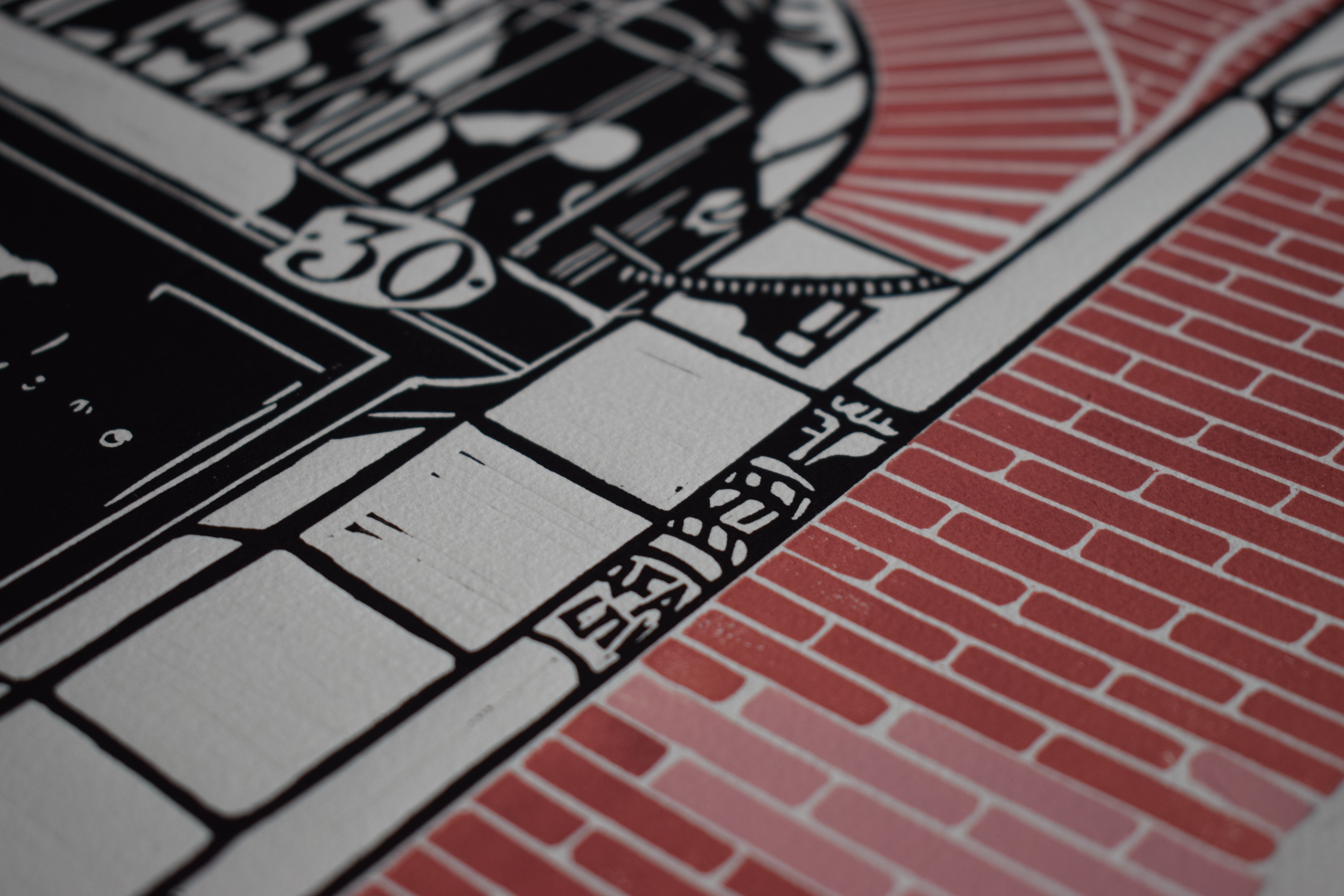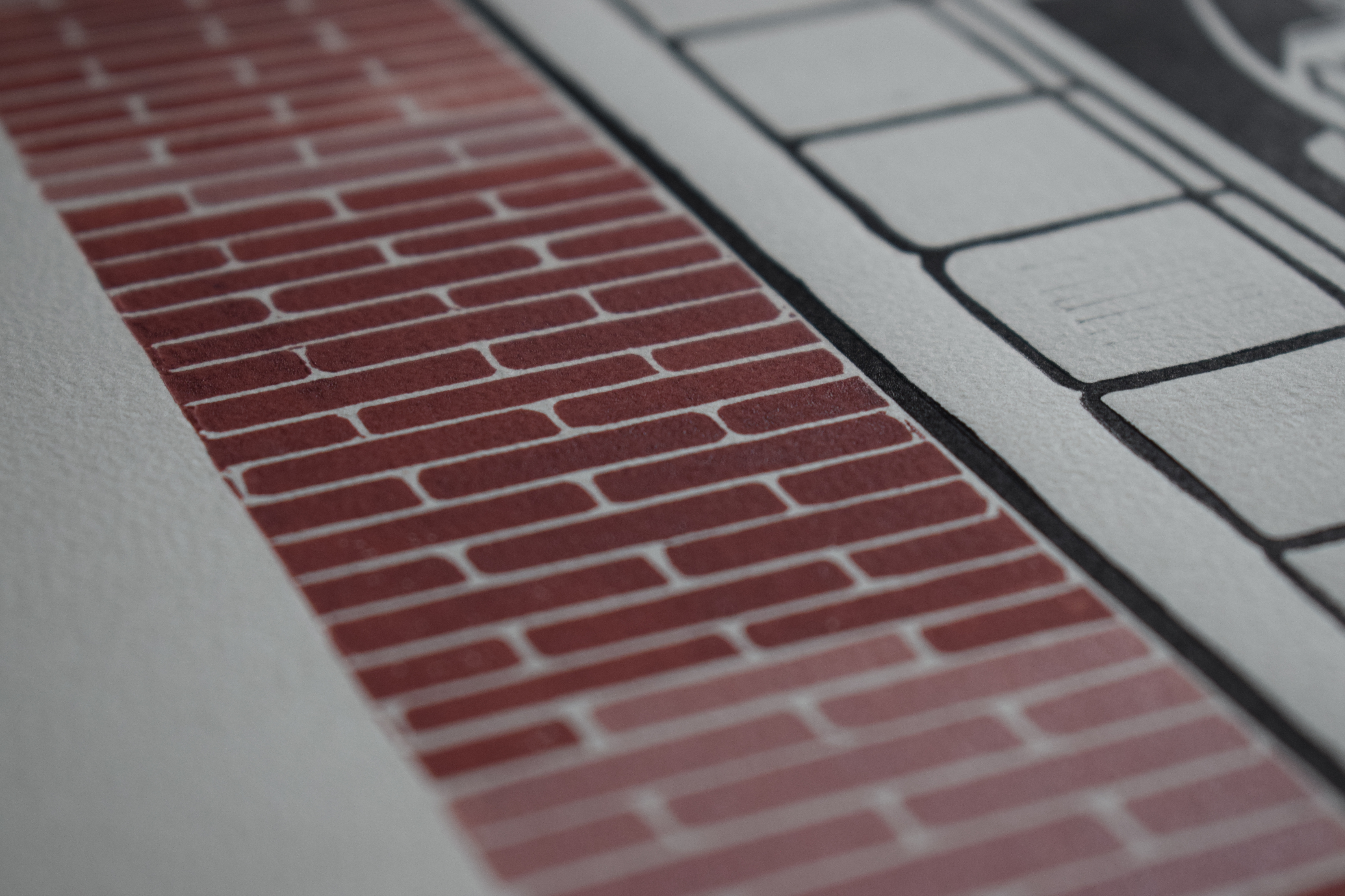 Razmišljajući o odabiru boje za svoju dodatnu ploču linoleuma, dala sam se na istraživanje. Pregledavala sam fotografije Toulousea i gledala neke značajnije ciglene građevine u svom gradu. Primijetila sam kako ti cigleni zidovi gotovo nigdje nemaju jednoličnu boju. To me navelo na ideju da izdvojim neke dijelove svog zida za drugi ton boje. I napravim još jedan probni otisak.
