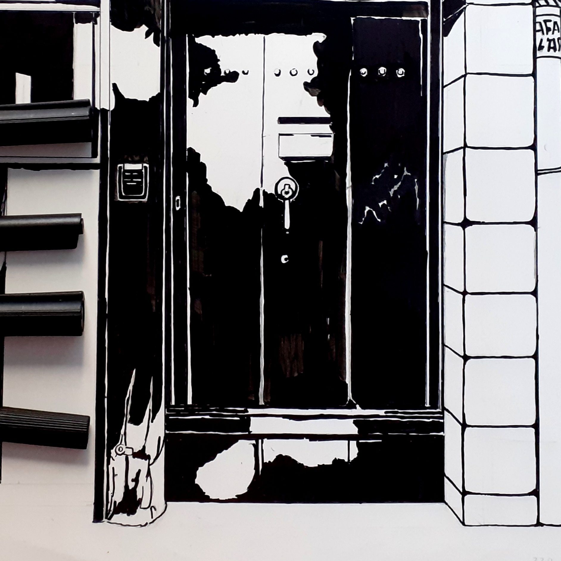 Krenula sam crtati skicu. Svidjela mi ideja crtanja igre sjena na vratima. S vremenom su, međutim, mnoge sjene na cijelom crtežu počele odavati dojam sveopćeg crnila, pa sam u procesu rada dodavala bjeline stvarajući teksture i uklanjajući suvišne sjene.