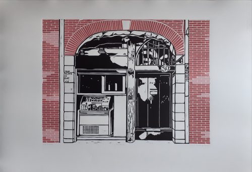 Ipak, od sve te povijesne gradnje, na ovom sam linorezu odlučila prikazati jedan neobični ulični prizor. Radi se o običnoj prodavaonici osvježavajućih pića u limenkama, čiju je temperaturu održavao plastični hladnjak serijske proizvodnje. No, prodavaonica se sretno smjestila, zajedno sa svojim PVC prozorom, u nesvakidašnji arhitektonski okvir. Naime, bila je uokvirena u jedan ružičasti luk ciglene zgrade. Uz to, pored nje su stajala još masivna drvena vrata s nakrivljenih kućnim brojem i nekoliko kamenih blokova na kojima je bio uklesan natpis nalik na one iz rimskog doba. Zajedno su svi ti, naizgled nespojivi, elementi za mene činili fascinantnu uličnu scenu. A naljepnice s grafitima i, ponovo, plastična cerada samo su pridonosili općem dojmu tog čudnovatog prizora.