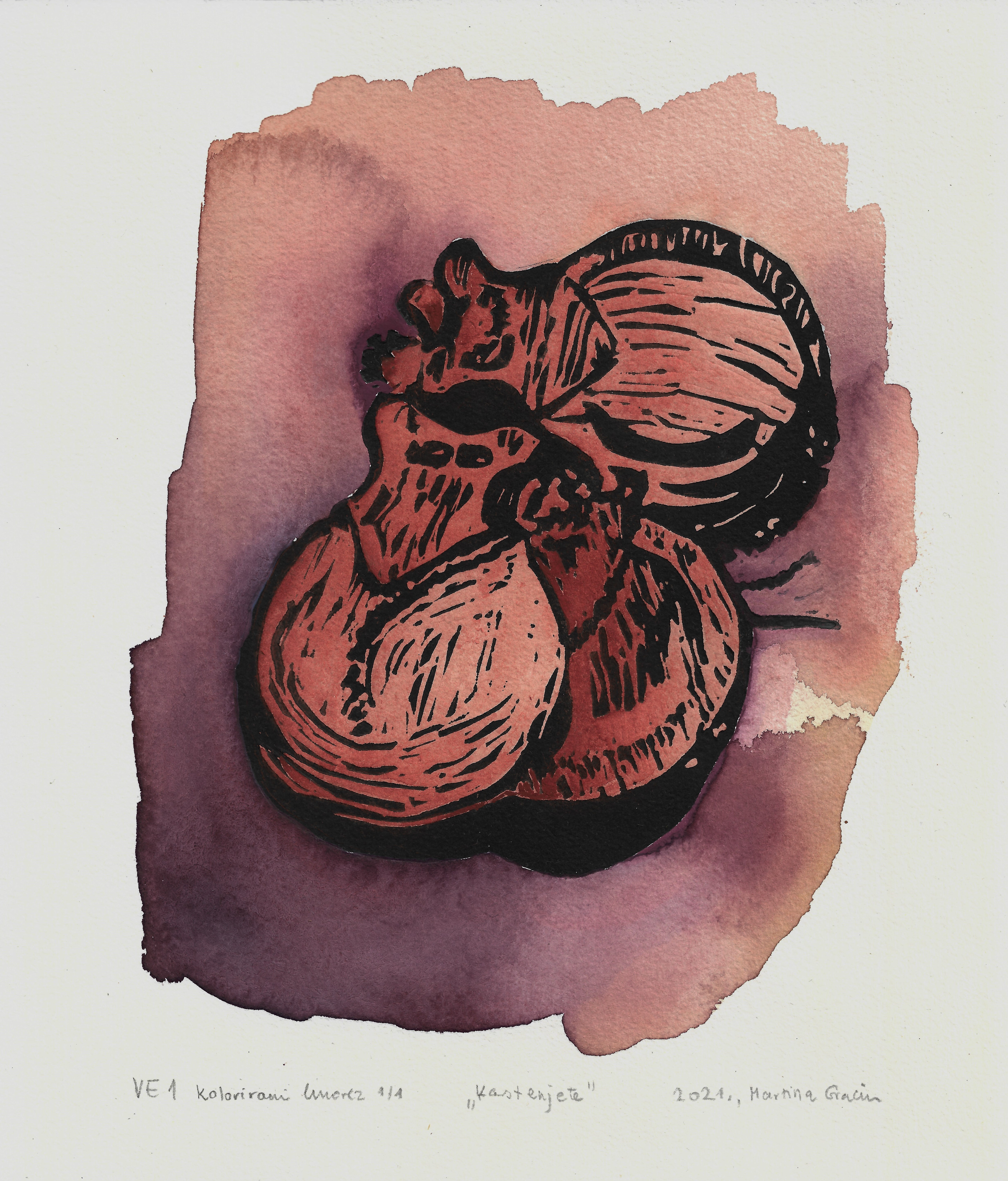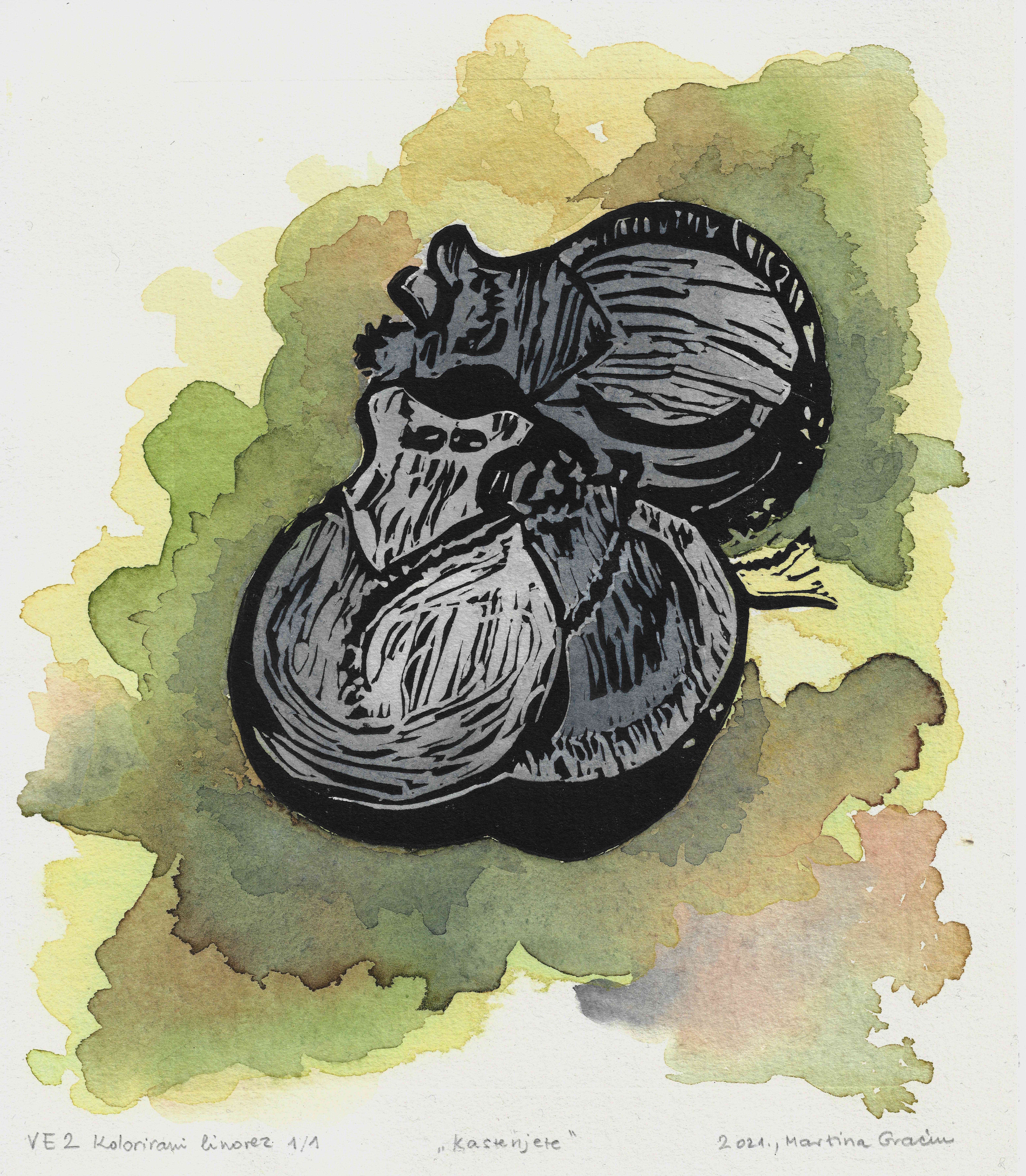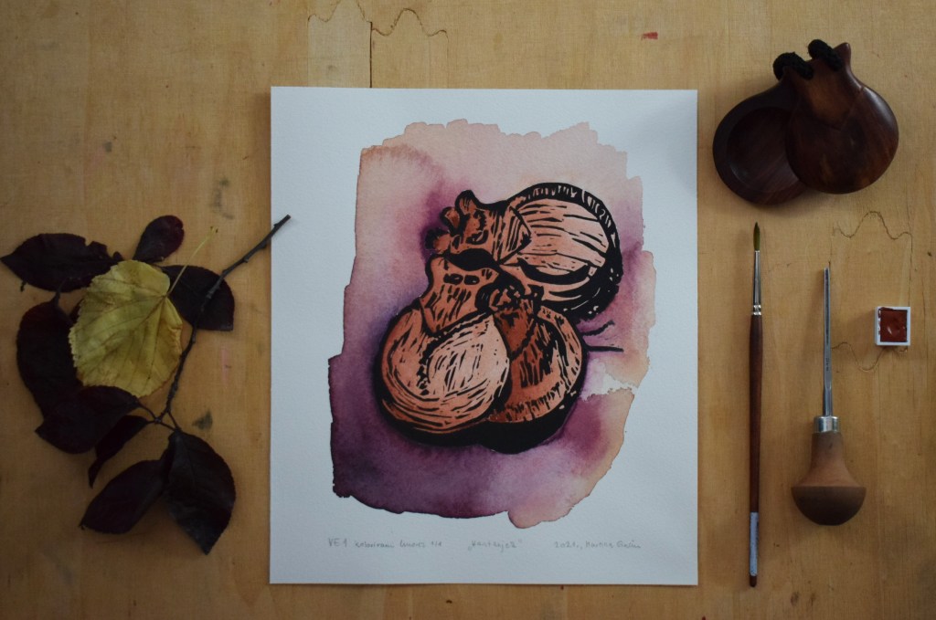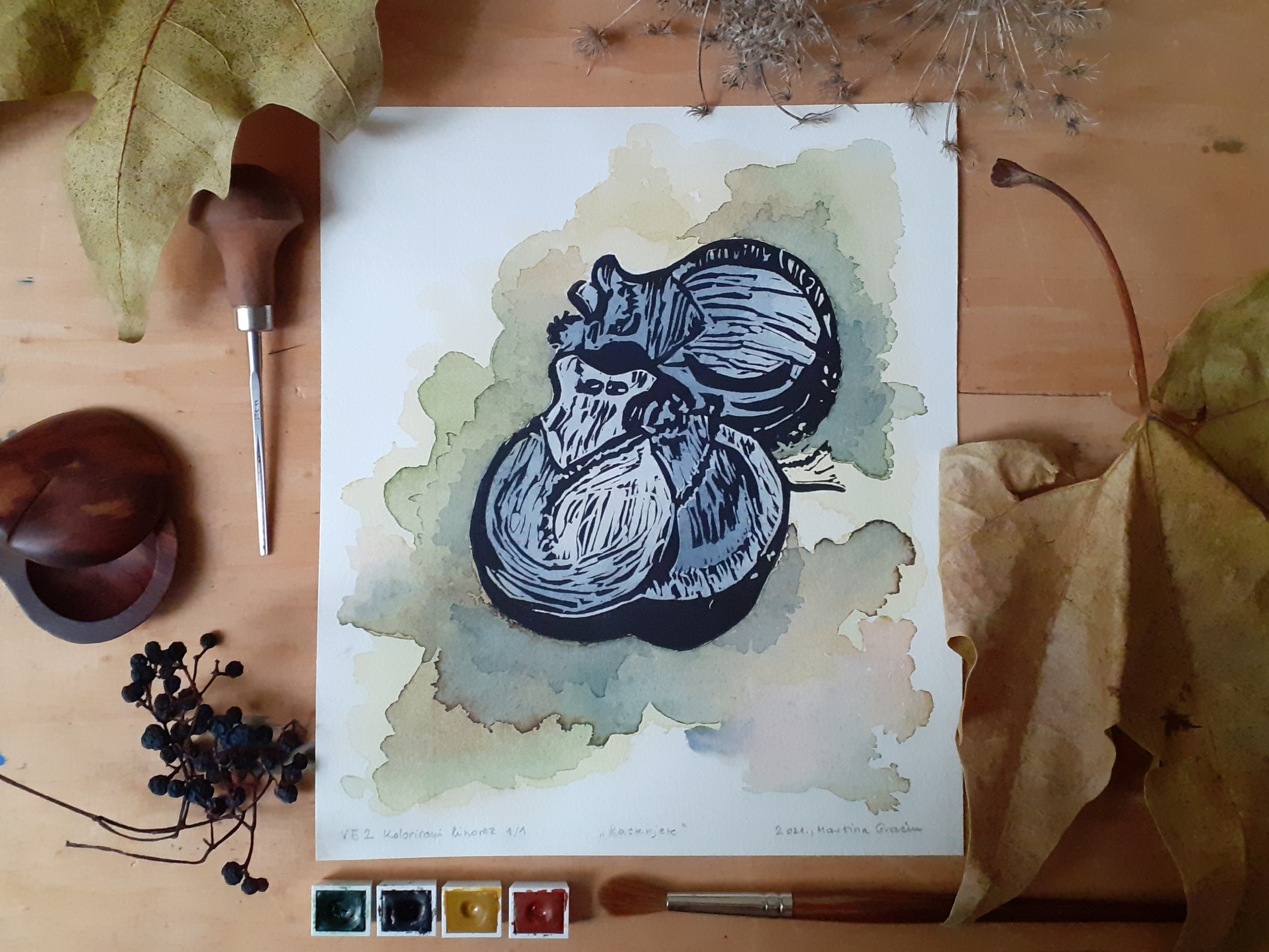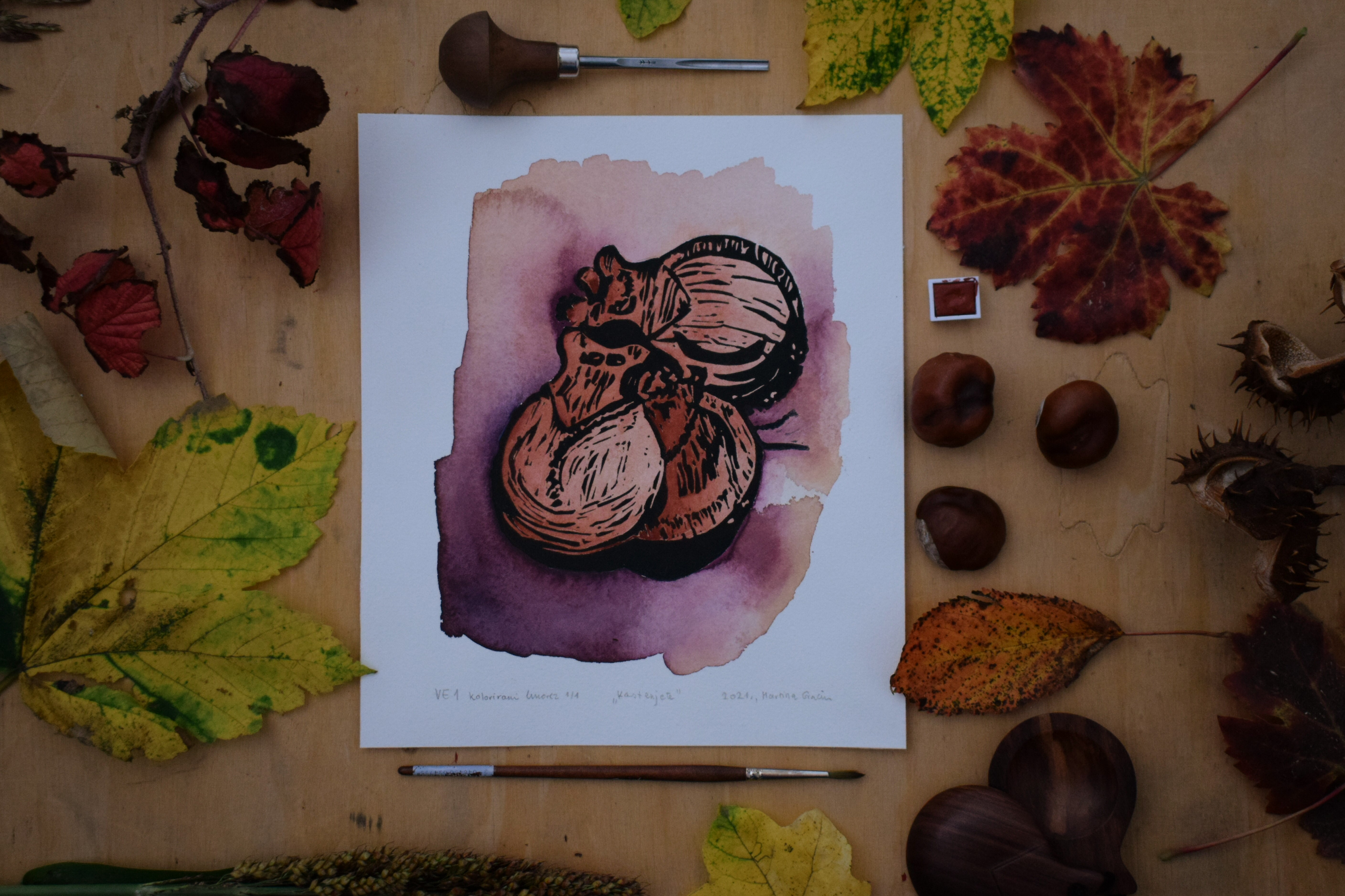Prvo jesensko koloriranje otisaka započelo je s linorezom koji prikazuje kastanjete. Ovaj sam linorez izdubila davno, no nikad nisam otisnula cijelu ediciju. Kako sam je sad krenula otiskivati, odlučila sam jedan od otisaka kolorirati akvarelom. Na fotografiji je ta prva varijacija u ljubičastim i smeđim tonovima. Fotografirala sam ga pored nožića za linorez, kista, akvarela i lišća. I samog instrumenta kojeg sam, za ovu prigodu, posudila od prijateljice. Ali one kastanjete koje su mi bile motiv, njih smo kupili u Španjolskoj. Tamo smo išli obiteljski, 2001. godine. Proputovali smo je cijelu. Po danu smo razgledavali Toledo, Salamancu, Madrid, Cordobu i Barcelonu, a navečer tražili kampove u kojima ćemo prespavati. I tako, u Španjolsku smo putovali 2001., linorez sam izdubila 2013. godine. A sad je, evo u 2021., linorez doživio i koloriranje.