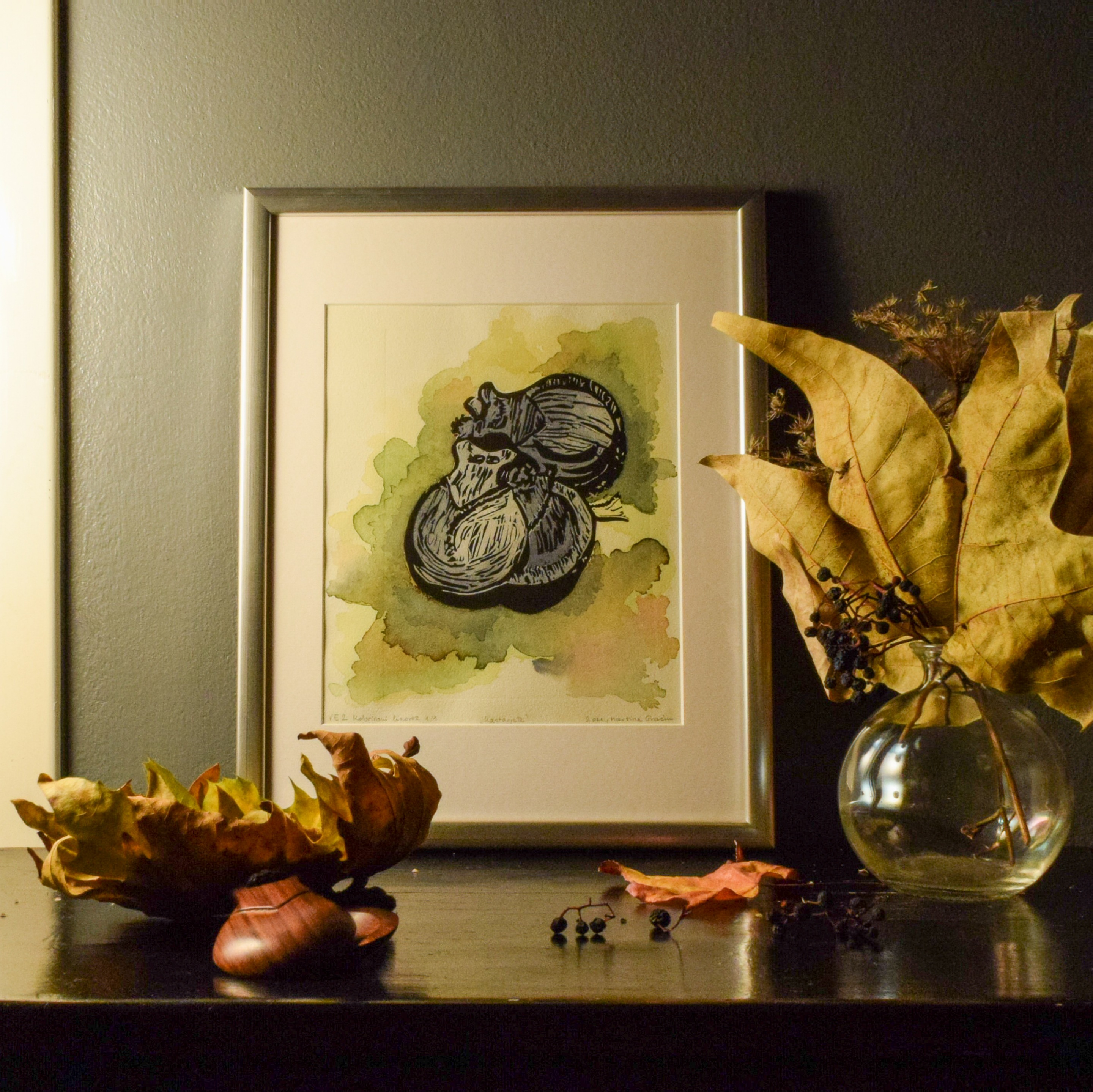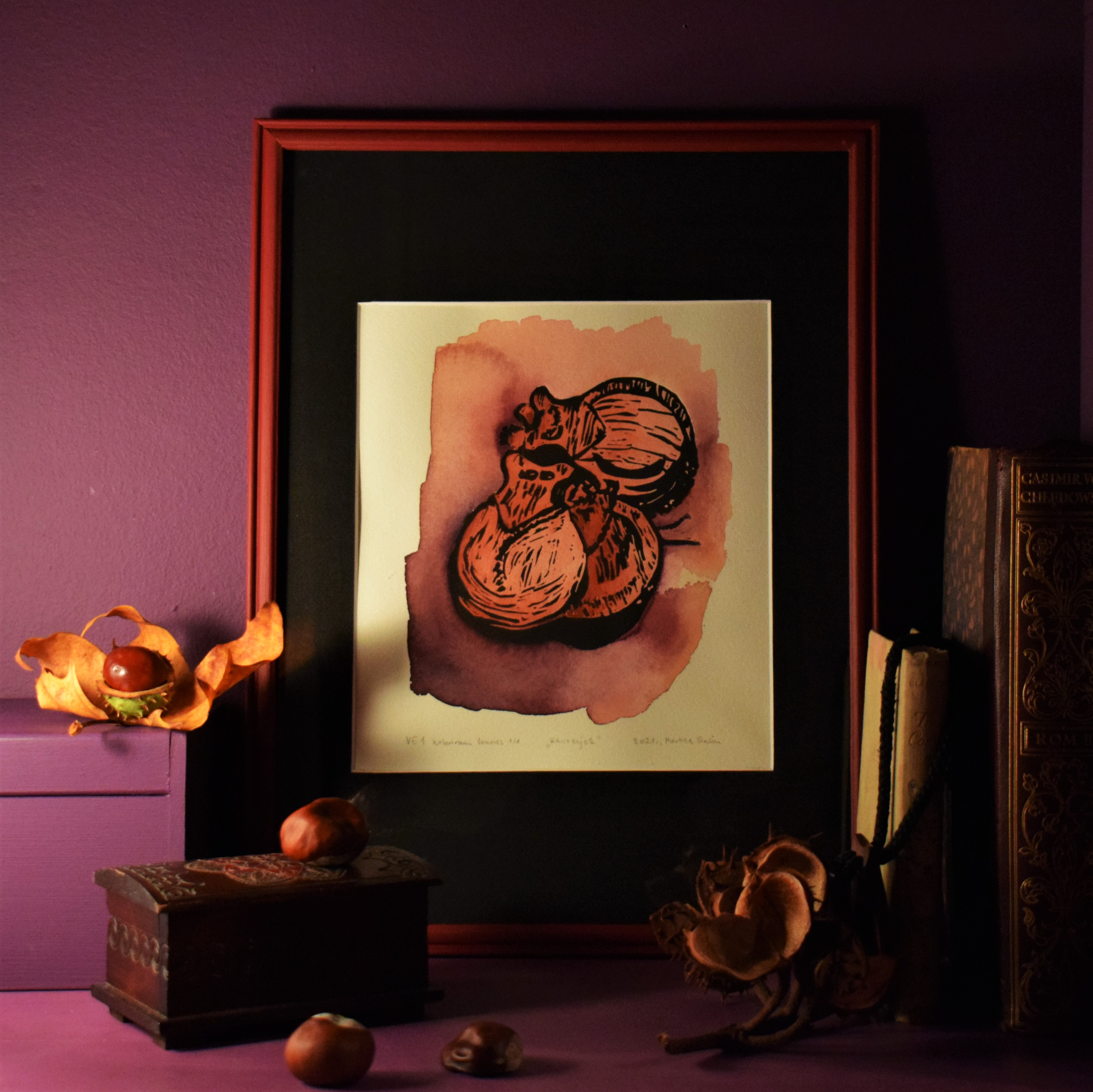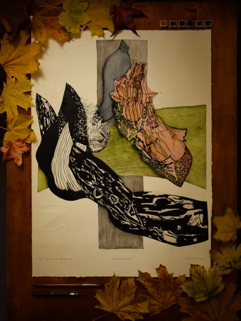 U komponiranju elemenata za ovu fotografiju, osim uokvirenog rada, koristila sam i lišće koje je pripomoglo u odabiru boja za koloriranje ovog linoreza.