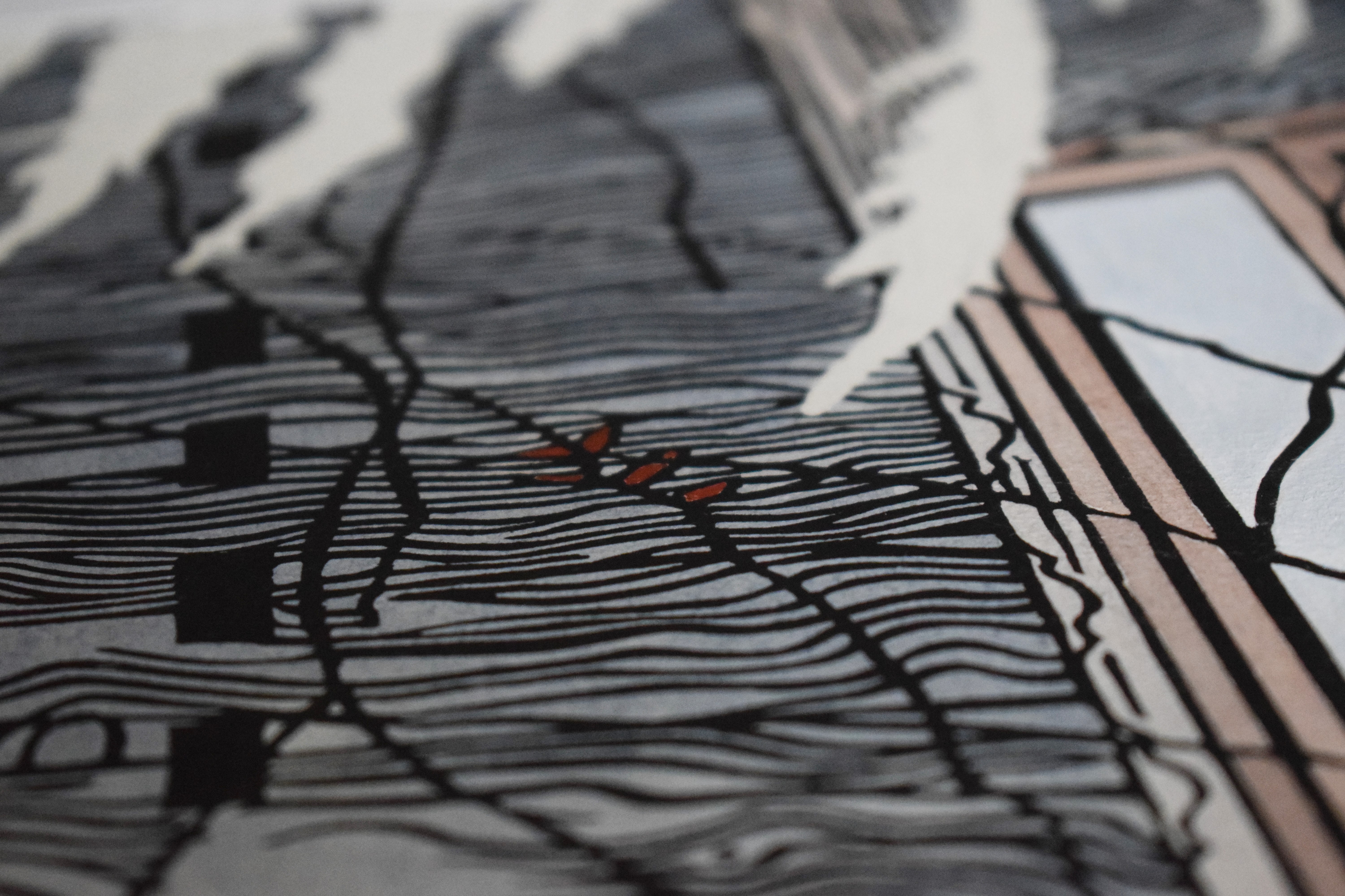 Odluka o tome hoće li neki dio biti crn ili bijel u početku je ovisila o tome hoće li taj dio linoreza predstavljati osvjetljene dijelove ili sjenu. Kasnije sam jednostavno odlučila neke dijelove prikazati kao u negativu. Ono što je u stvarnosti bijelo, promijenila sam u crno, i obrnuto.