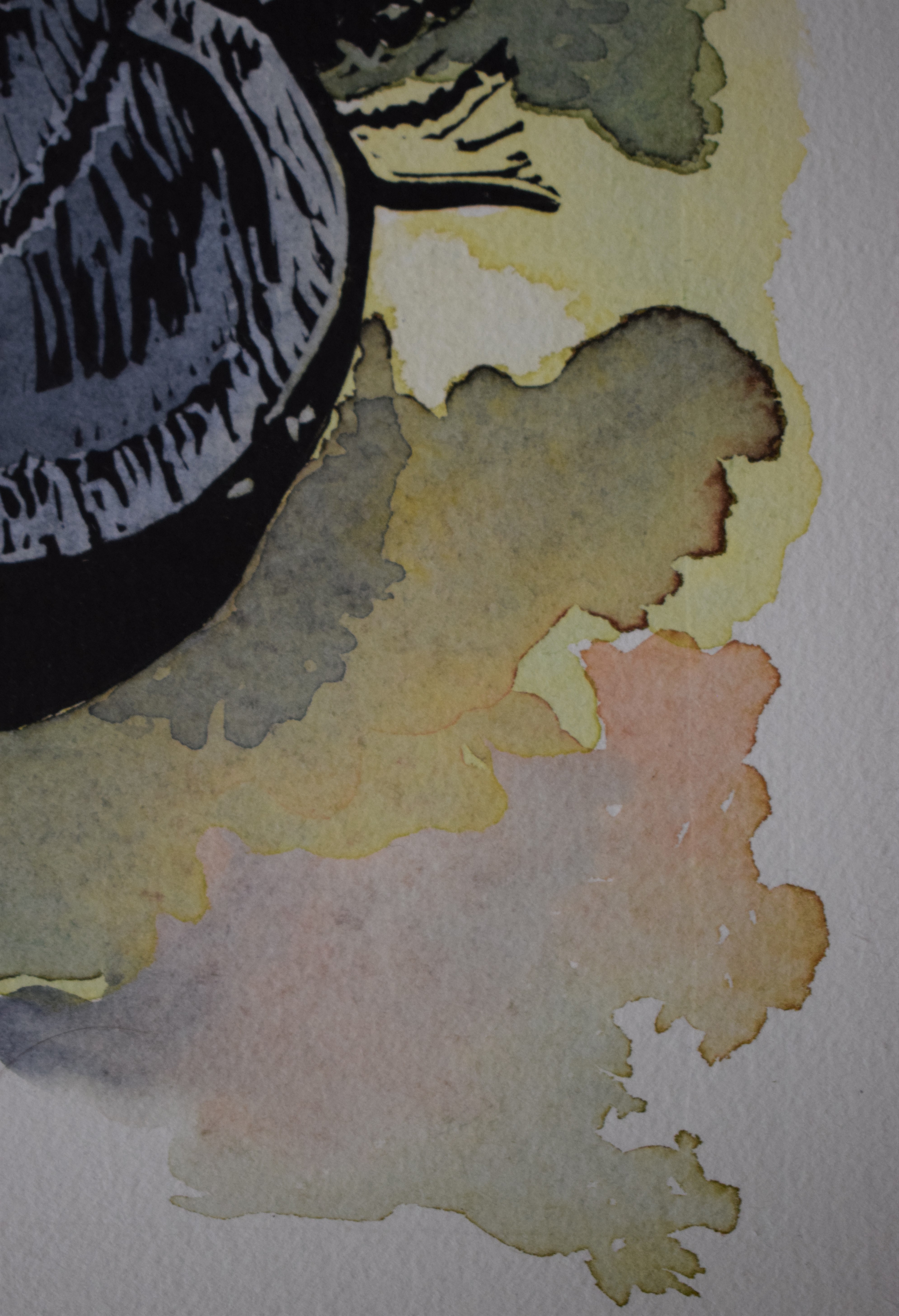 Nakon toga sam odlučila kolorirati jedan otisak grafike koju sam radila 2009. godine. Grafika se zove Defragmentacija II, a rađena je u tehnikama dubokog tiska (akvatinta, bakropis, suha ugla, svijeća i slijepi tisak). Kolorirala sam je akvarelom i akrilom.