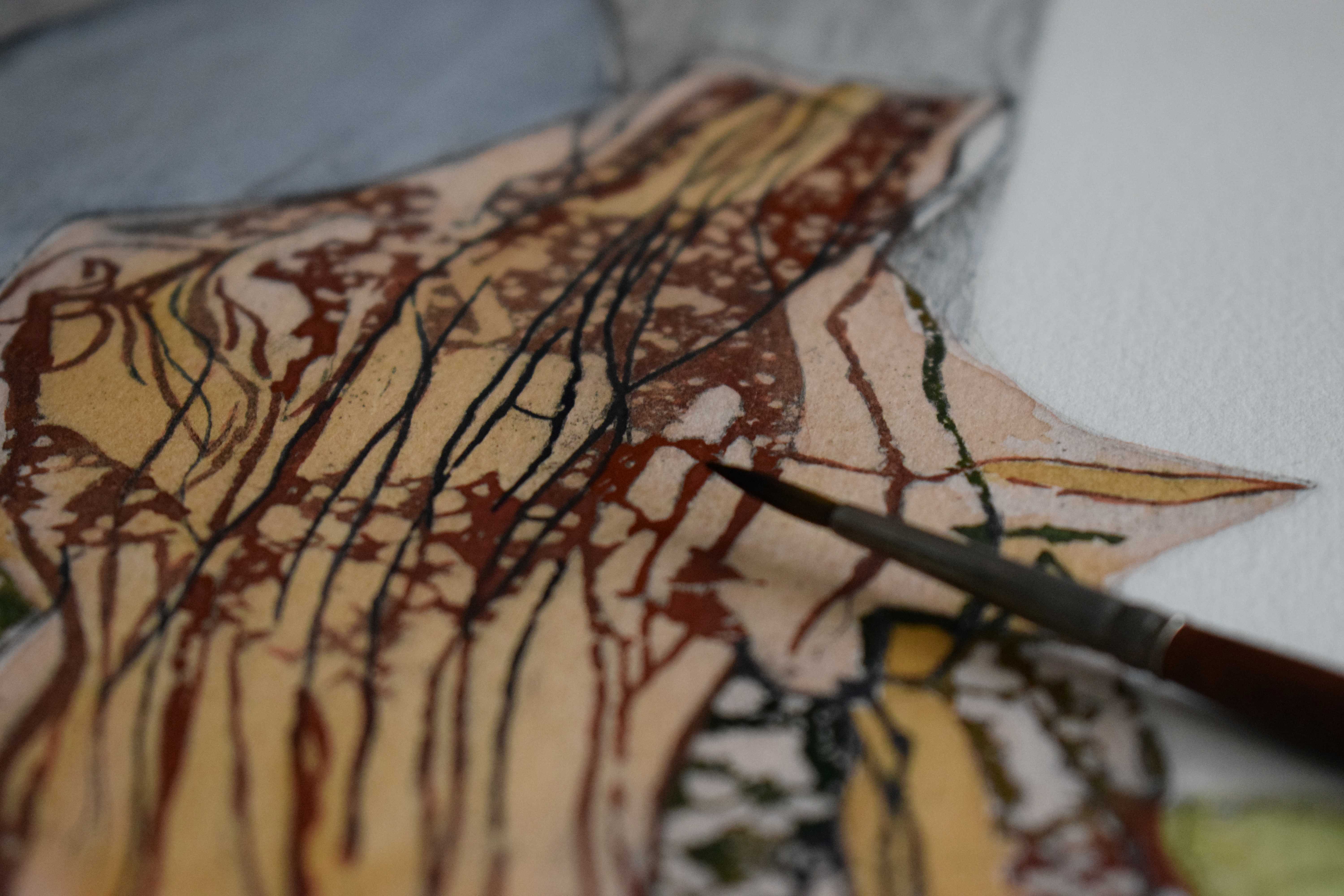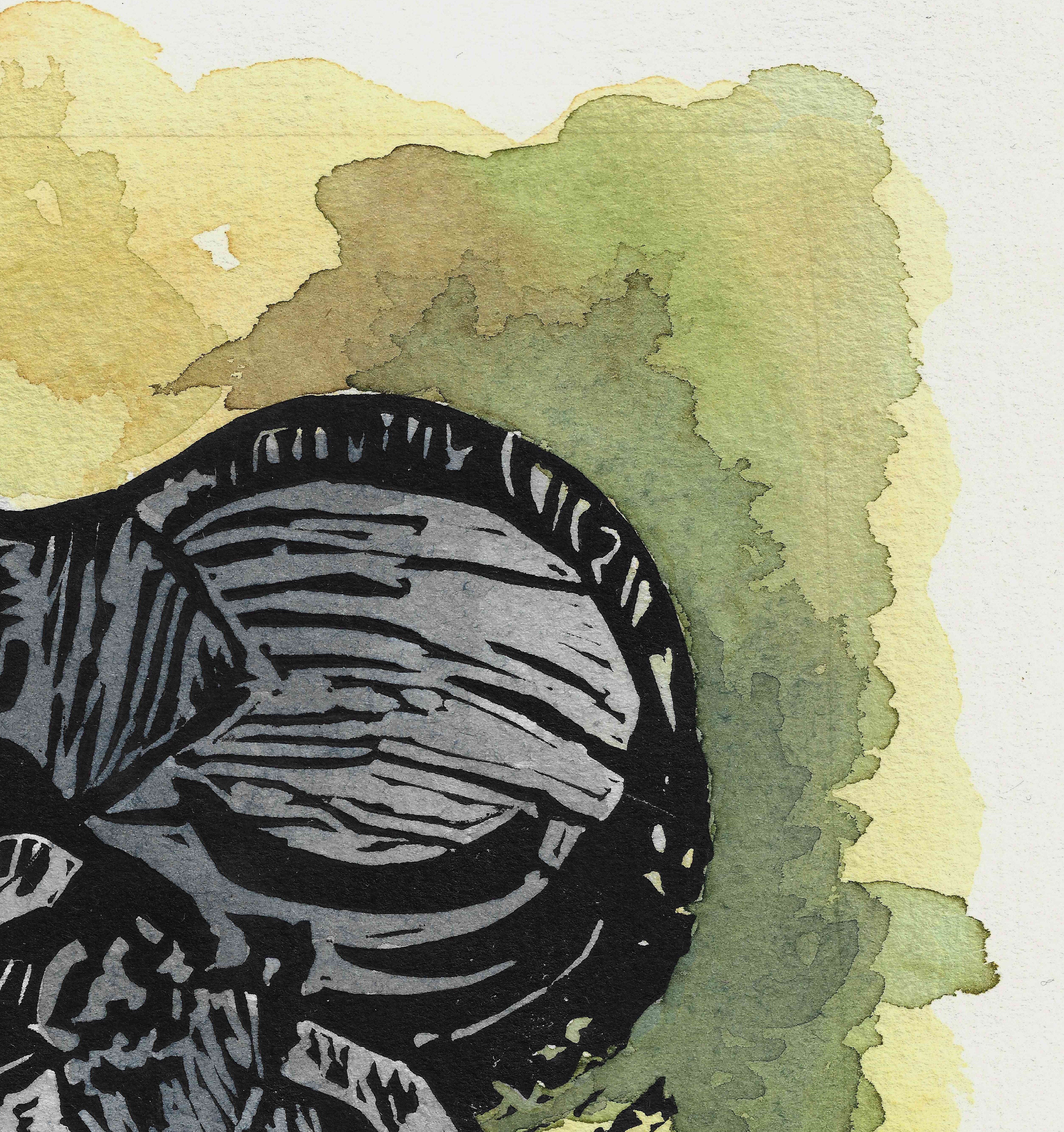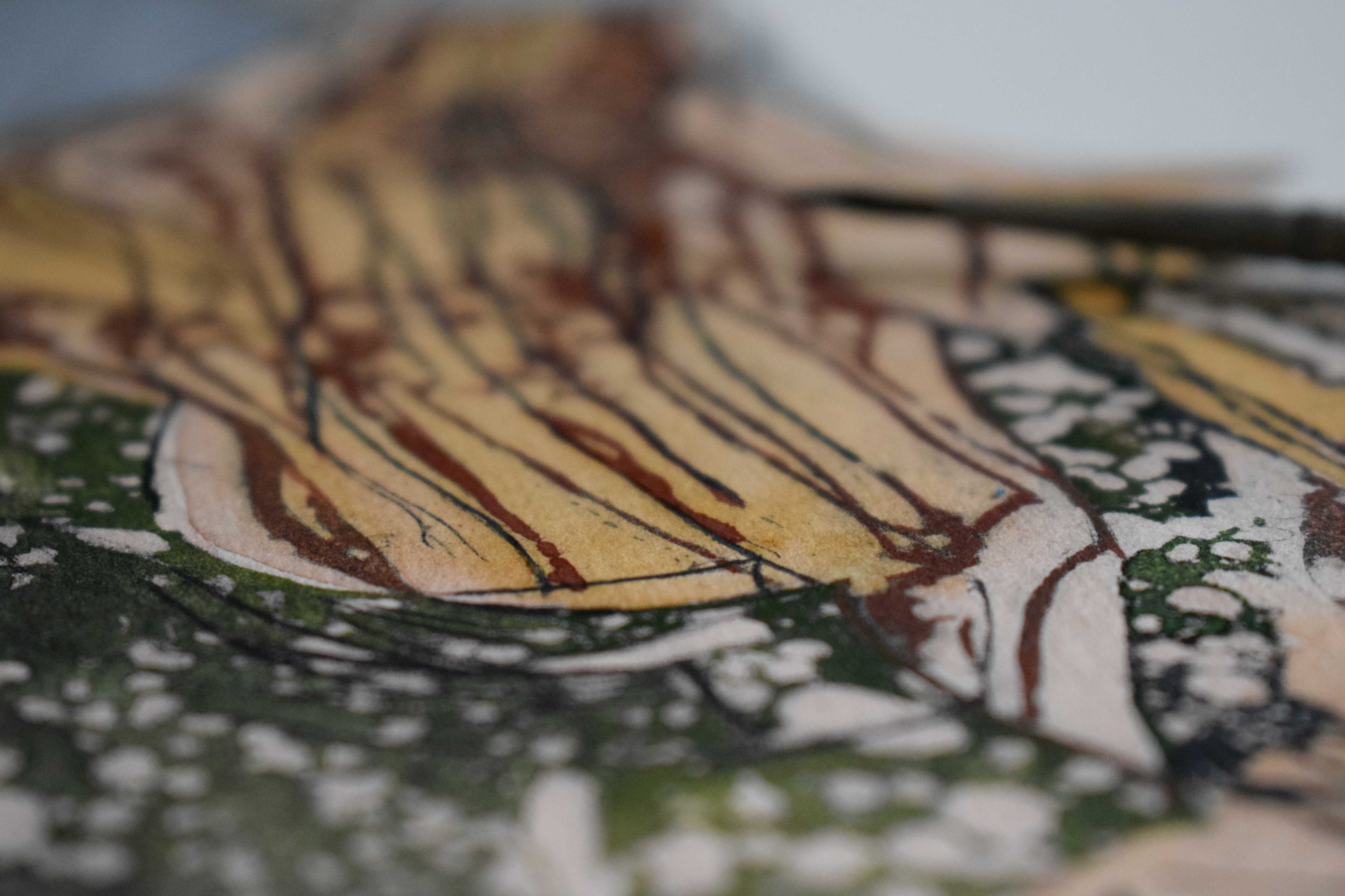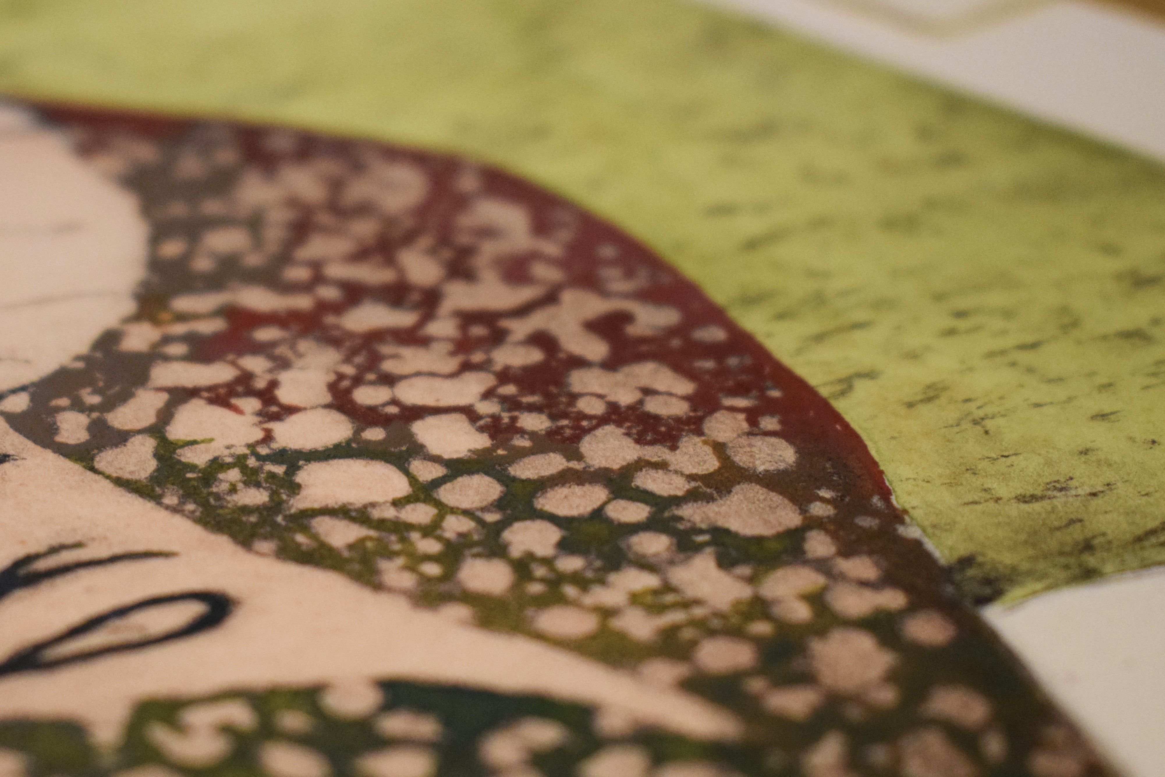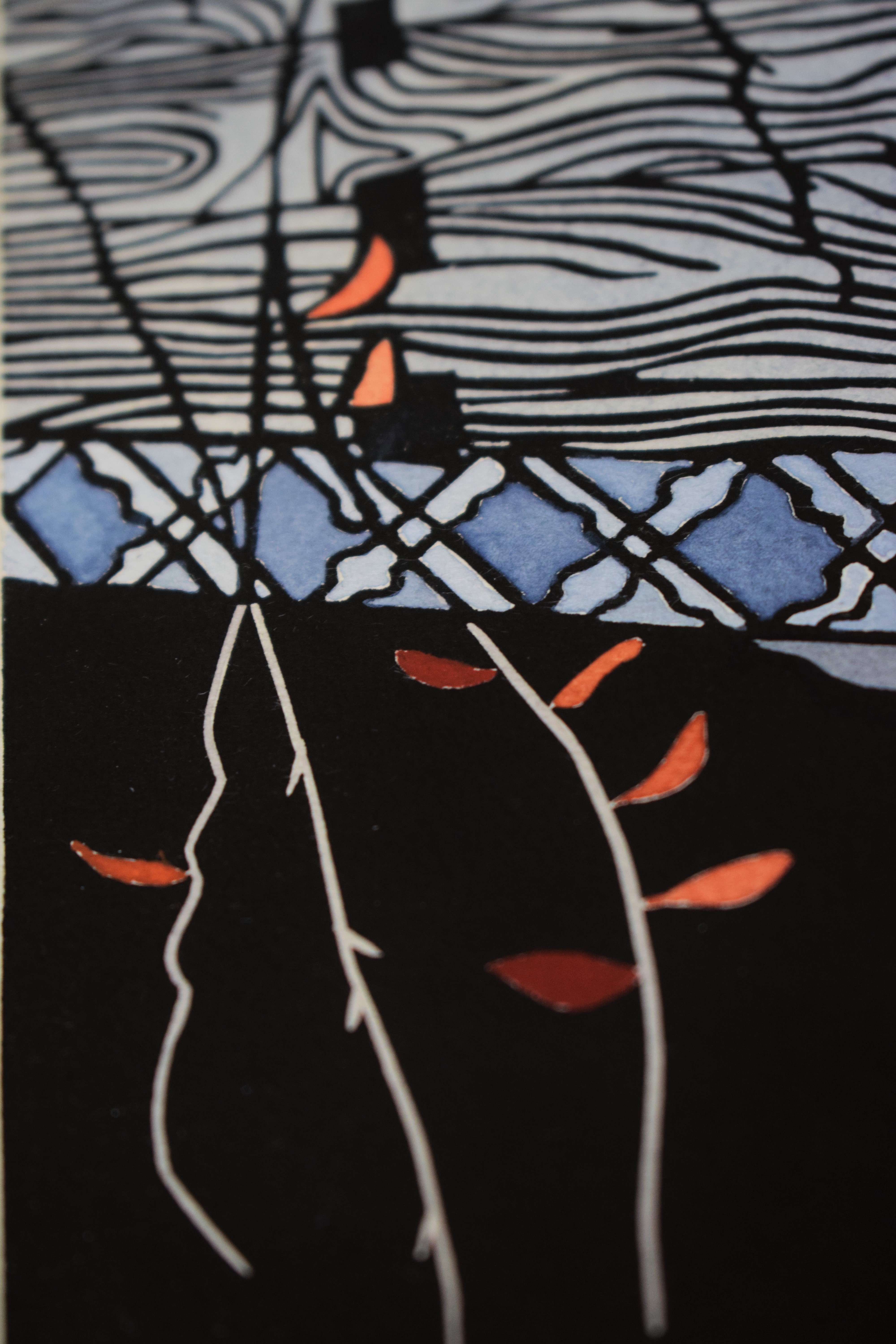Htjela sam da moje linije koje prikazuju teksturu budu izražajne. Kako sam napredovala u dubljenju ploče linoleuma, zaključila sam da moj interes za teksturu, koji se pojavio pri izradi prošlog linoreza, raste i razvija se.