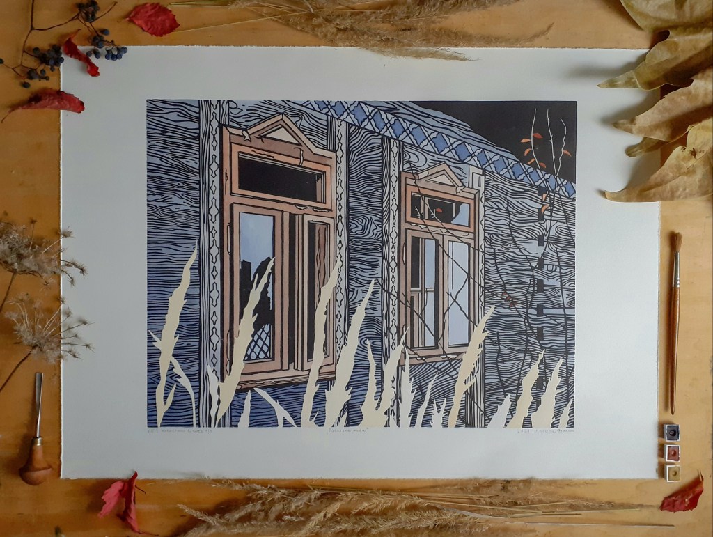 Nakon toga je uslijedio malo veći zalogaj, koloriranje linoreza Posavska kuća. Posavsku kuću sam radila prošle godine i ona je trebala biti izložena još tad, na jednoj skupnoj izložbi. No, radi epidemioloških uvjeta, izložba je bila odgođena. Tako sam je nedavno opet vidjela na otvorenju izložbe koja je ove godine ipak realizirana. Tad sam i odlučila kolorirati jedan od otisaka koji ranije nisam bila uvrstila u ediciju.