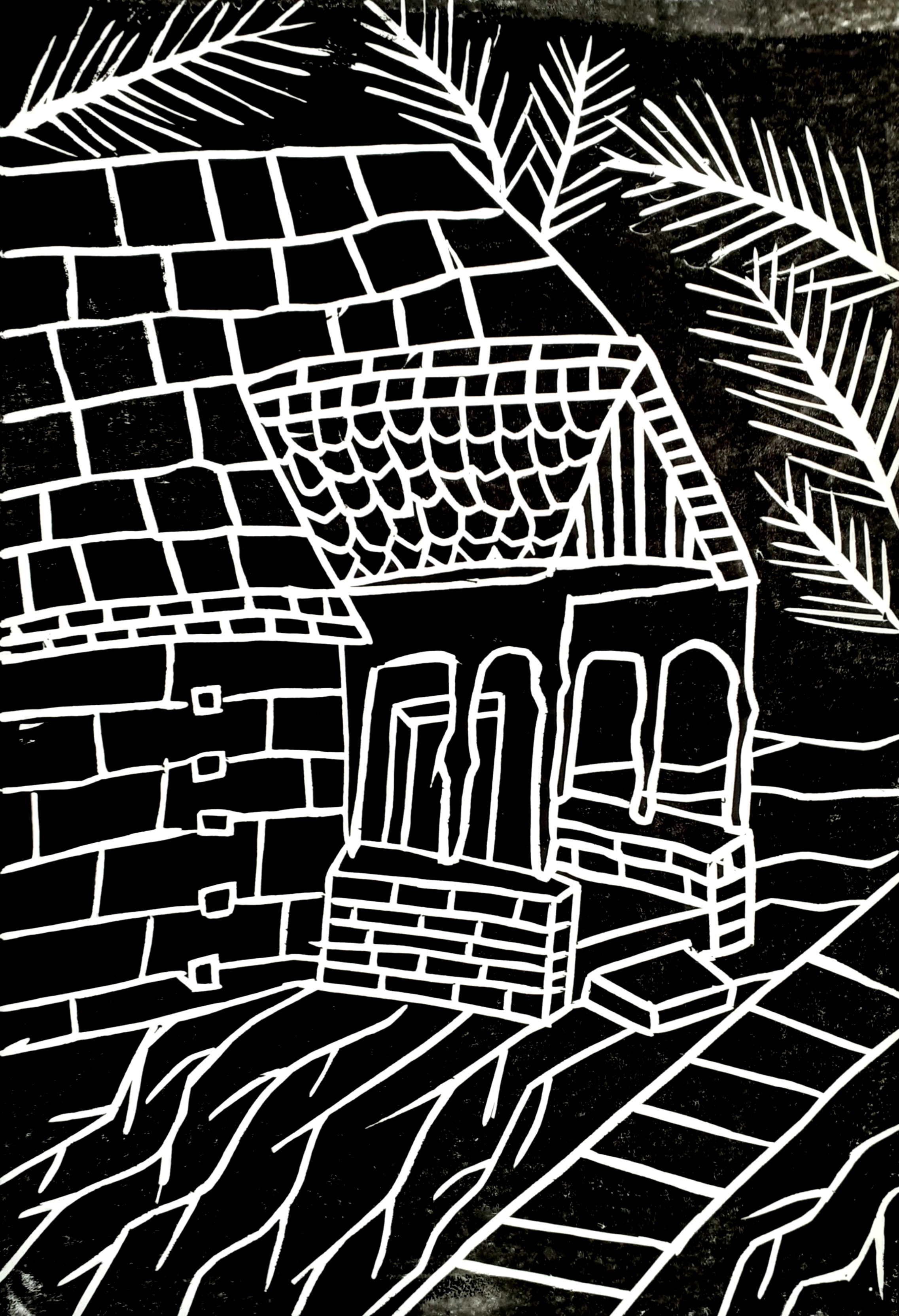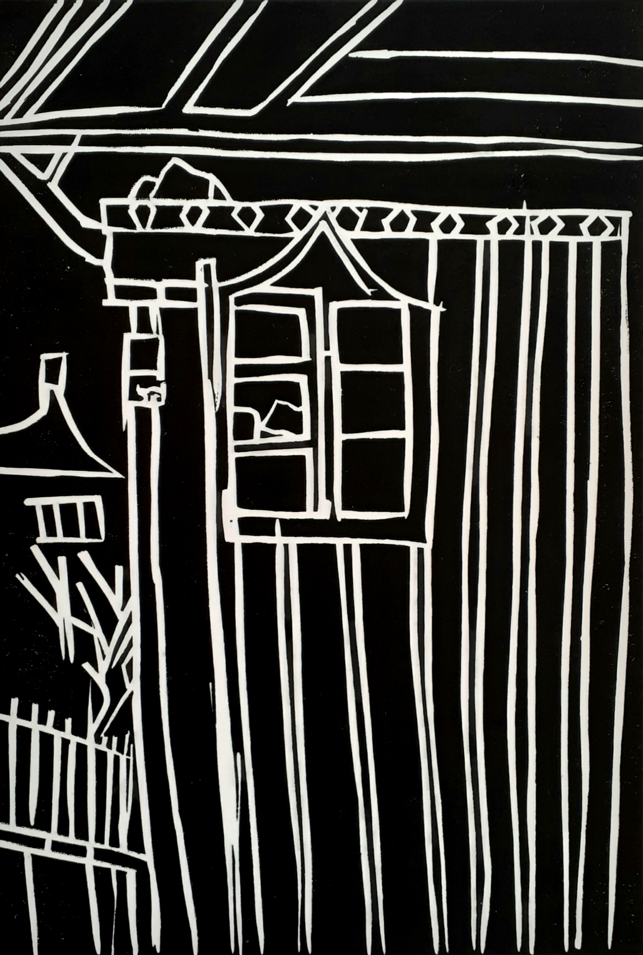 Pa ipak, kao i mnoge druge, kuća koju sam crtala za ovaj linorez izgledala je napušteno i bila je gotovo u potpunosti sakrivena granjem, raslinjem i trnjem.