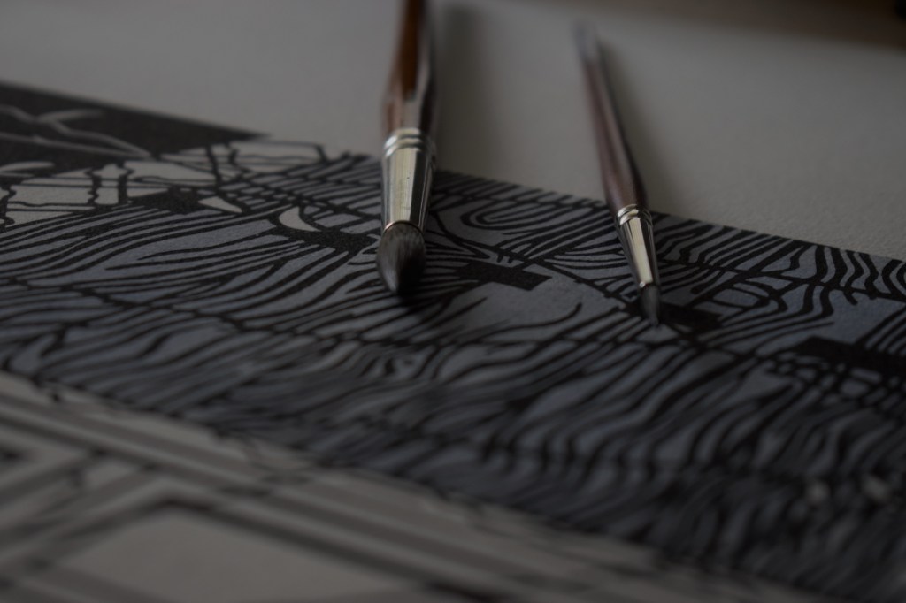 Nakon toga je, malim valjkom, na ploče nanesena boja za linorez- na bazi vode. Linorezići su otisnuti na maloj grafičkoj preši.