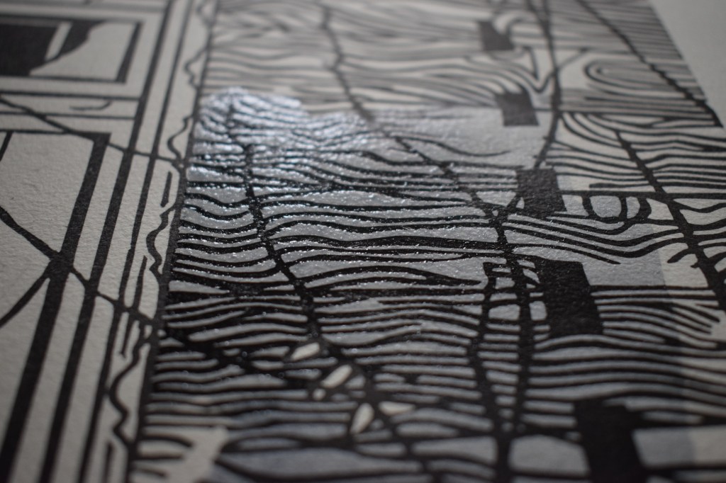 Dok sam ove izrezbarene detalje crtala na pripremnoj skici (a i kasnije dugotrajno dubila u ploči linoleuma), primijetila sam da, osim što raste moj interes za teksturu, očito raste i moj interes za ritam.
