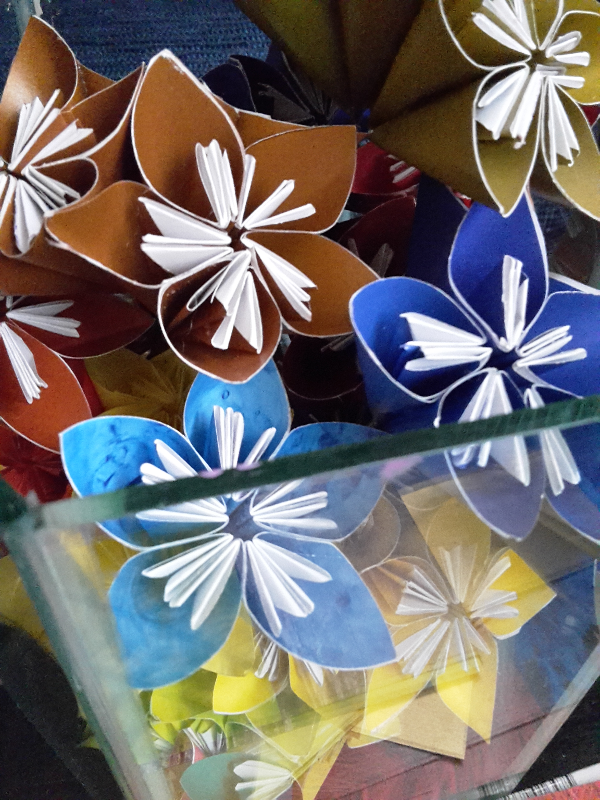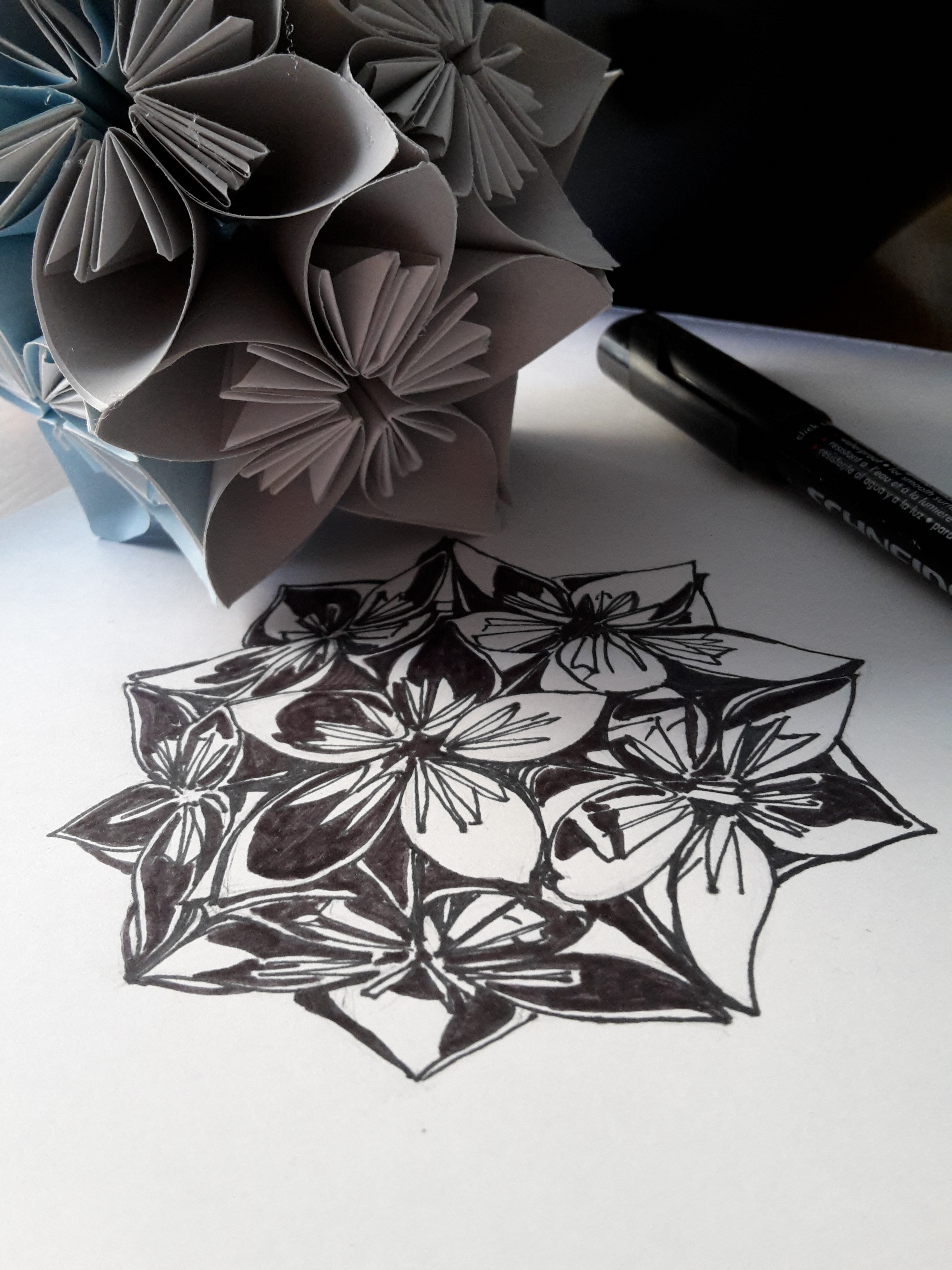 Te sam godine bila u izradi gomile kusudama ukrasa za školu. Očito se to pokazalo kao veliki vizualni utjecaj, jer sam nakon savijanja određenog broja elemenata, nacrtala crno-bijelu skicu.