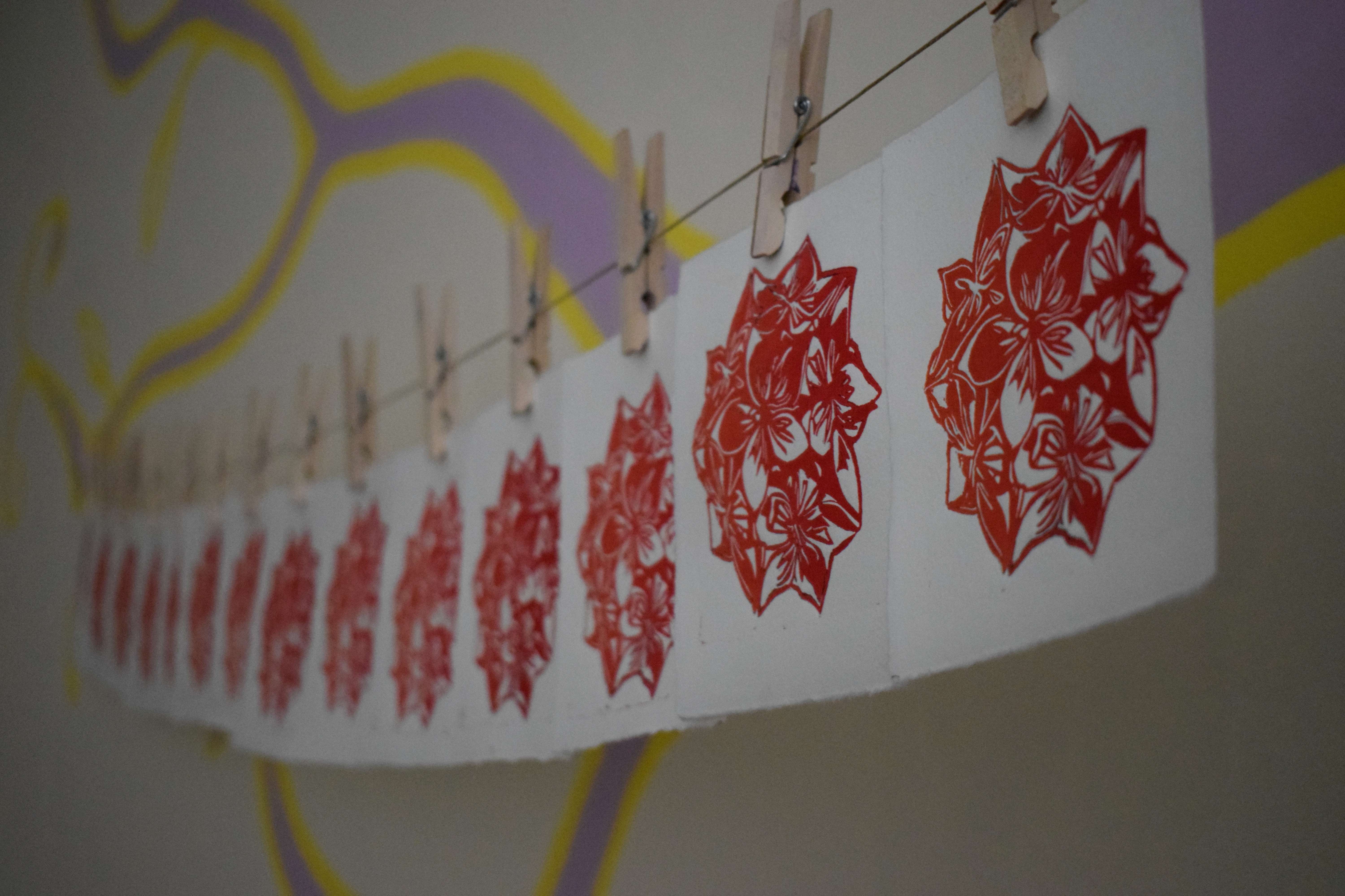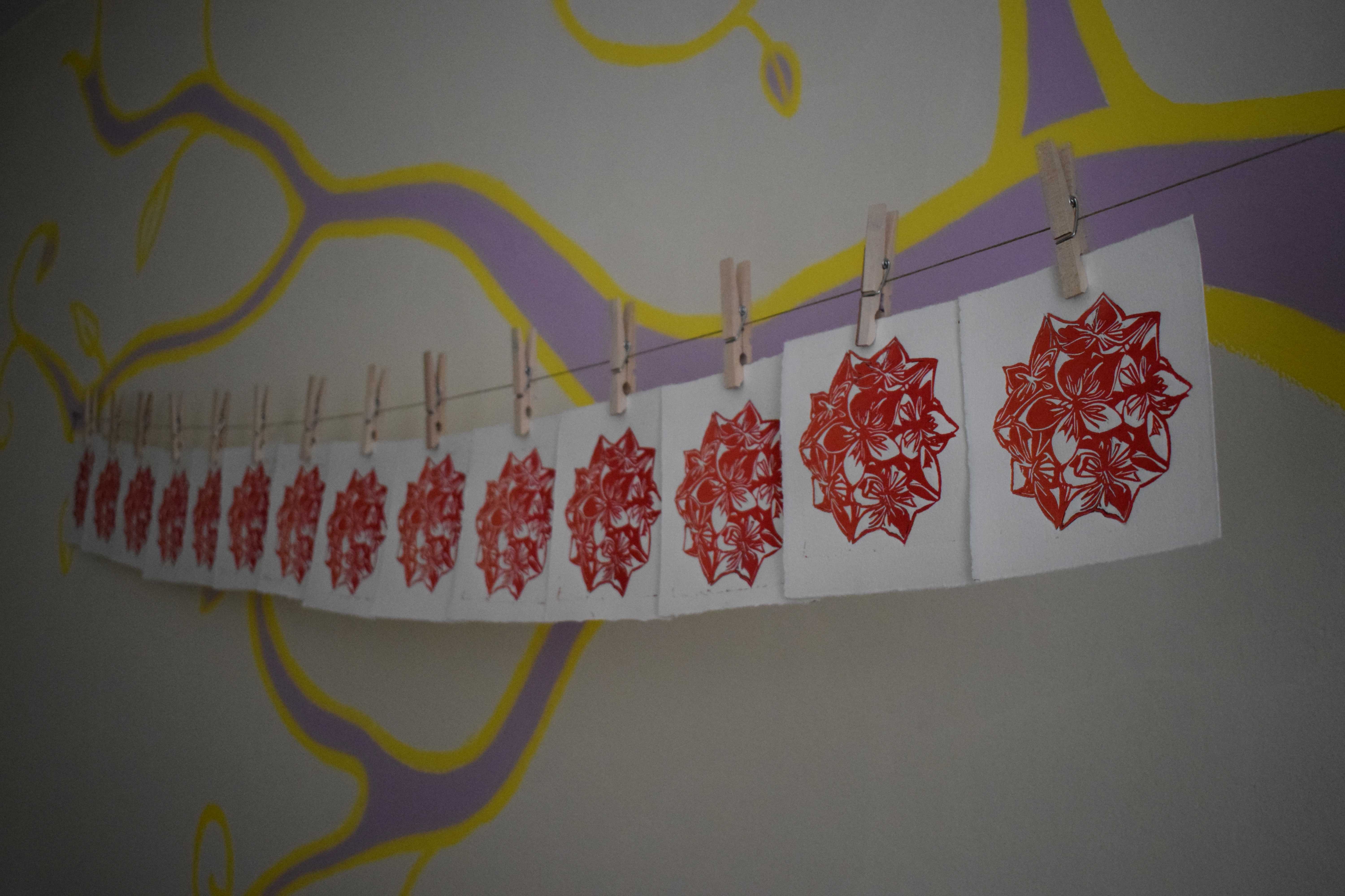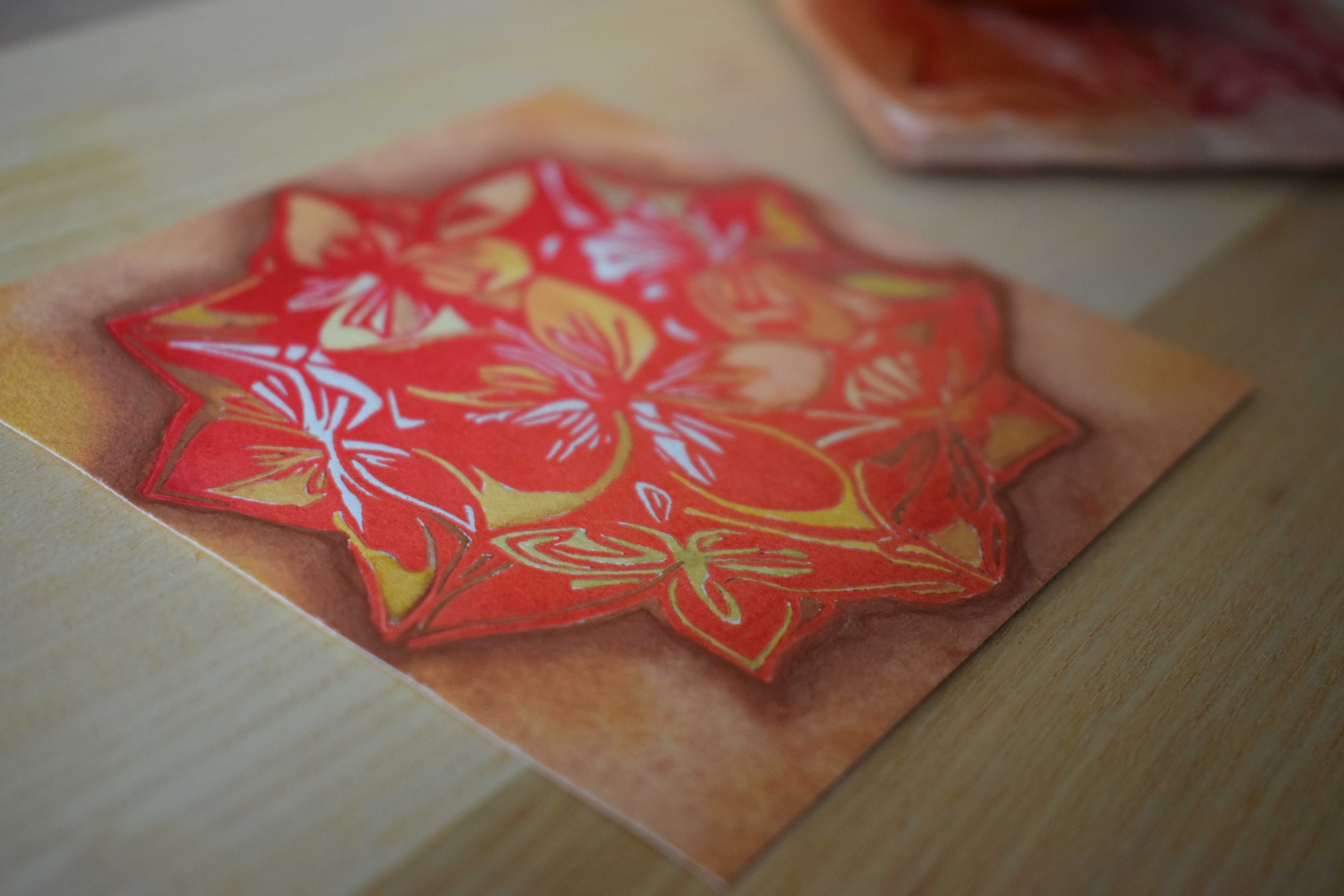 Ove sam ga zime, dakle, otisnula u crveno-narančastoj kombinaciji. Otiske sam objesila na sušenje u ateljeu.