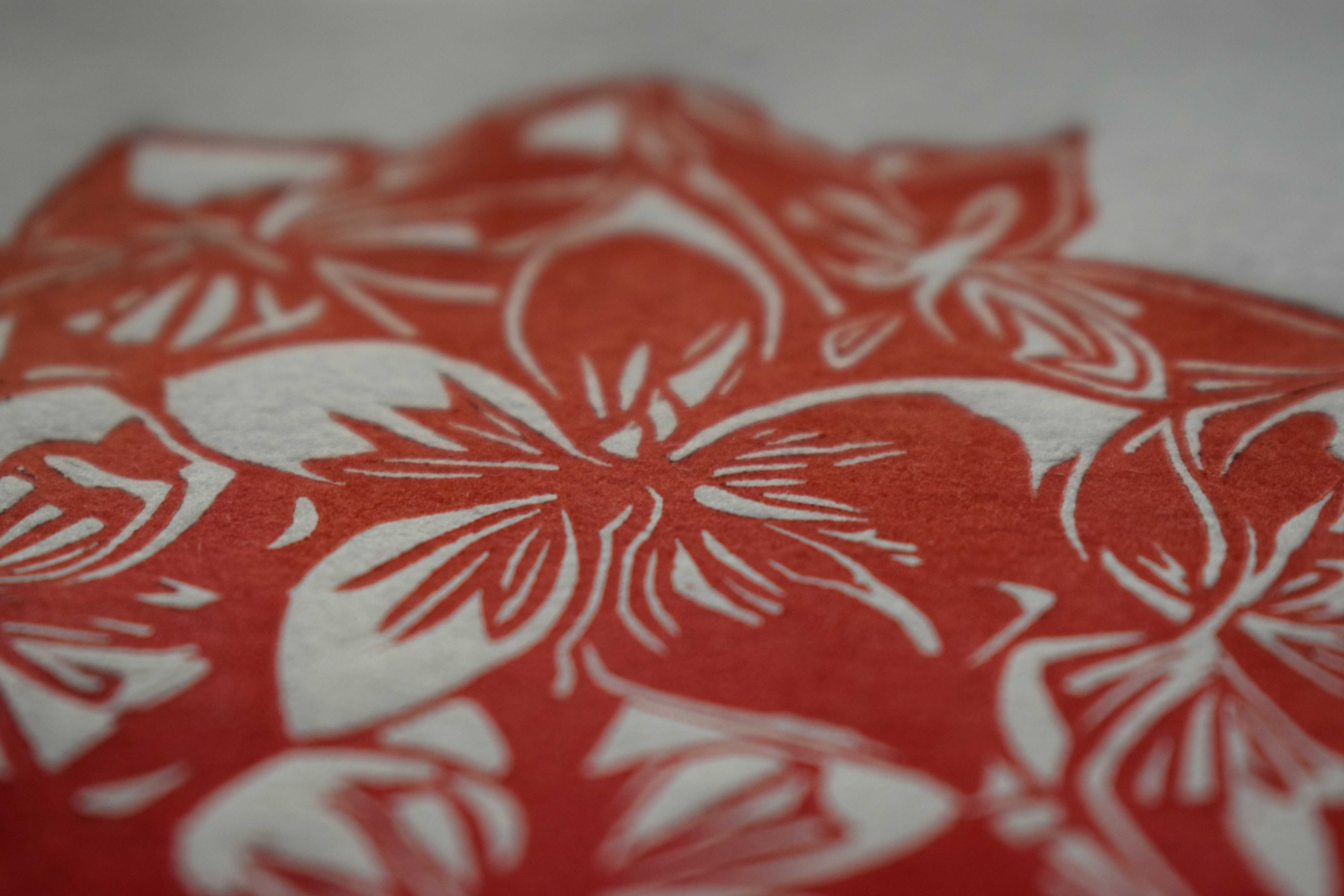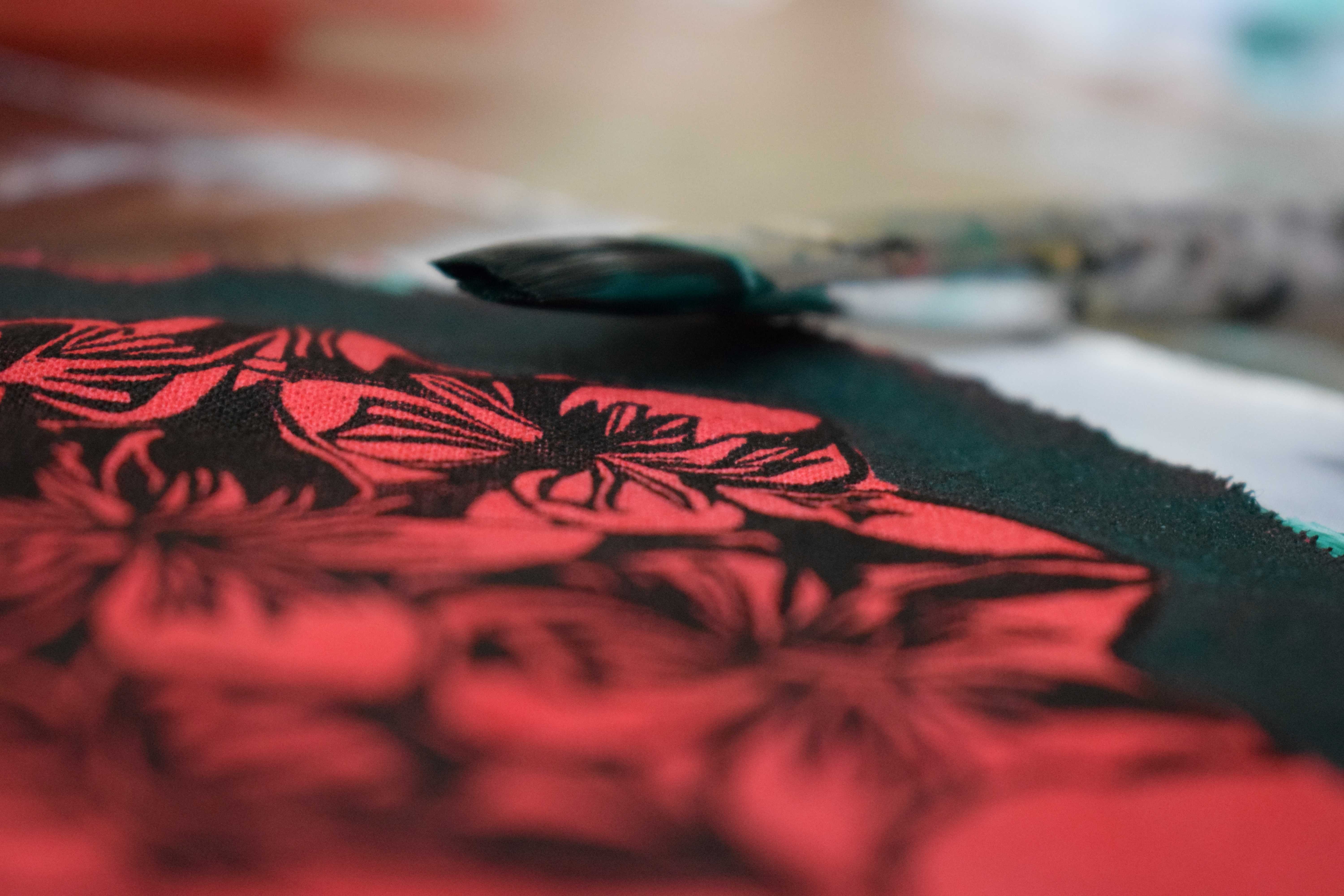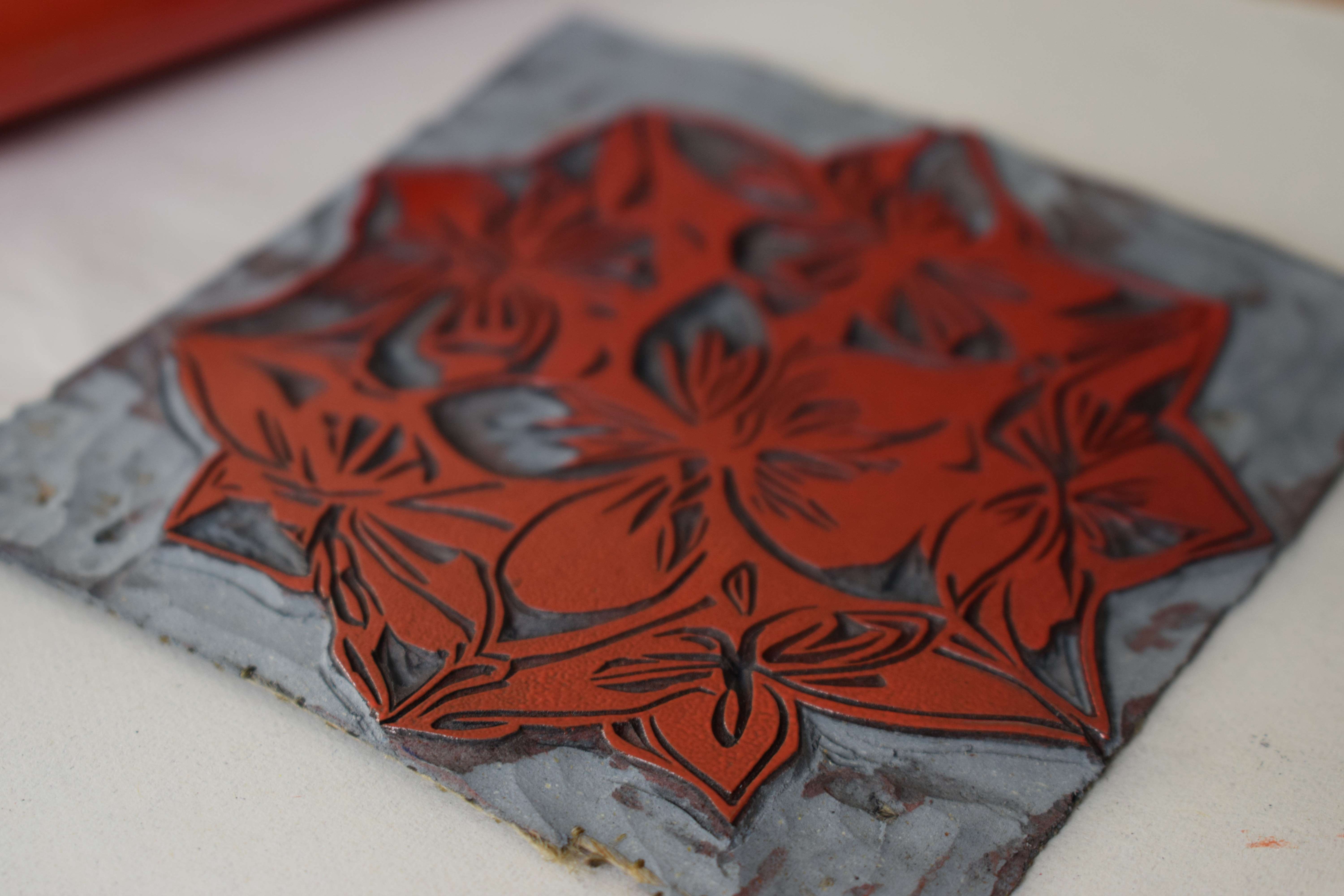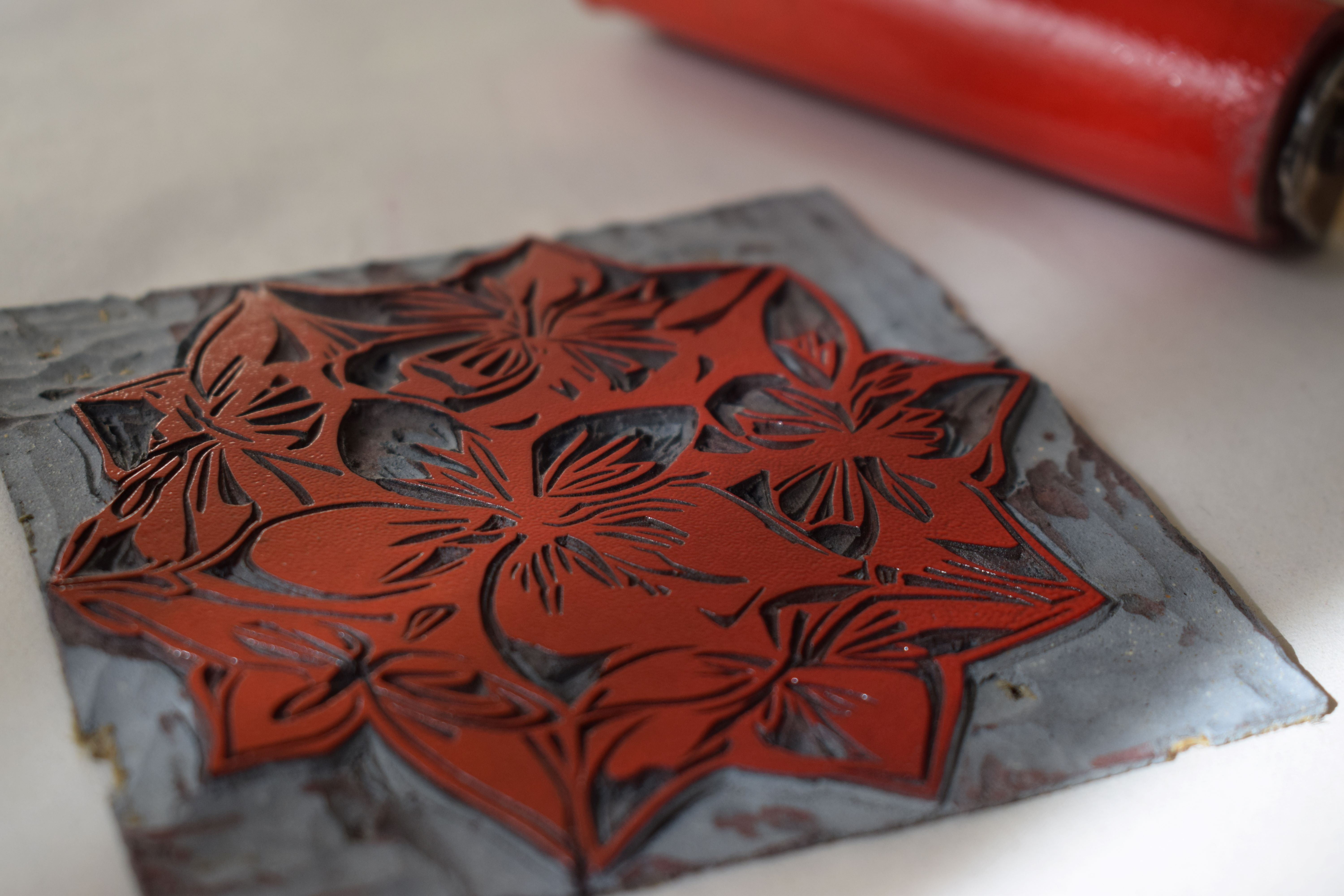 Kad sam se vratila svom kusudama linorezu, prešla sam na otiskivanjeploče na tekstil koji sam prethodno obojala crveno.
