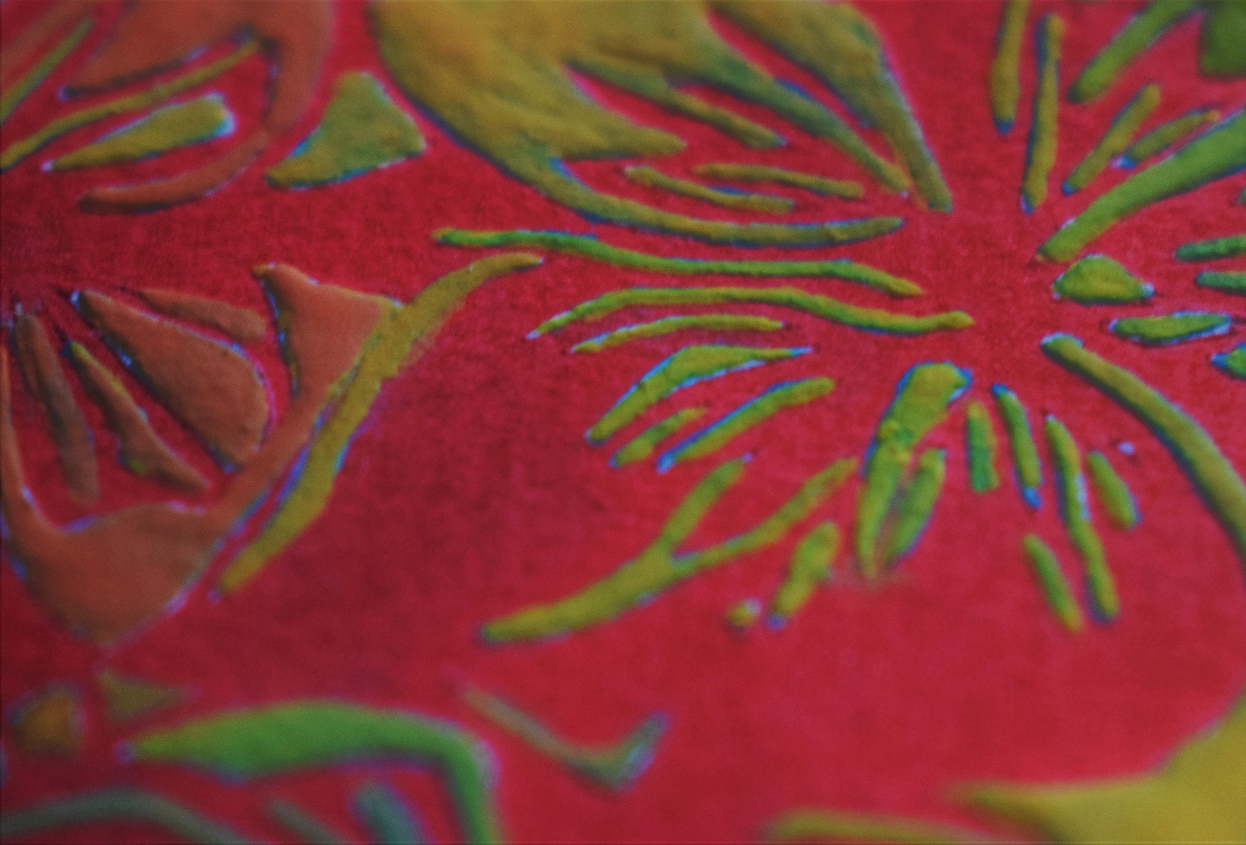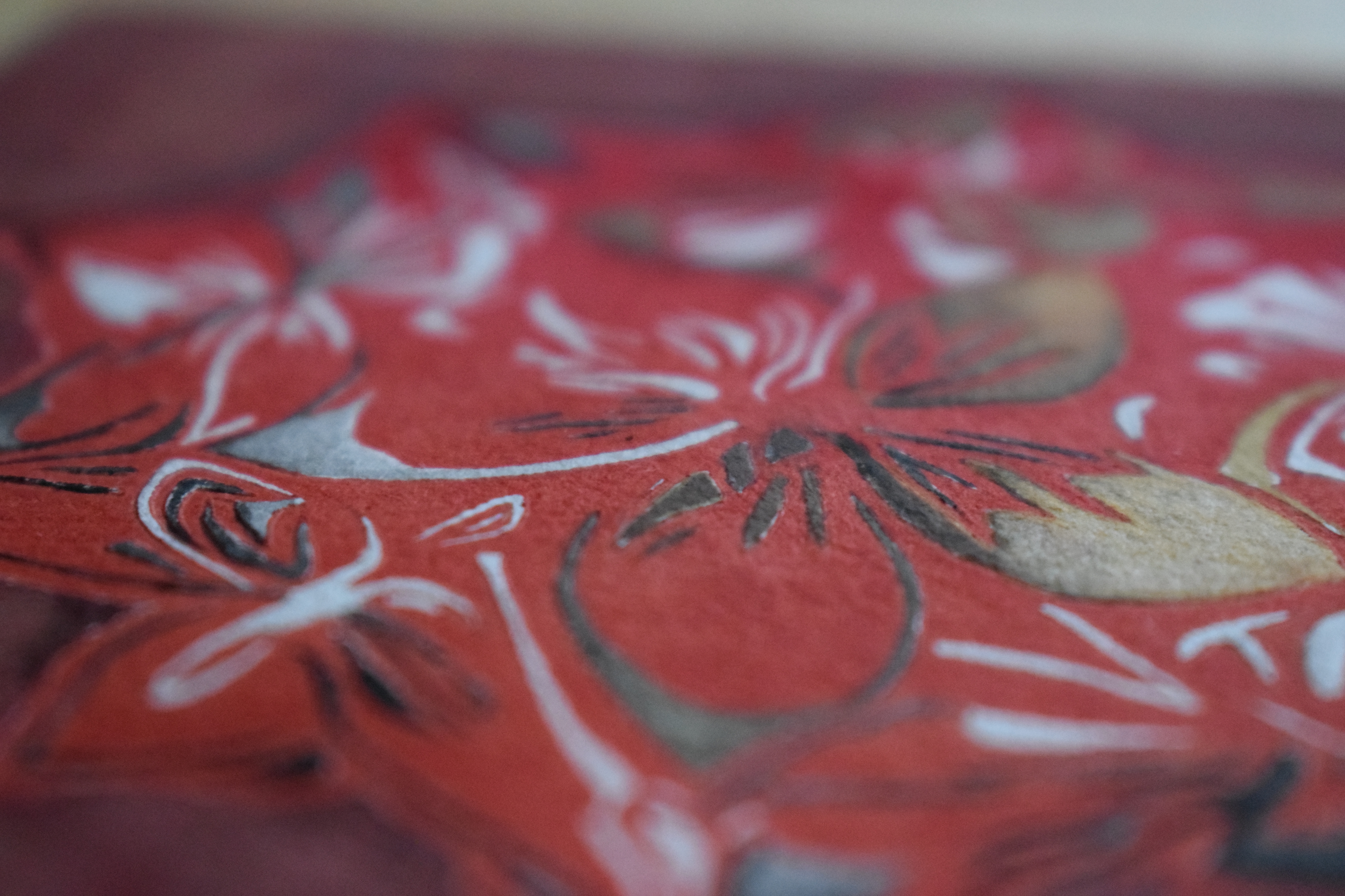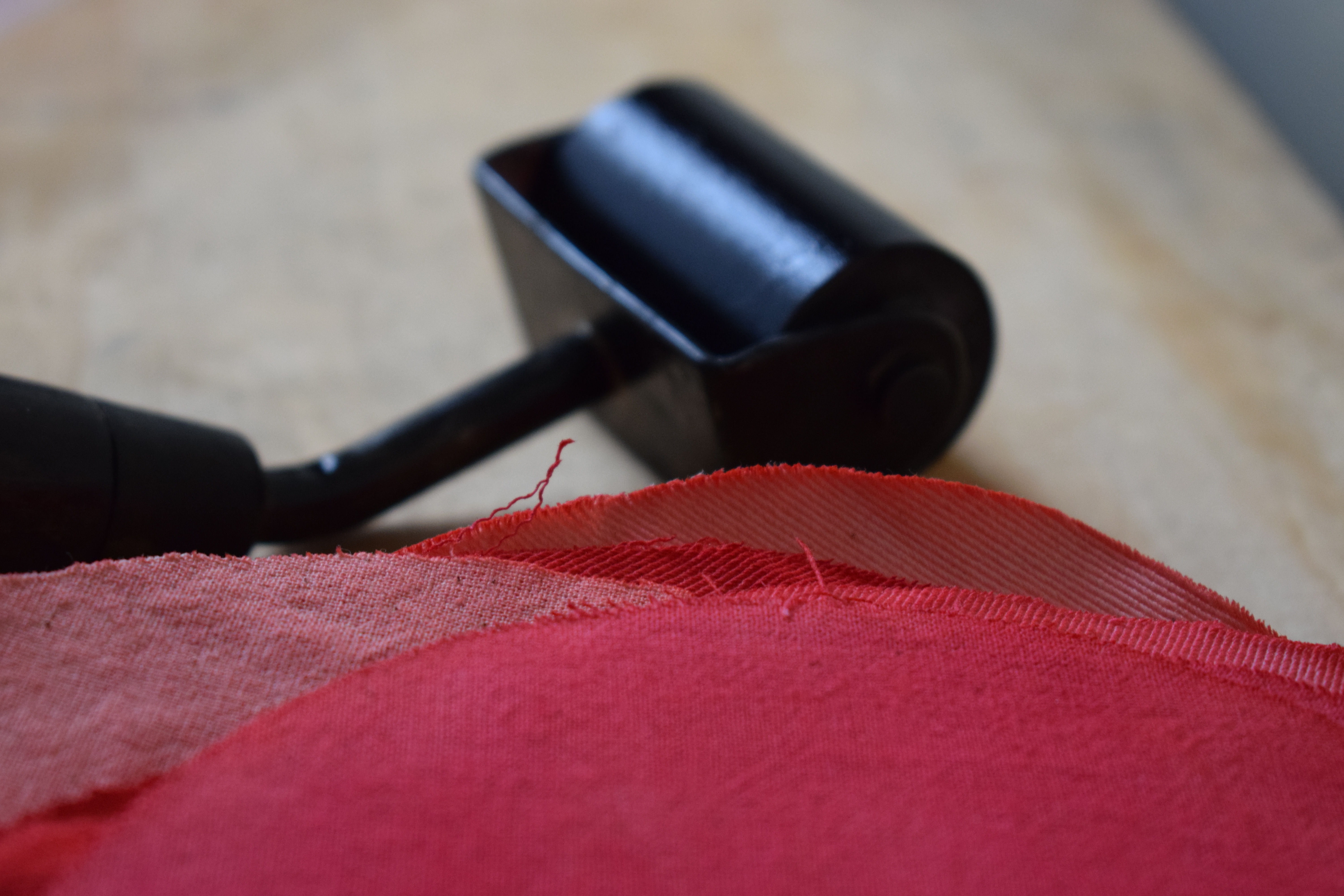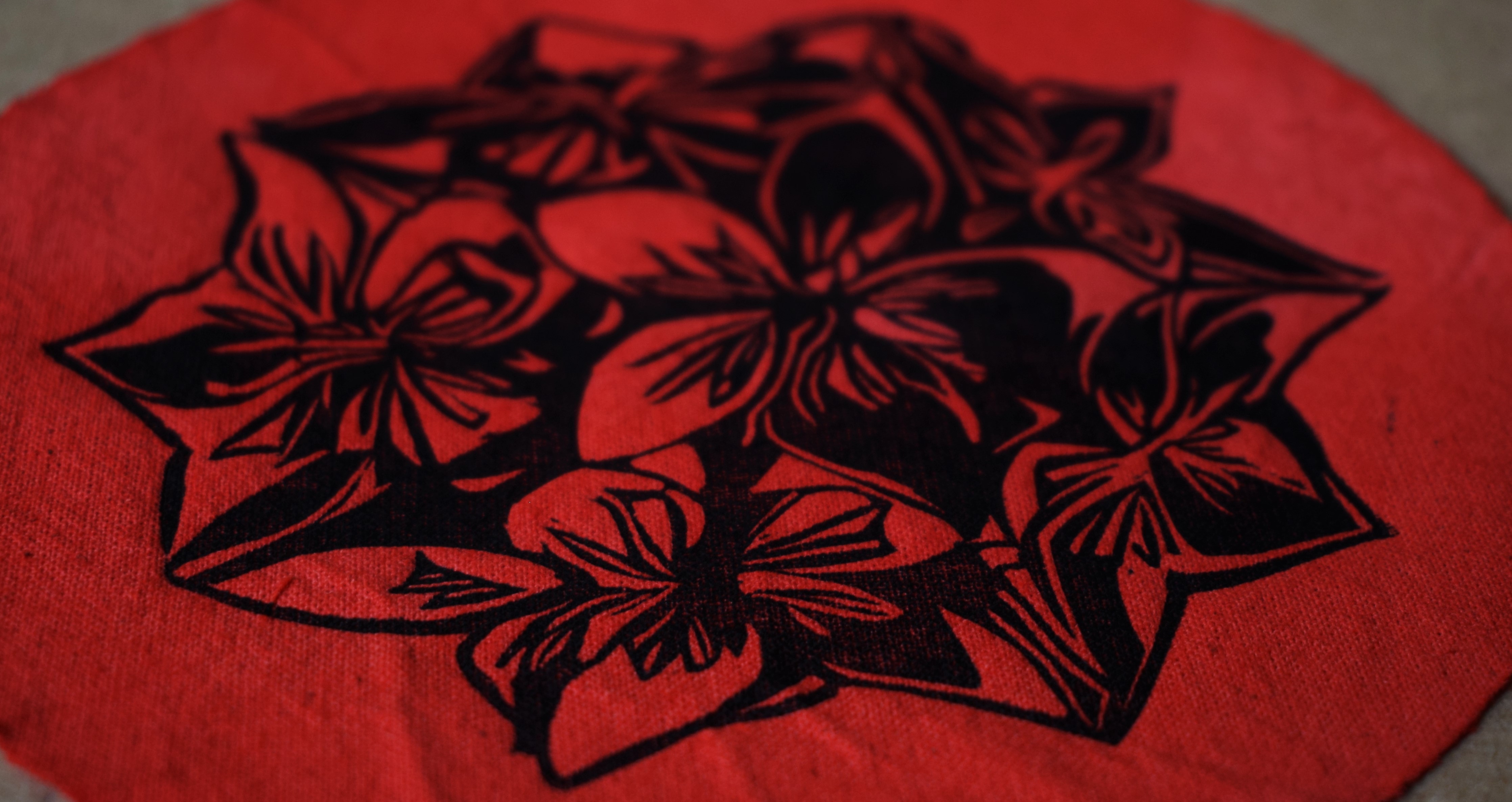 Kad sam se vratila svom kusudama linorezu, prešla sam na otiskivanjeploče na tekstil koji sam prethodno obojala crveno.