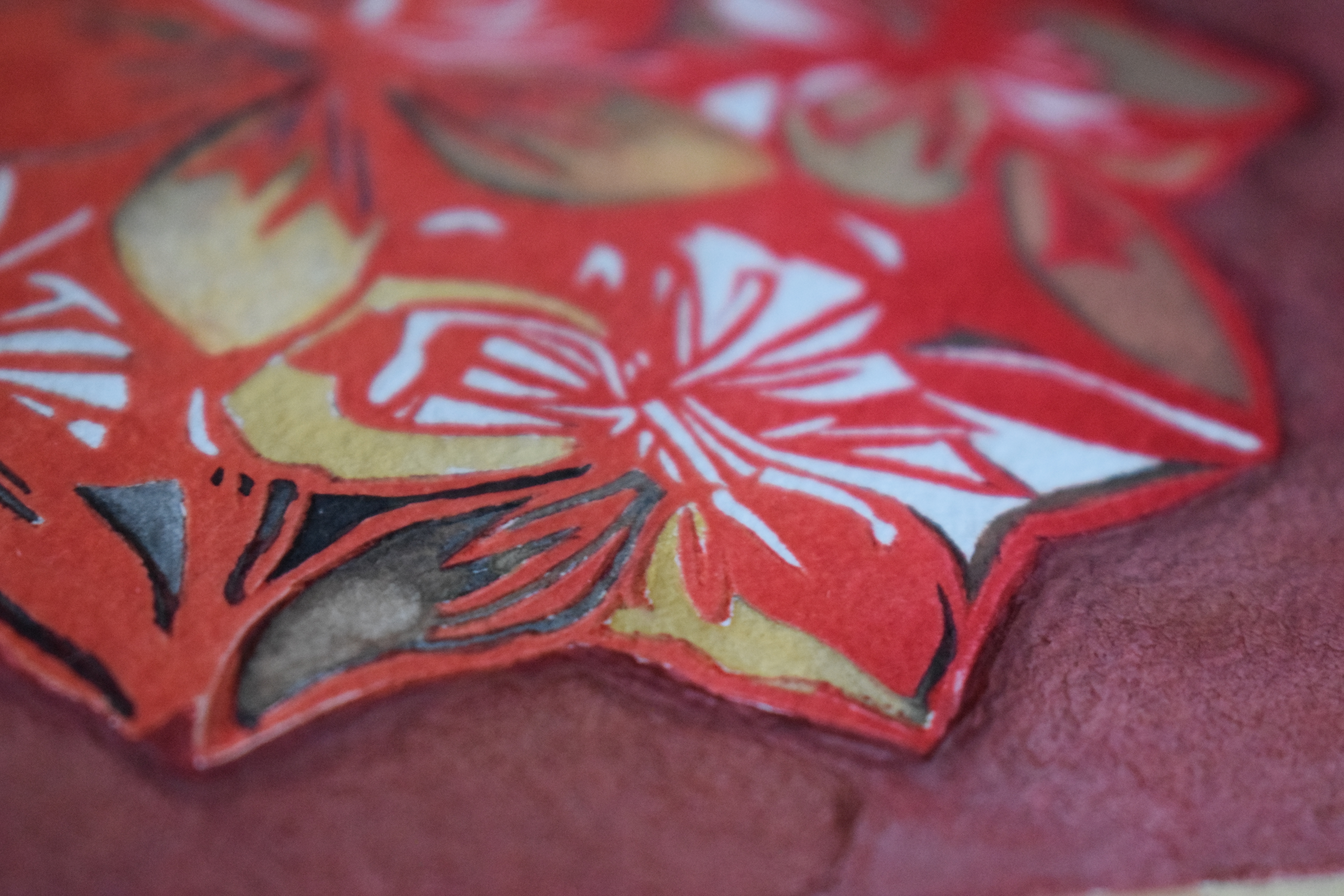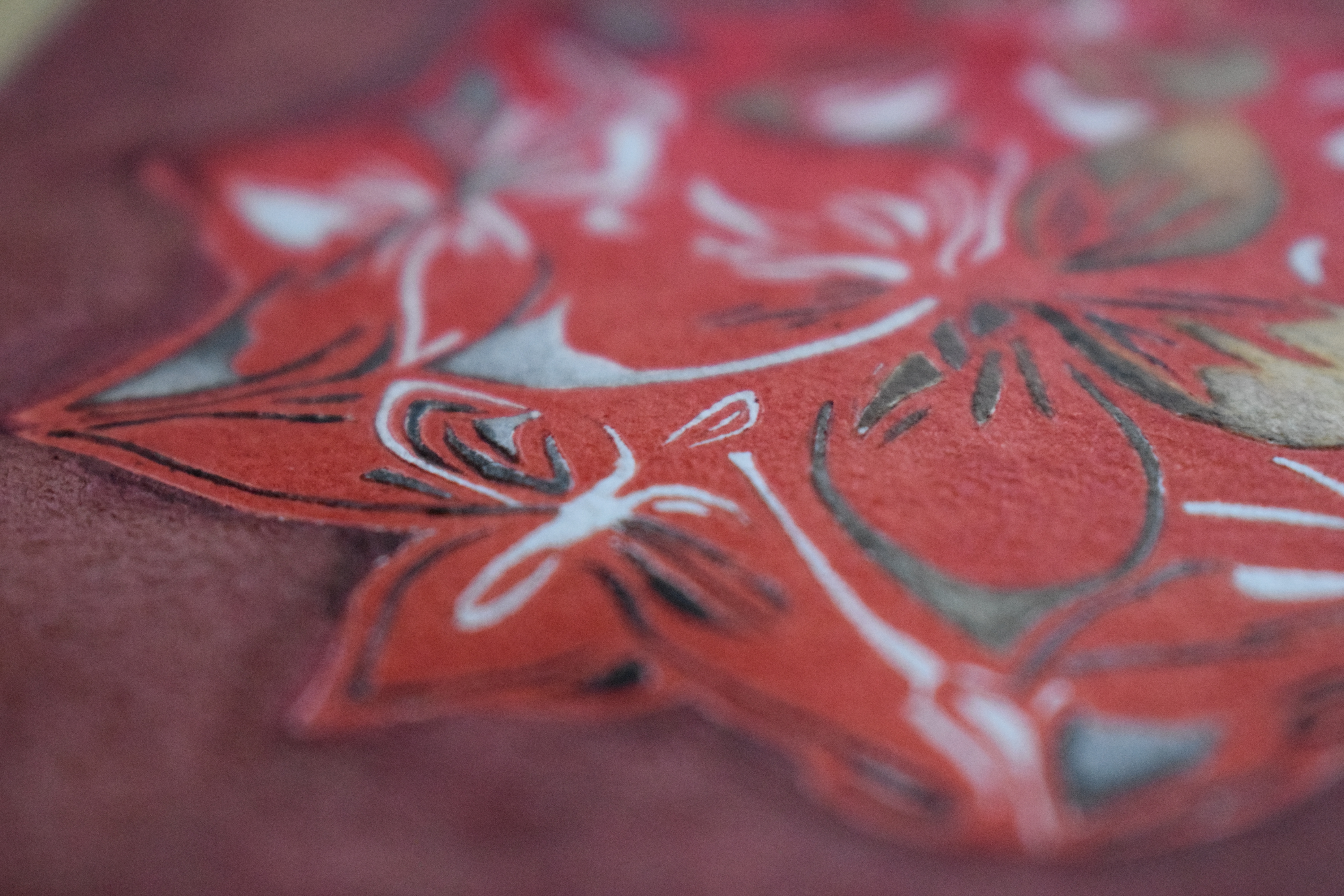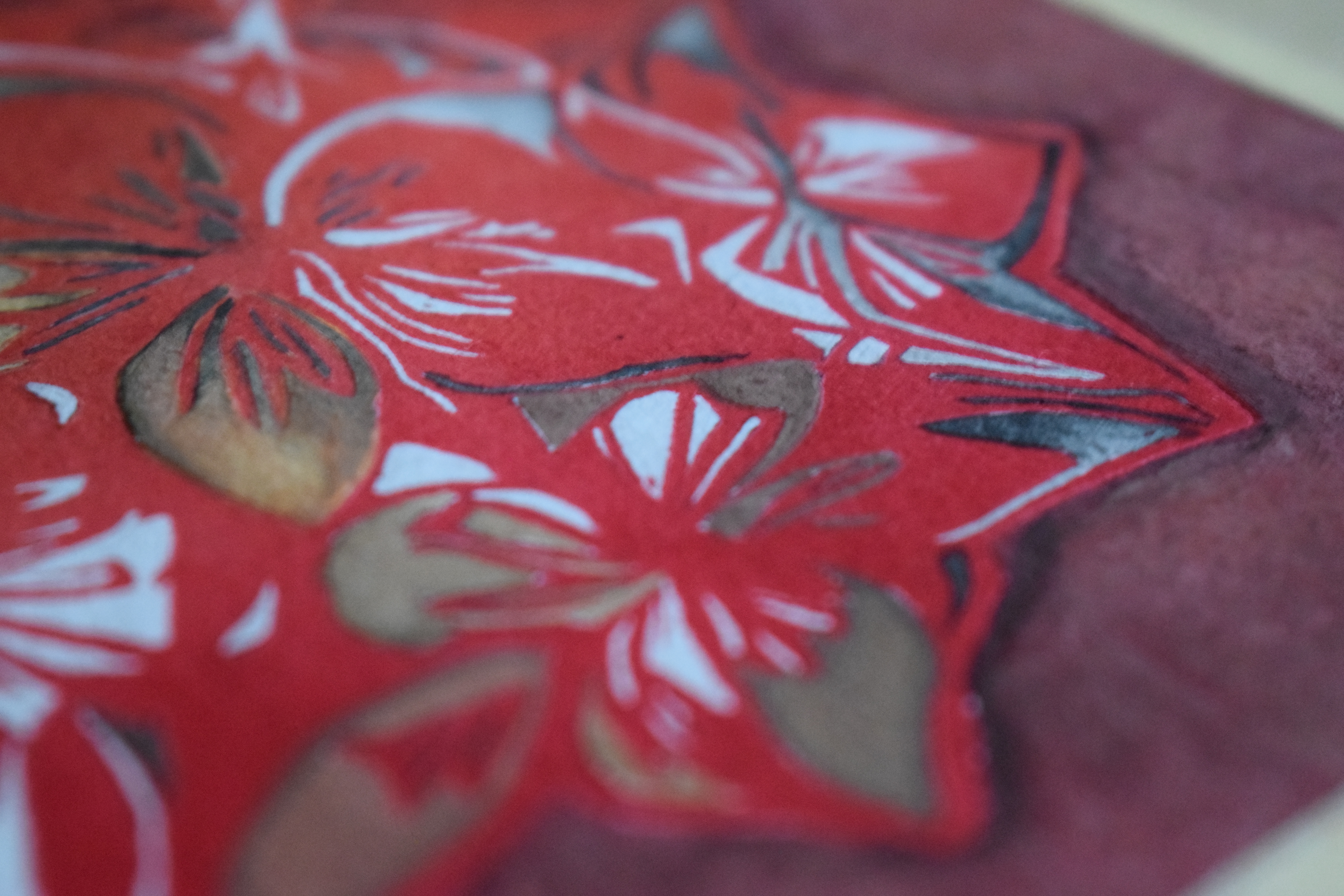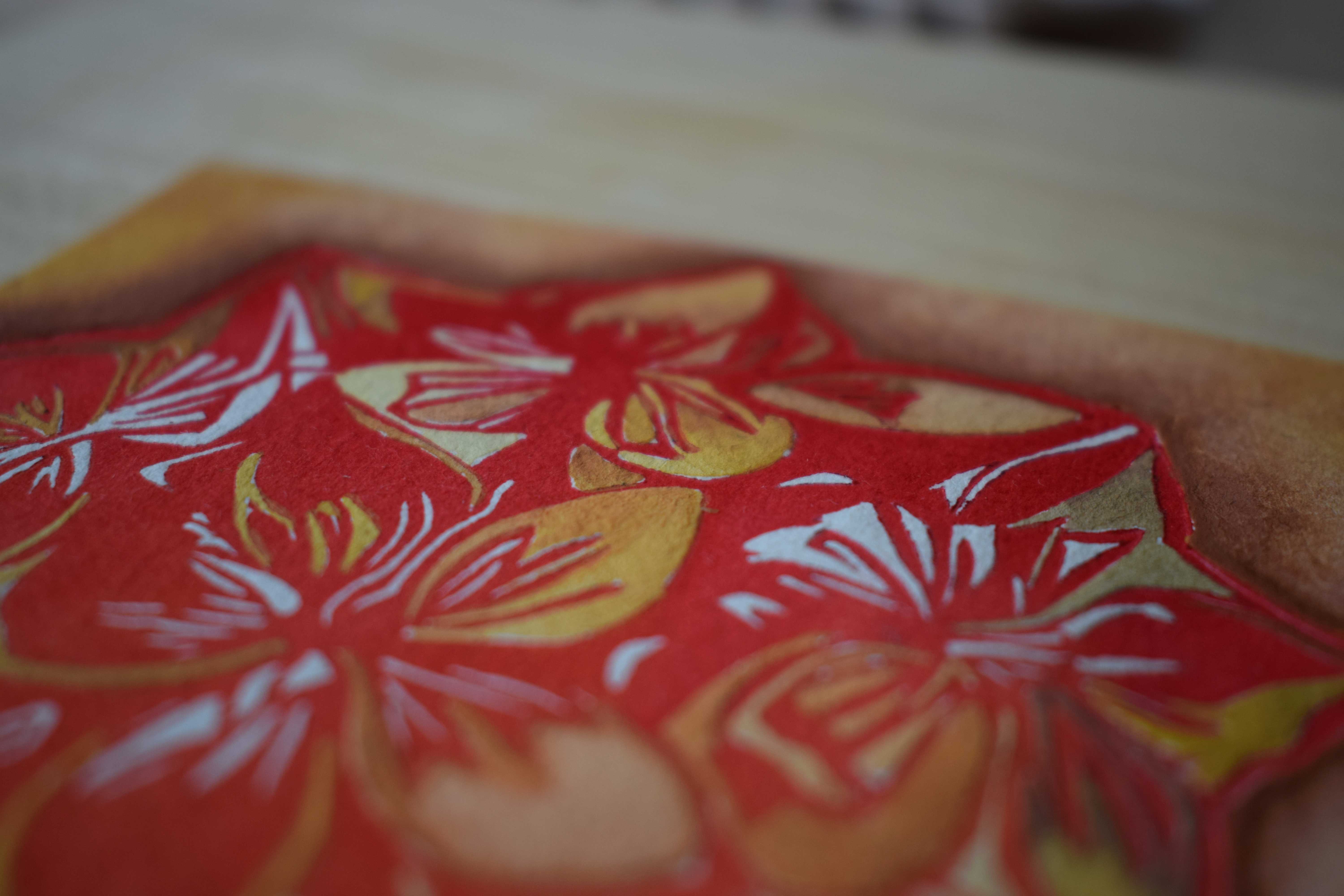Čitavo mi je ljeto bilo u znaku koloriranja otisaka. I jesen se nastavila u istom tonu. Možda je bolje reći, u istom stilu. Jer su tonovi, kojima sam kolorirala otiske, postali jesenski. I moj odabir kombinacija boja često je bio rezultat uočavanja promjena na jesenskom lišću. Tako je i ovaj zamućeni crveni list (u prvom planu fotografije) poslužio kao inspiracija za koloriranje puno manjih listića na linorezu.