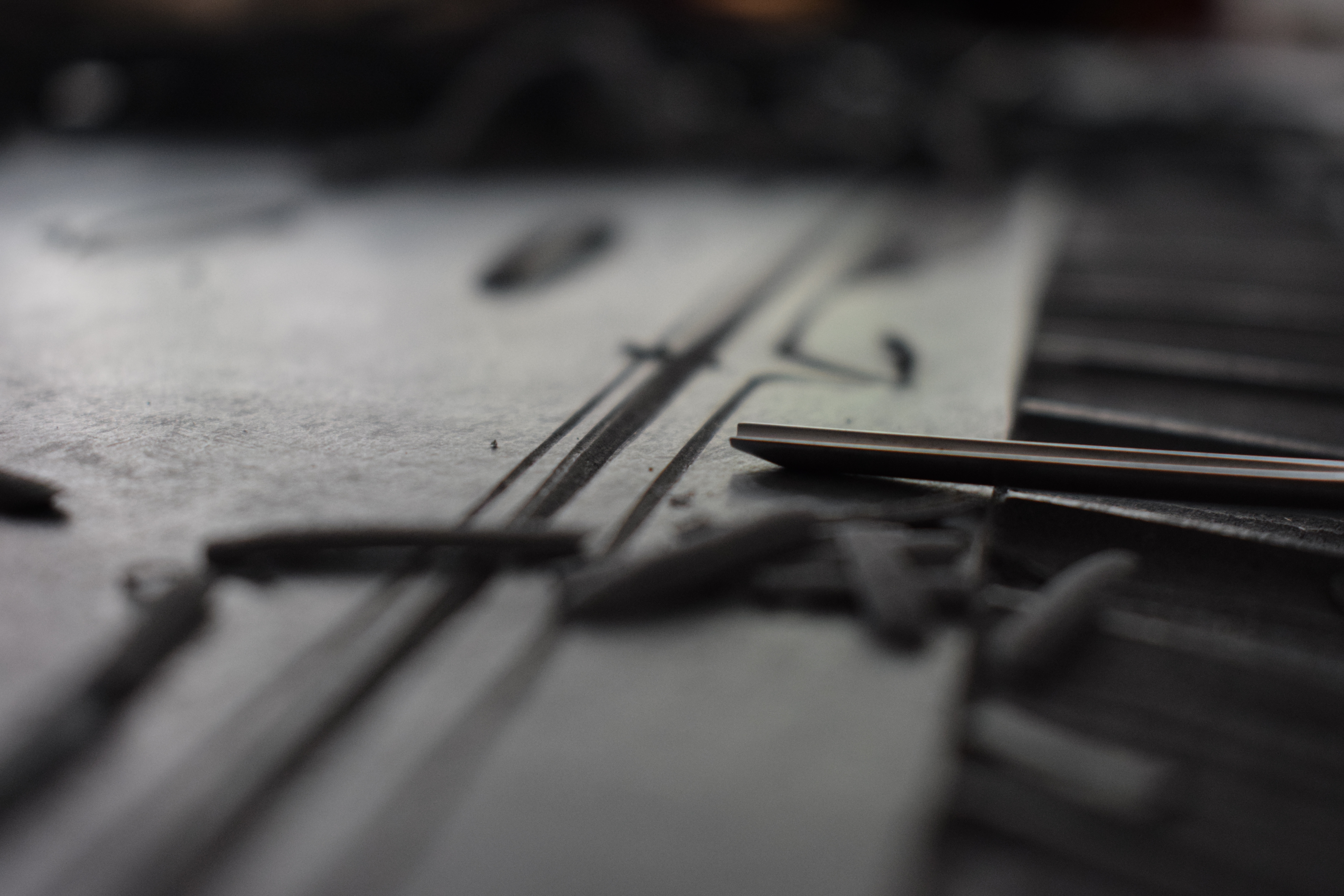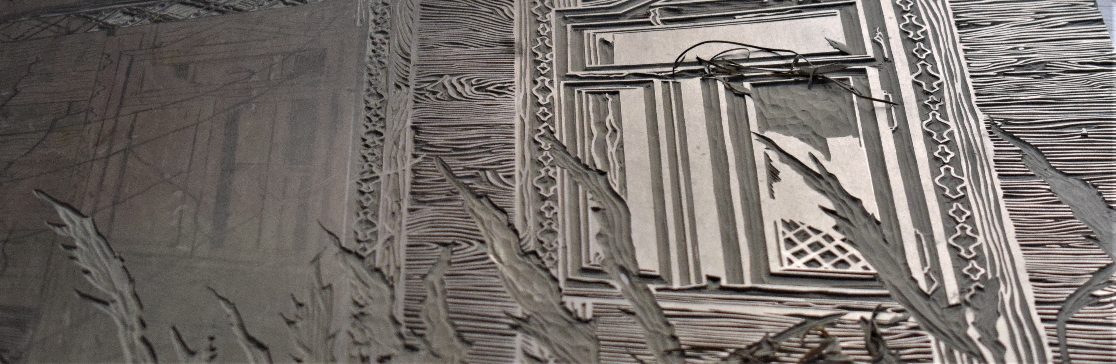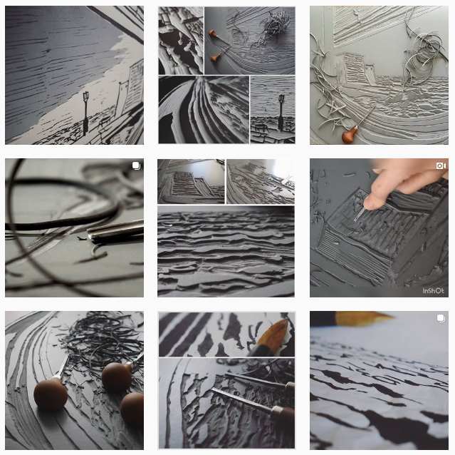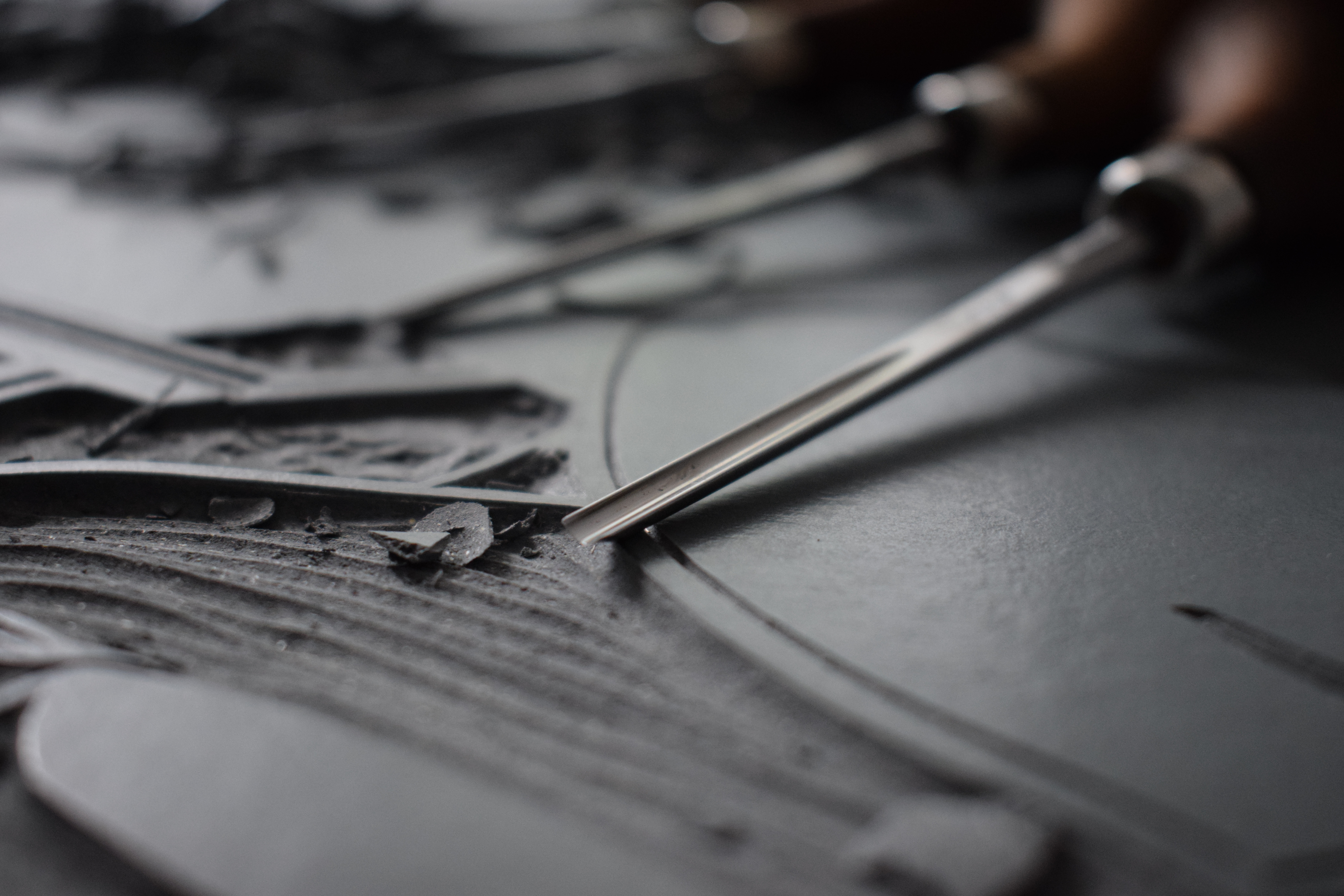Fotografija gore prikazuje dio procesa dubljenja ploče za novi linorez. Ovog je puta kao grad-inspiracija poslužila Venecija. Nadrealna, Venecija je prepuna palača i muzeja do kojih stižeš prelazeći vodene kanale umjesto cesta. Doduše, prepuna je i turističkih gužvi kojima sam i ja pridonijela u par navrata. Jedan od njih bio je 2001., kad smo se utrpali u prijateljičin Fiat Uno. Mislili smo kako je baš dobra ideja provesti dvadeset i četiri sata u vožnji do Venecije i natrag. Išli smo vidjeti 49. Venecijanski bijenale i jedva izdržali put.