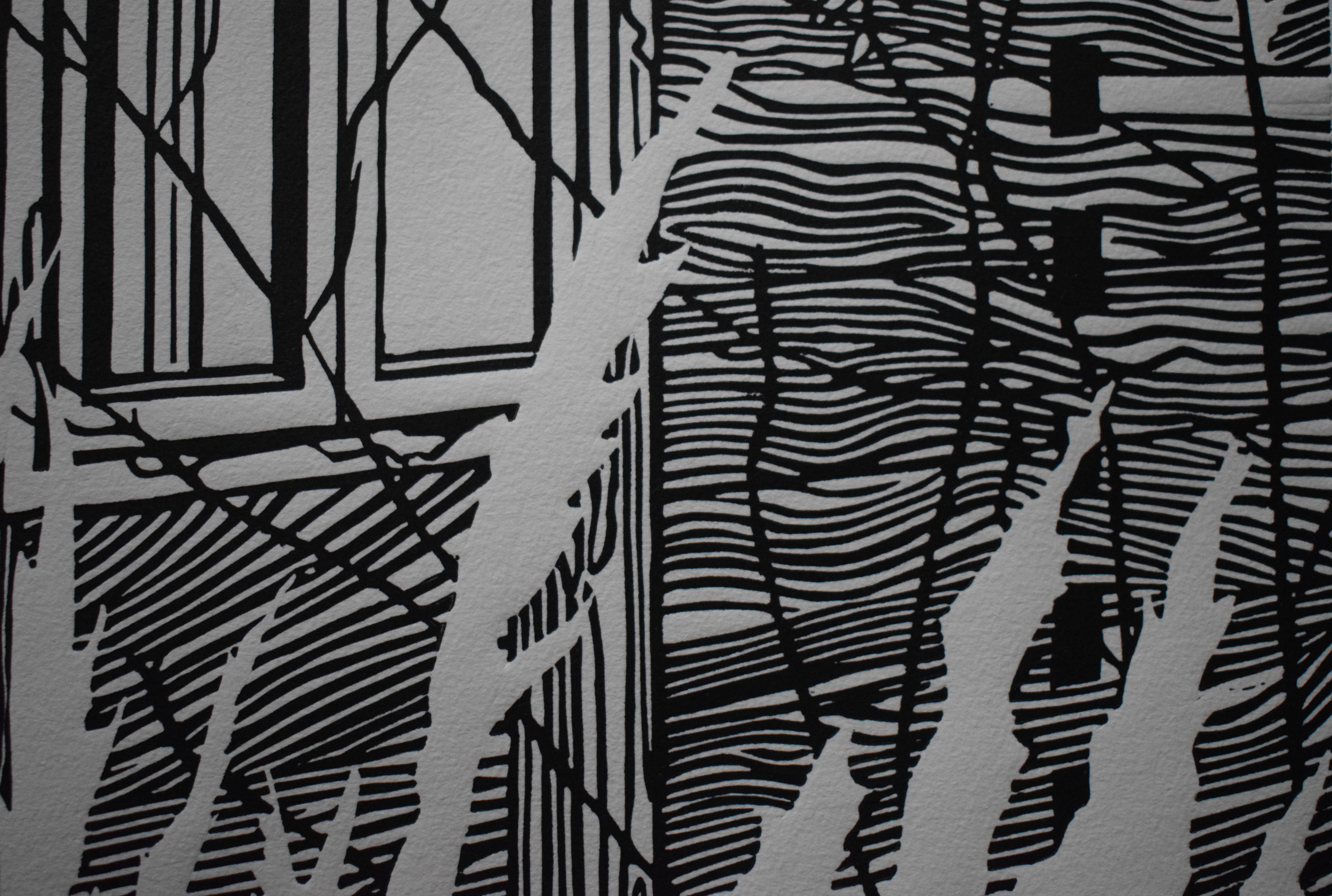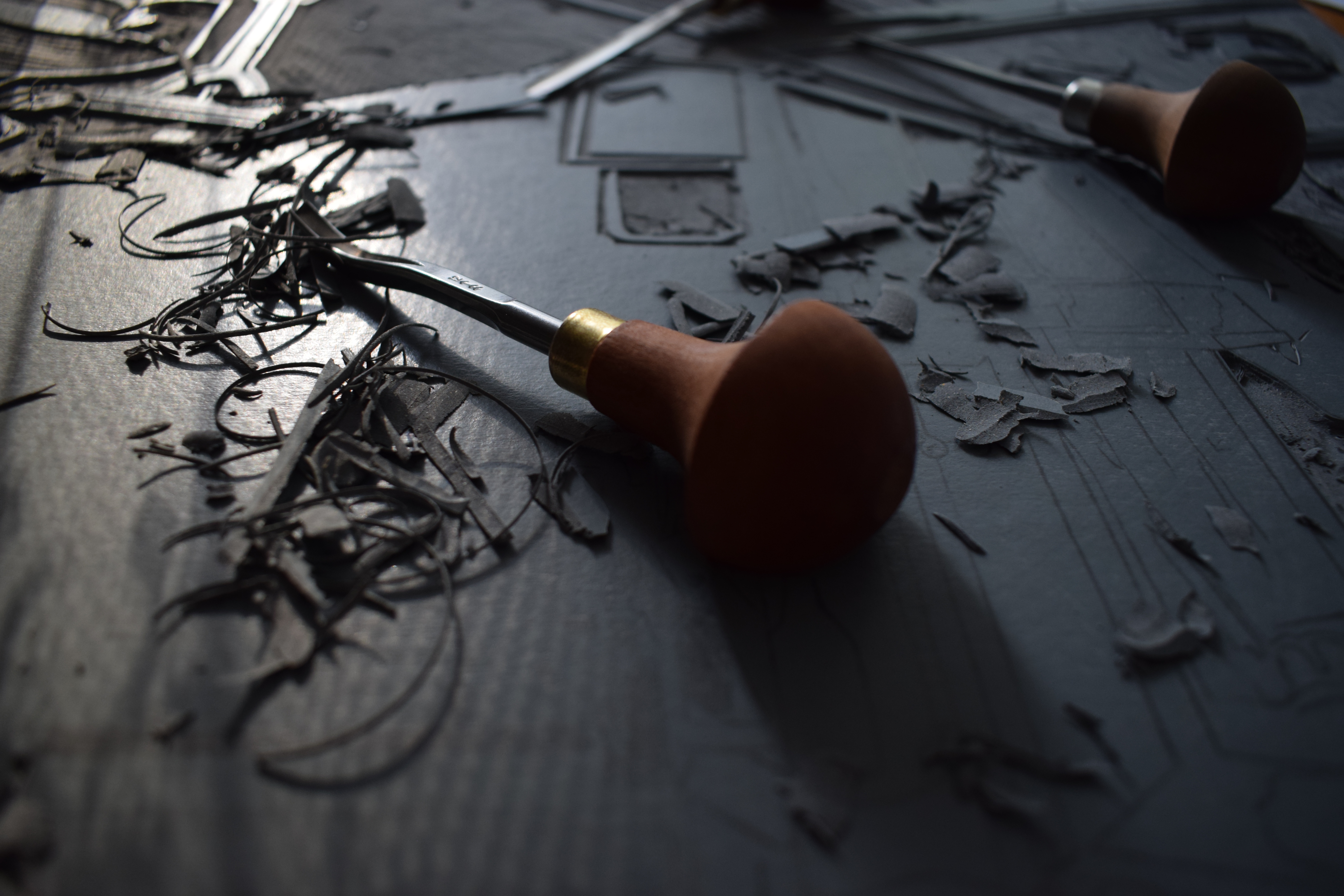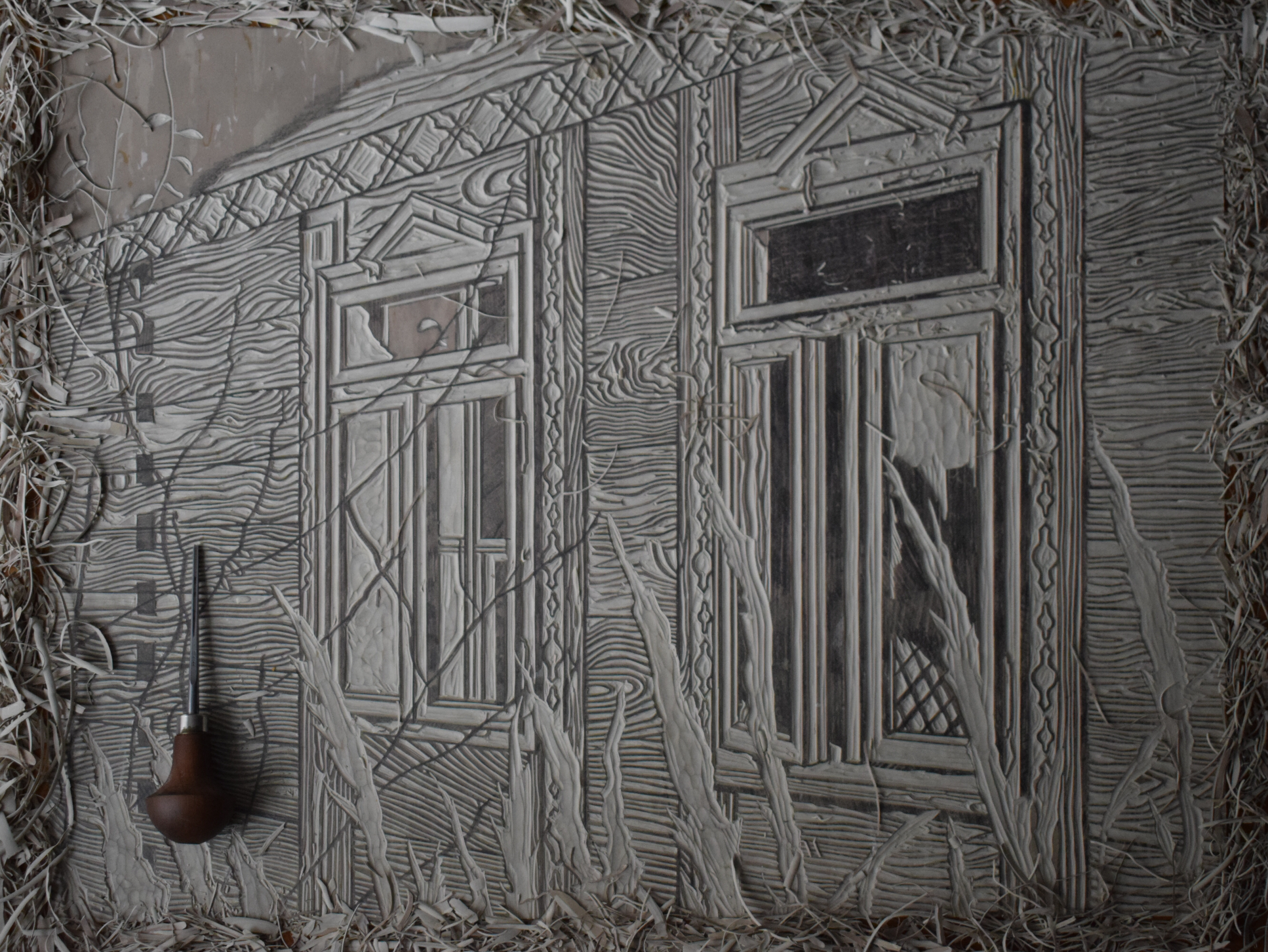 Veće dijelove prozora, one koji u otisku trebaju ostati bijeli, dubila sam širim nožićem. Interesantno je dubiti bjeline jer su to dijelovi ploče koji omogućavaju duži i širi potez. Taj dio posla mi ne zahtjeva toliku koncentraciju (niti količinu svjetla) pa je prikladan za rad po noći. Uz to, noću te duge vijuge linoleuma koje se vade, proizvode i zanimljive sjene. To djeluje čudesno smirujuće i terapijski, što uvijek dobro dođe. A pogotovo ovih dana.
