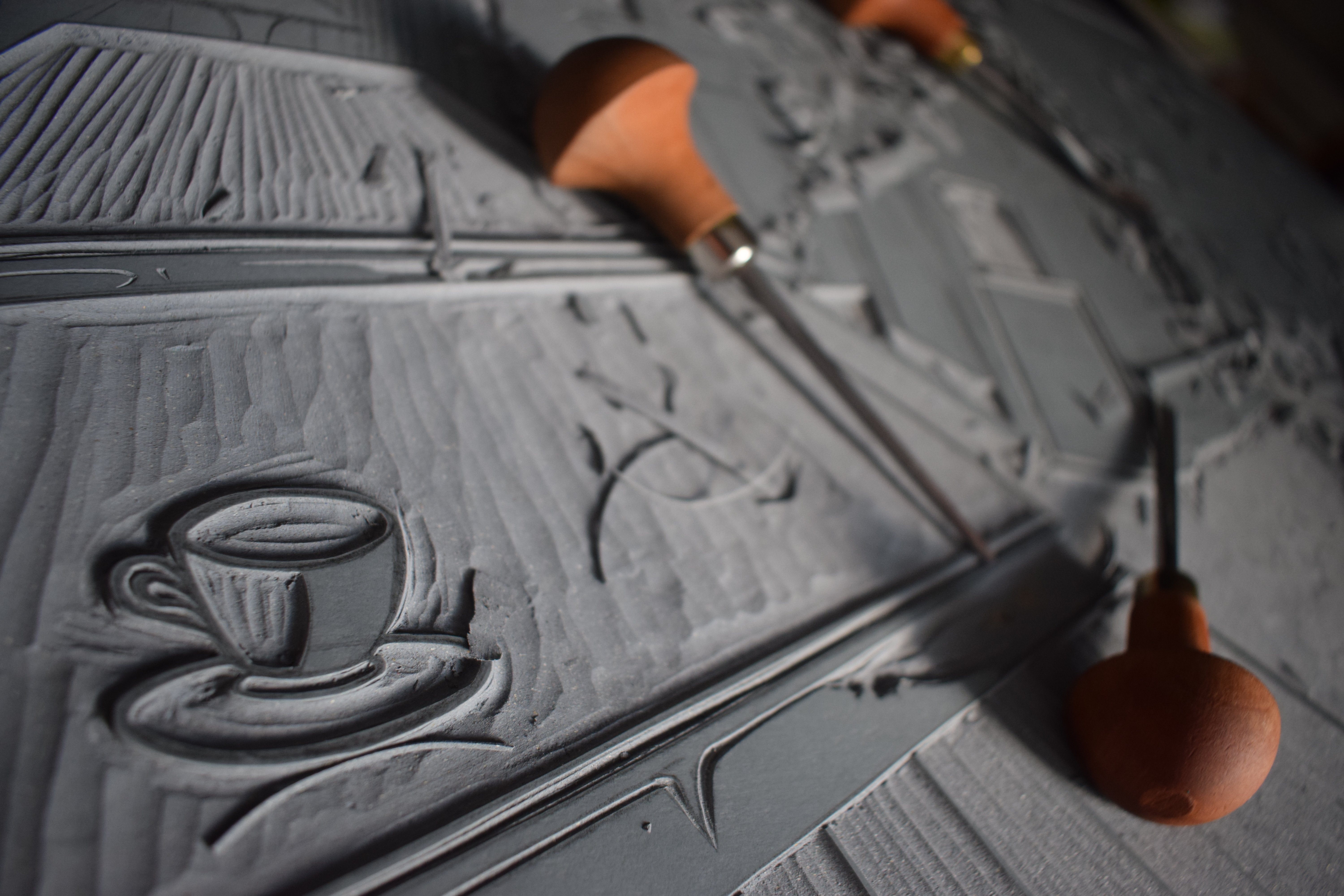 U ovom sam si radu ponovo priuštila igranje sa linorezačkom tipografijom. Dubljenje slova u linoleumu često može biti nezgodno, ali nekako mu se često vraćam. Tekst sam na ploči za dnevnu ponudu jela izdubila naopako (zrcalno), kako bi u otisku slova bila okrenuta na pravu stranu. Naziv se na skici nalazi s vanjske strane café-a, pa u otisku treba izgledati naopako, odnosno zrcalno.