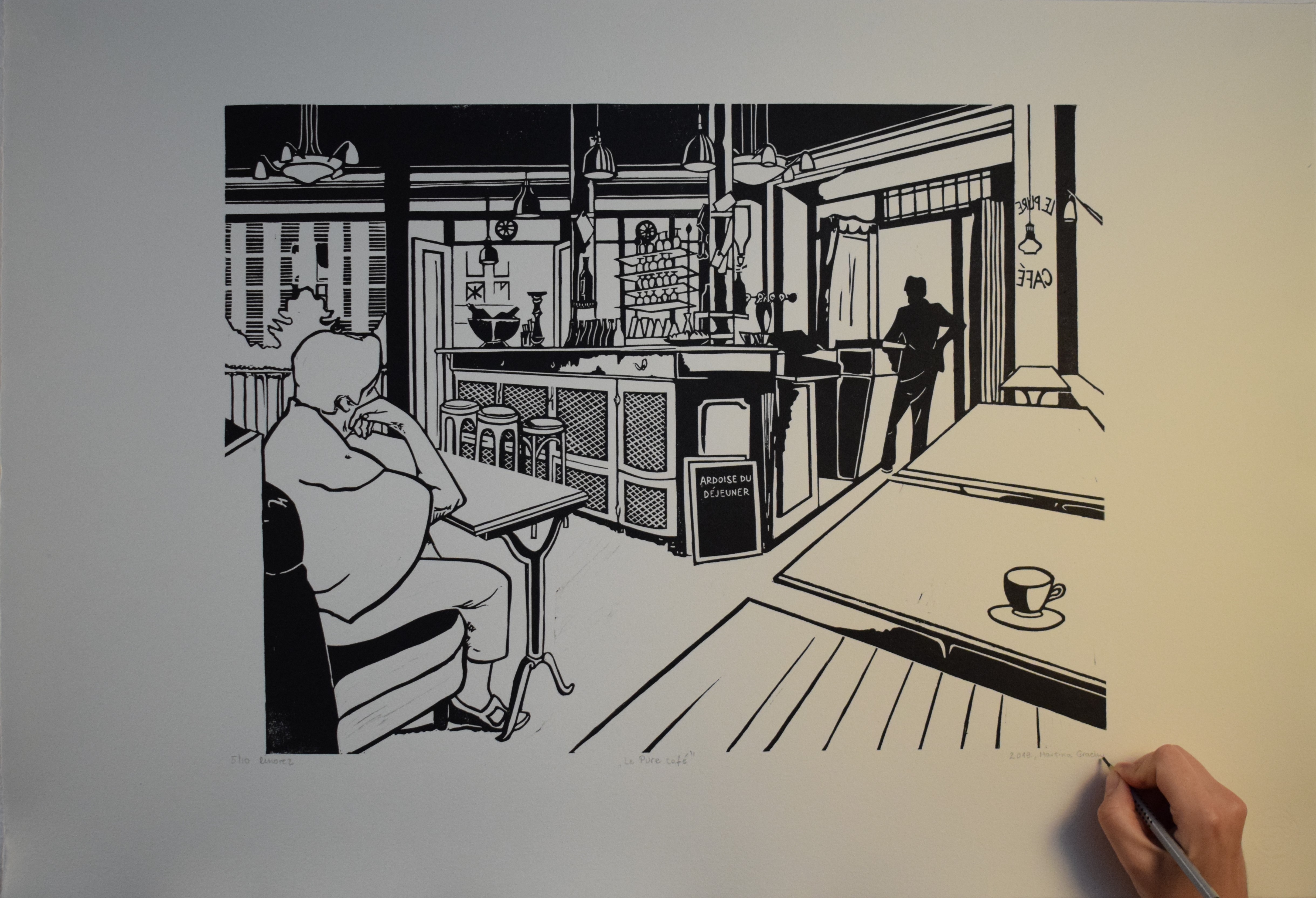 Le Pure café. Novi rad u seriji mojih linoreza koji prikazuju gotovo prazne prostore. No, istovremeno, i prvi u toj seriji kojega je iniciralatuđa ljubav prema određenoj lokaciji i priči. Naime, Le Pure café je privatna narudžba koja bi mi, kao takva, vjerojatno bila neprihvatljiva kada se ne bi uklapala u atmosferu mojih retro-romantičarskih uradaka 🙄. Naručiteljica je moj frankofil, službeni, ali njena narudžba ovog linoreza zapravo je proizašla iz ljubavi prema određenoj filmskoj lokaciji u Parizu.