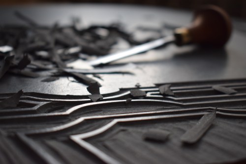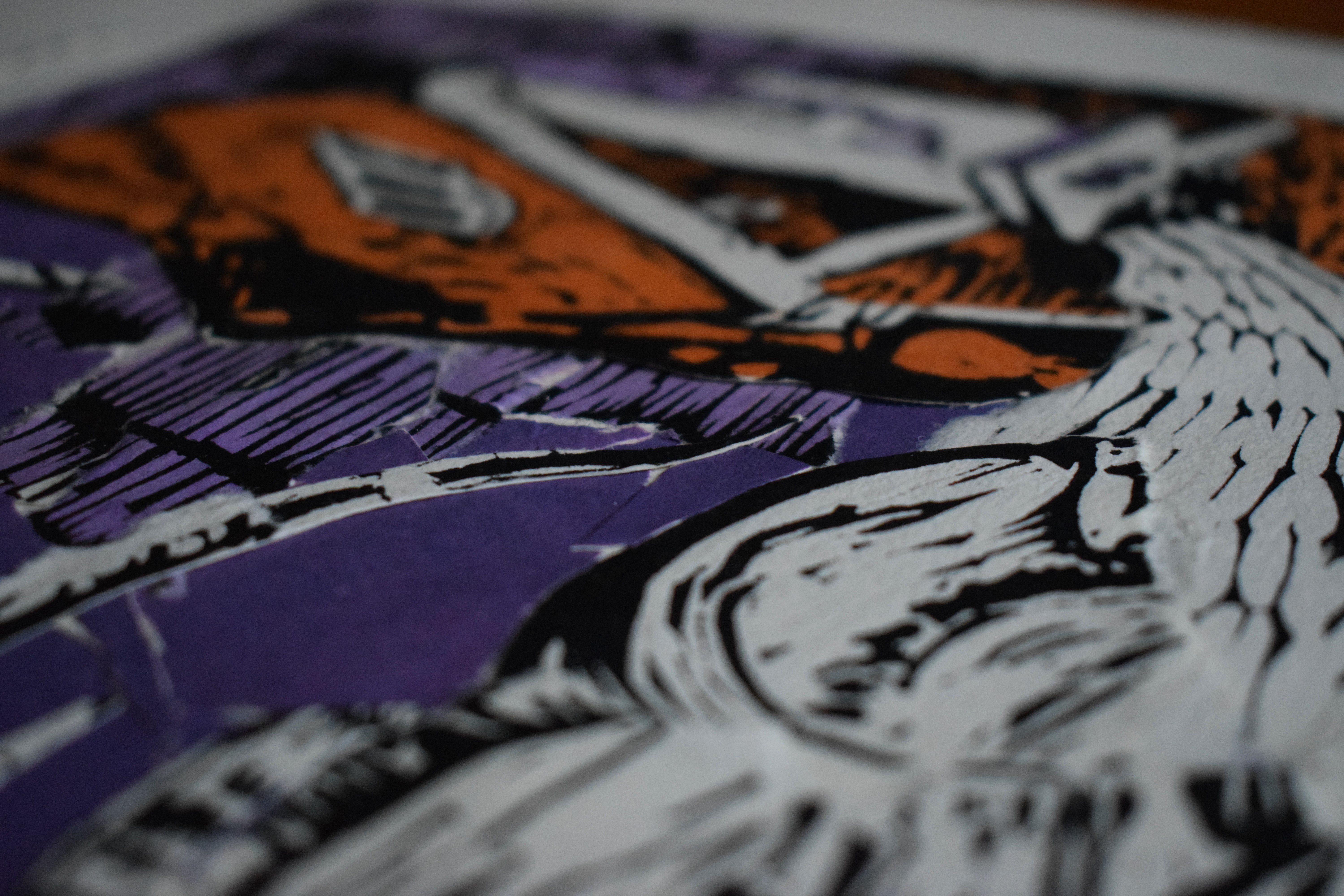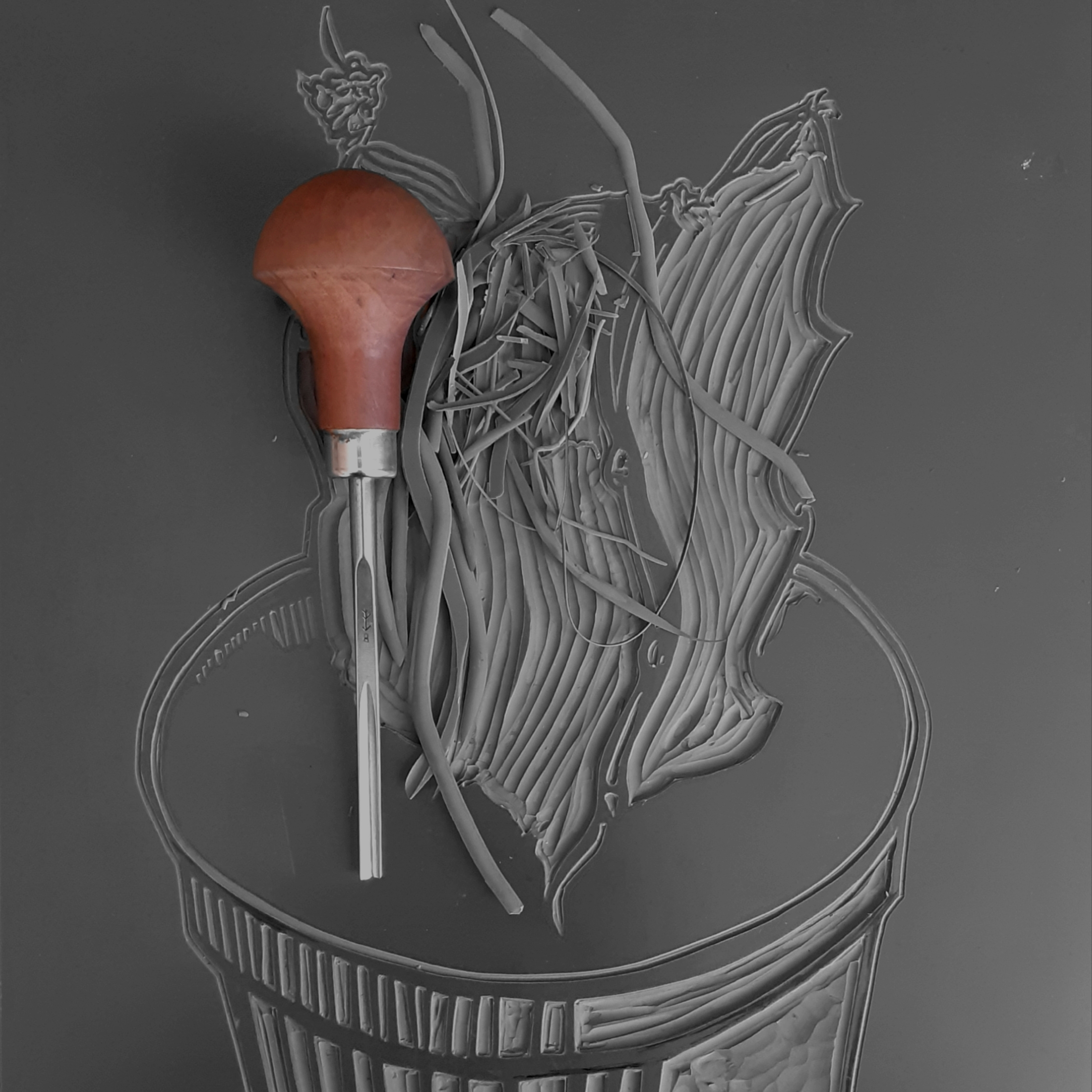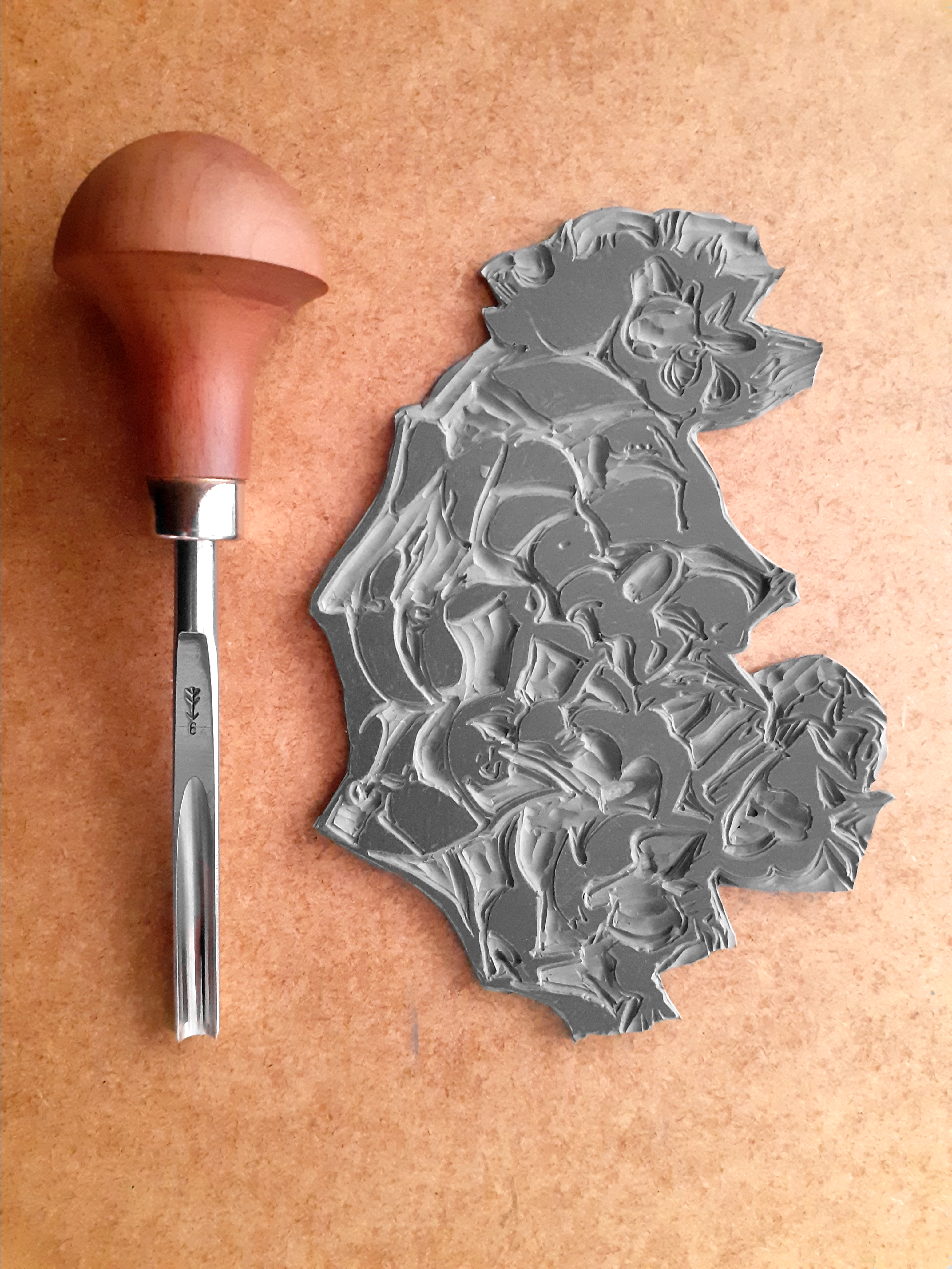 Linoleum koji sam ovaj puta koristila bio je Armstrongov battleship. Za prethodna dva linoreza koristila sam neku drugu vrstu jer, u tom periodu, battleship nisam mogla nigdje nabaviti. Ali, srećom, ljudi iz trgovine gdje ga inače kupujem pronašli su još jednu rolu na nekom ormaru u svom skladištu. Armstrongov battleship se teže dubi u odnosu na zamjenske materijale, ali mi je svejedno omiljen.