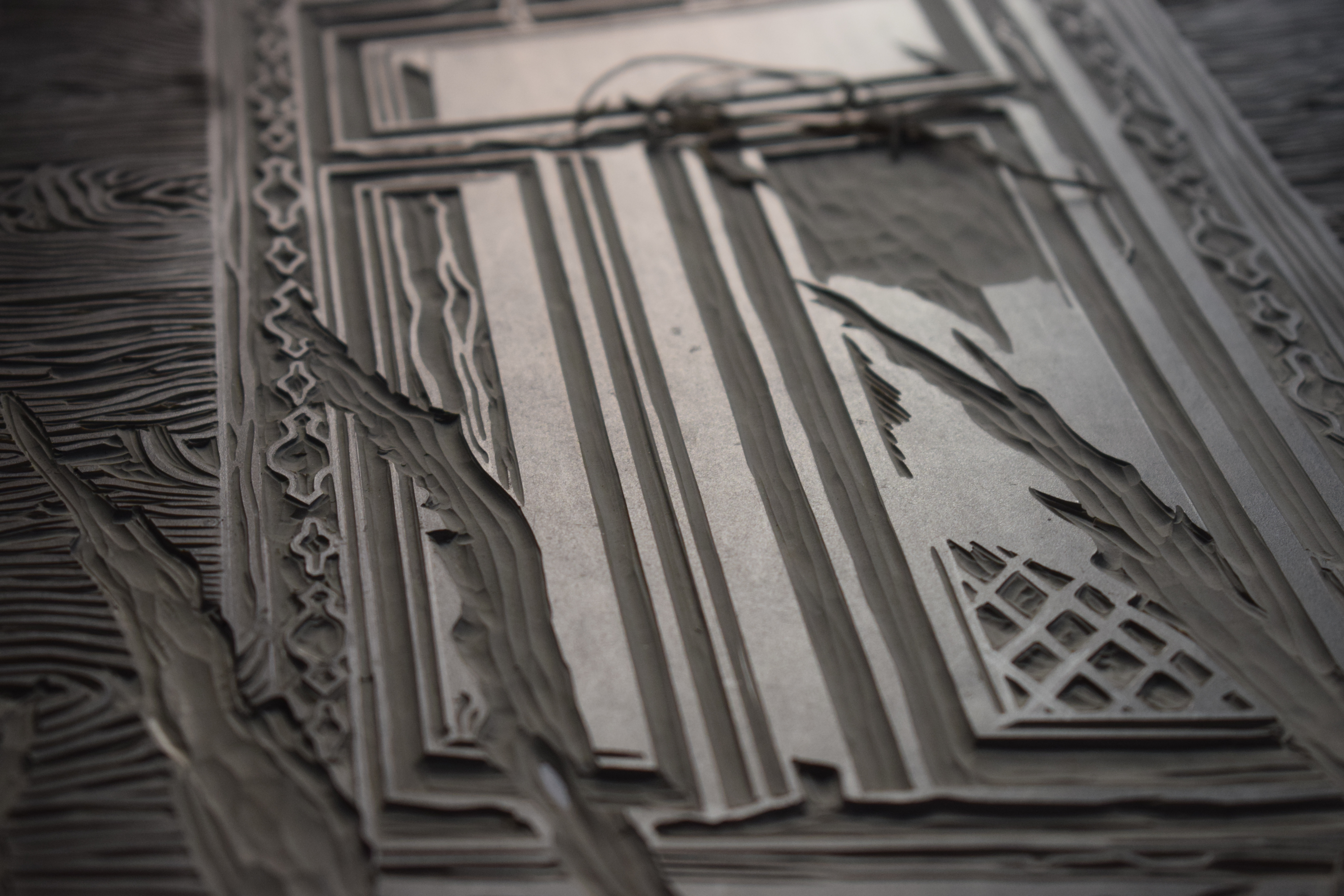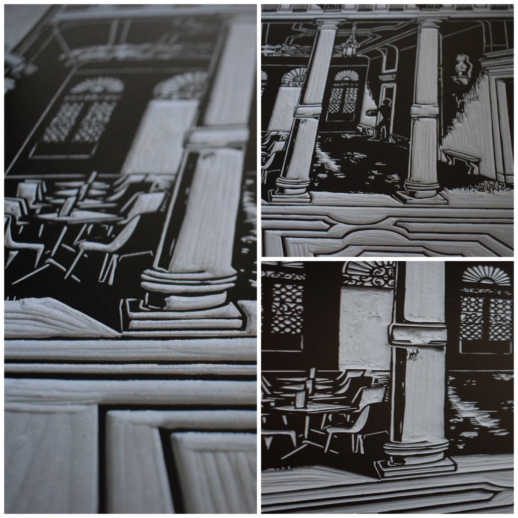 Osim atmosfere magičnog skrovišta, unutarnje dvorište palače omogućavalo je i jaki kontrast svjetla i sjene. Tehnički, to je vjerojatno bio glavni razlog zašto sam ovaj puta najprije izdubila okvir– rubne dijelove ploče linoleuma koji su u otisku trebali ostati bijeli.