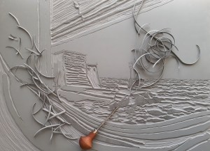 Set kistova za kinesku kaligrafiju pronašla sam u svom kućnom ateljeu. Tata mi ih je prije nekoliko godina donio iz Šangaja. Među gomilom papira našao se i komad klobučnog, pa sam se bacila na posao. Fluidnost poteza koju omogućava tehnika korištenja ovih kistova bio mi je idealan za crtanje površine mora. Mnogi stručnjaci debatiraju o tome ima li smisla detaljno prenositi karakteristike crteža u grafiku. No meni je, za moju površinu mora, upravo to prenošenje bilo ključno. Htjela sam svoje valovite crte što detaljnije izdubiti u linoleumu.