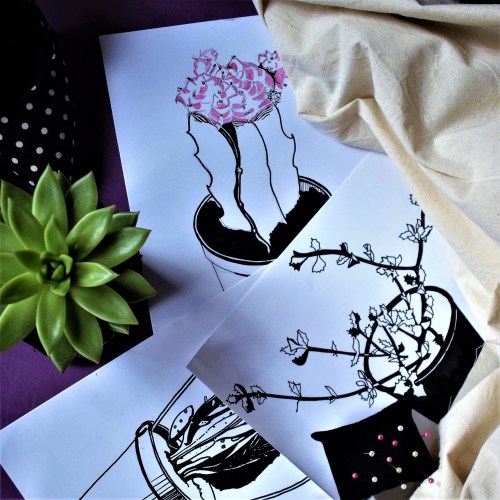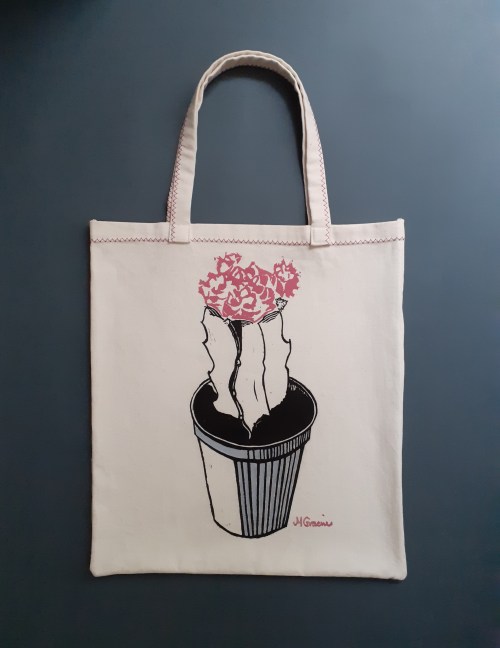 Nakon što sam završila grafiku koju sam radila za vrijeme općeg zatvaranja u kuće (uslijed pandemijske situacije), odlučila sam nastaviti s radom na nečem malo manje zahtjevnom. Na nečem što, pri izvedbi, neće iziskivati toliko razmišljanja o sljedećem koraku. Tako je došlo do sljedeće u seriji mojih platnenih torba s otiskom kaktusa. Ovoga puta sa cvijetom.