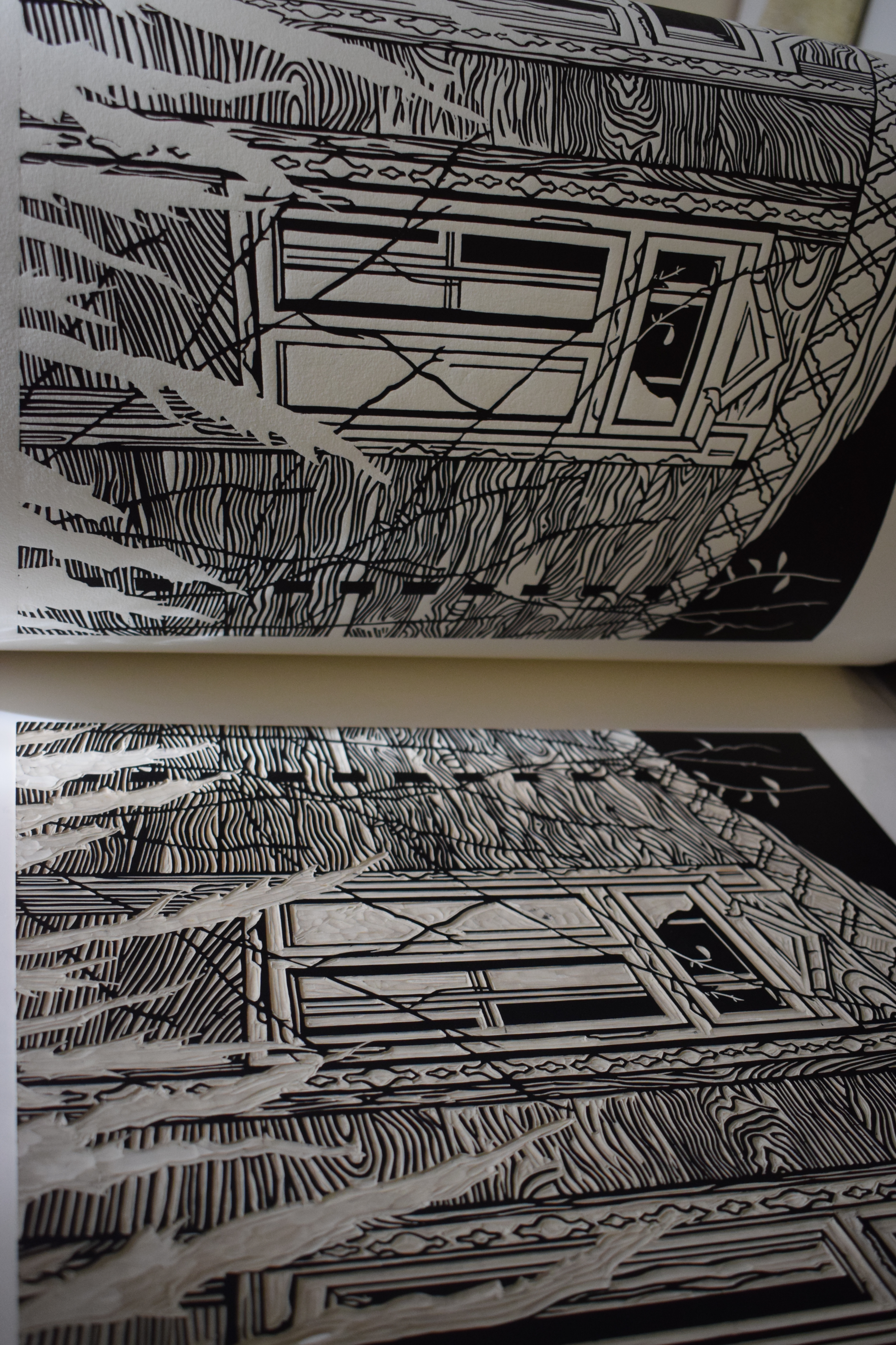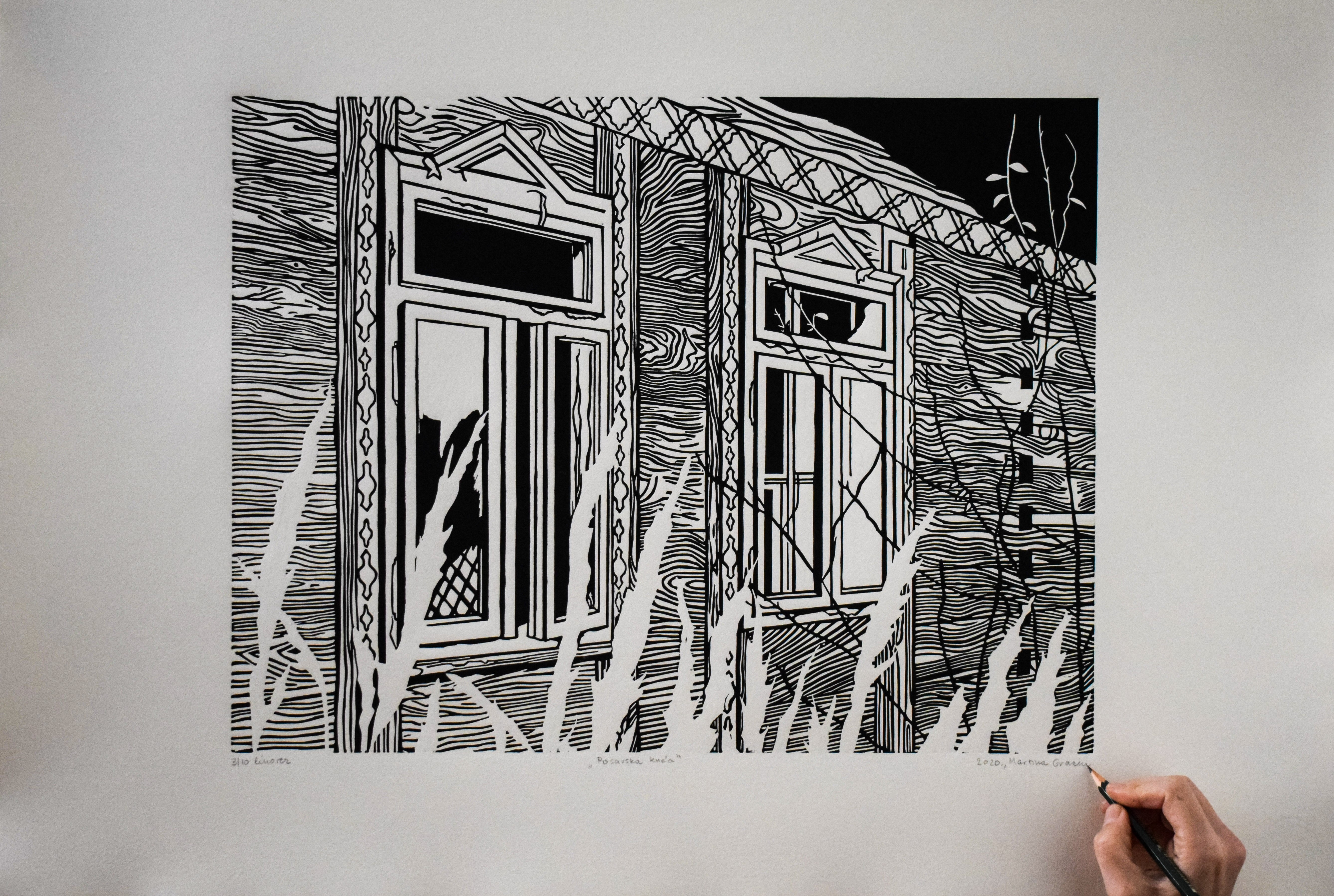 Pa ipak, kao i mnoge druge, kuća koju sam crtala za ovaj linorez izgledala je napušteno i bila je gotovo u potpunosti sakrivena granjem, raslinjem i trnjem.