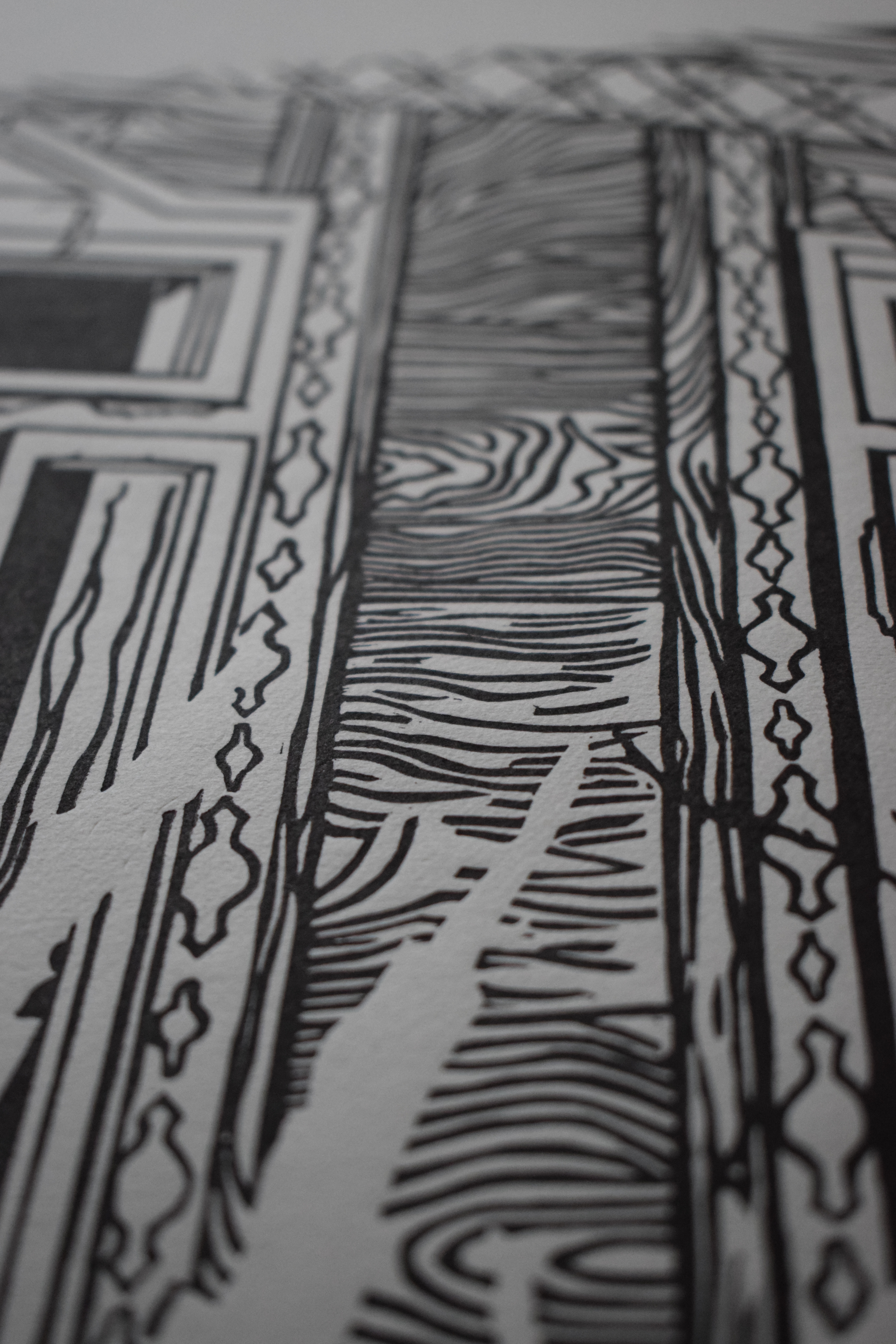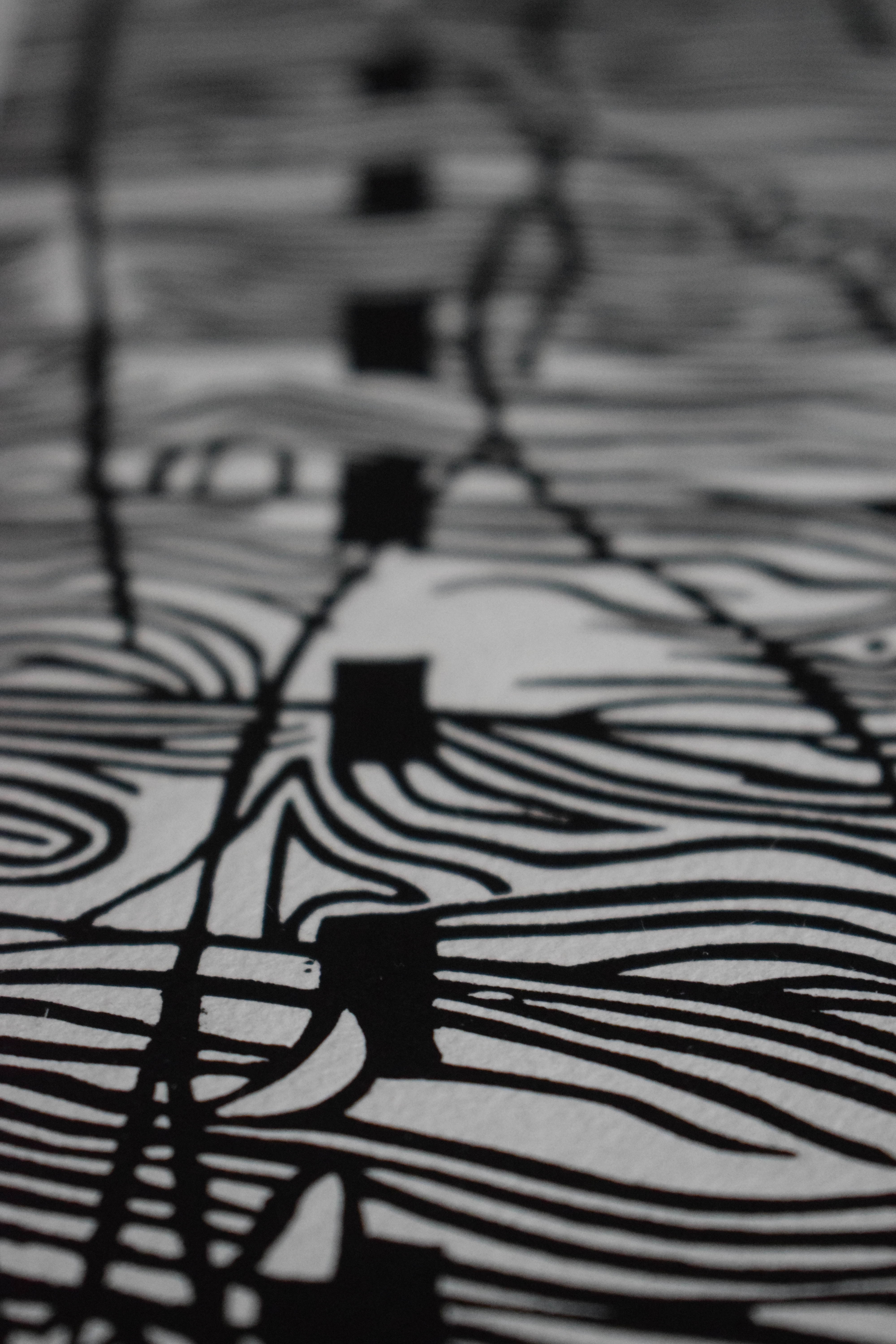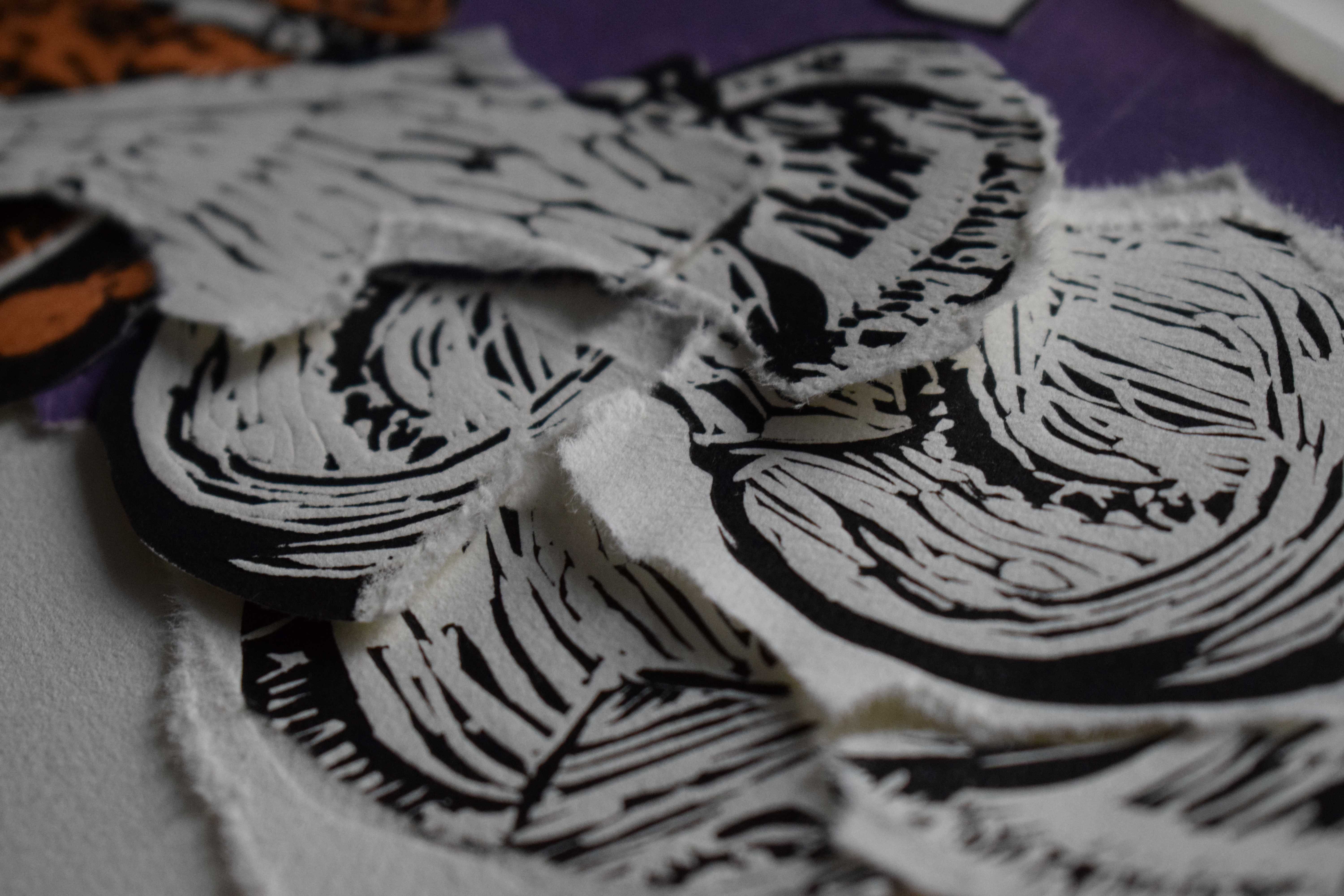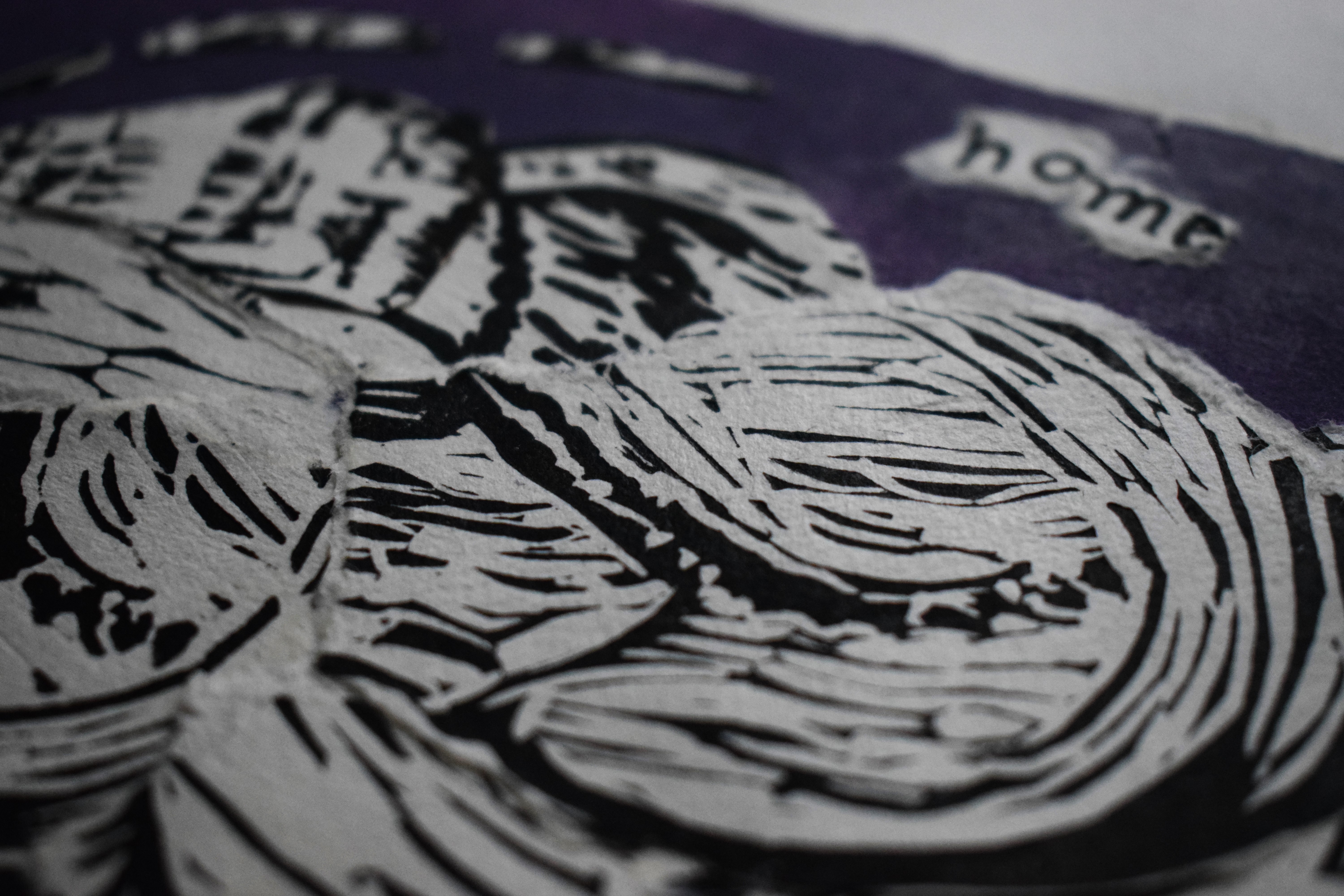 Htjela sam da moje linije koje prikazuju teksturu budu izražajne. Kako sam napredovala u dubljenju ploče linoleuma, zaključila sam da moj interes za teksturu, koji se pojavio pri izradi prošlog linoreza, raste i razvija se.