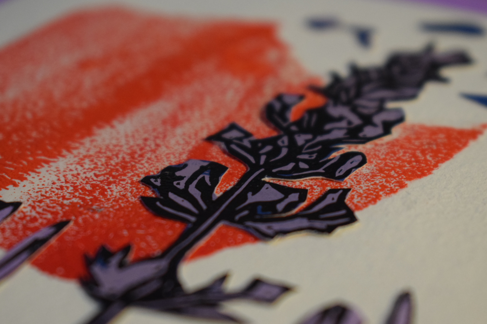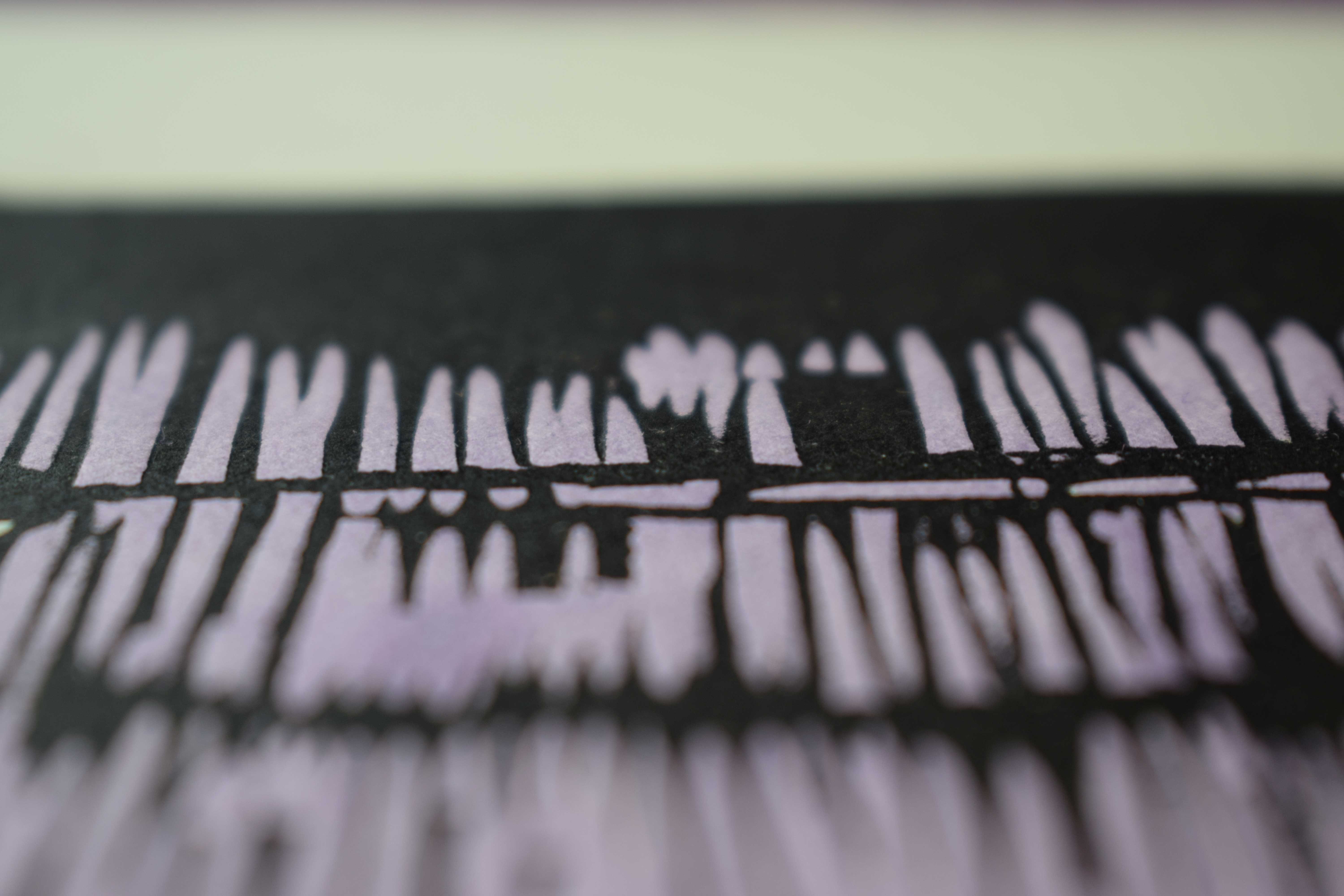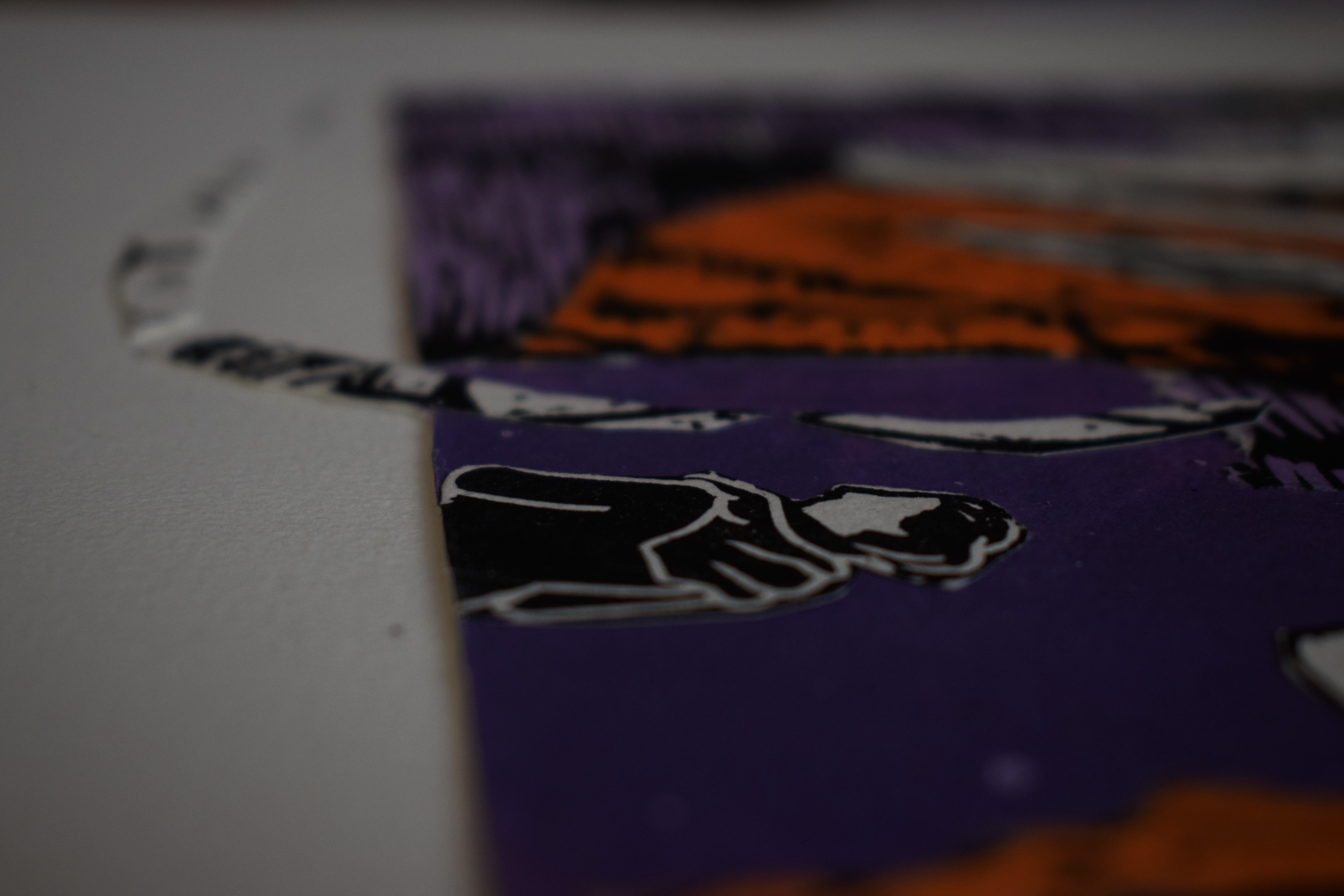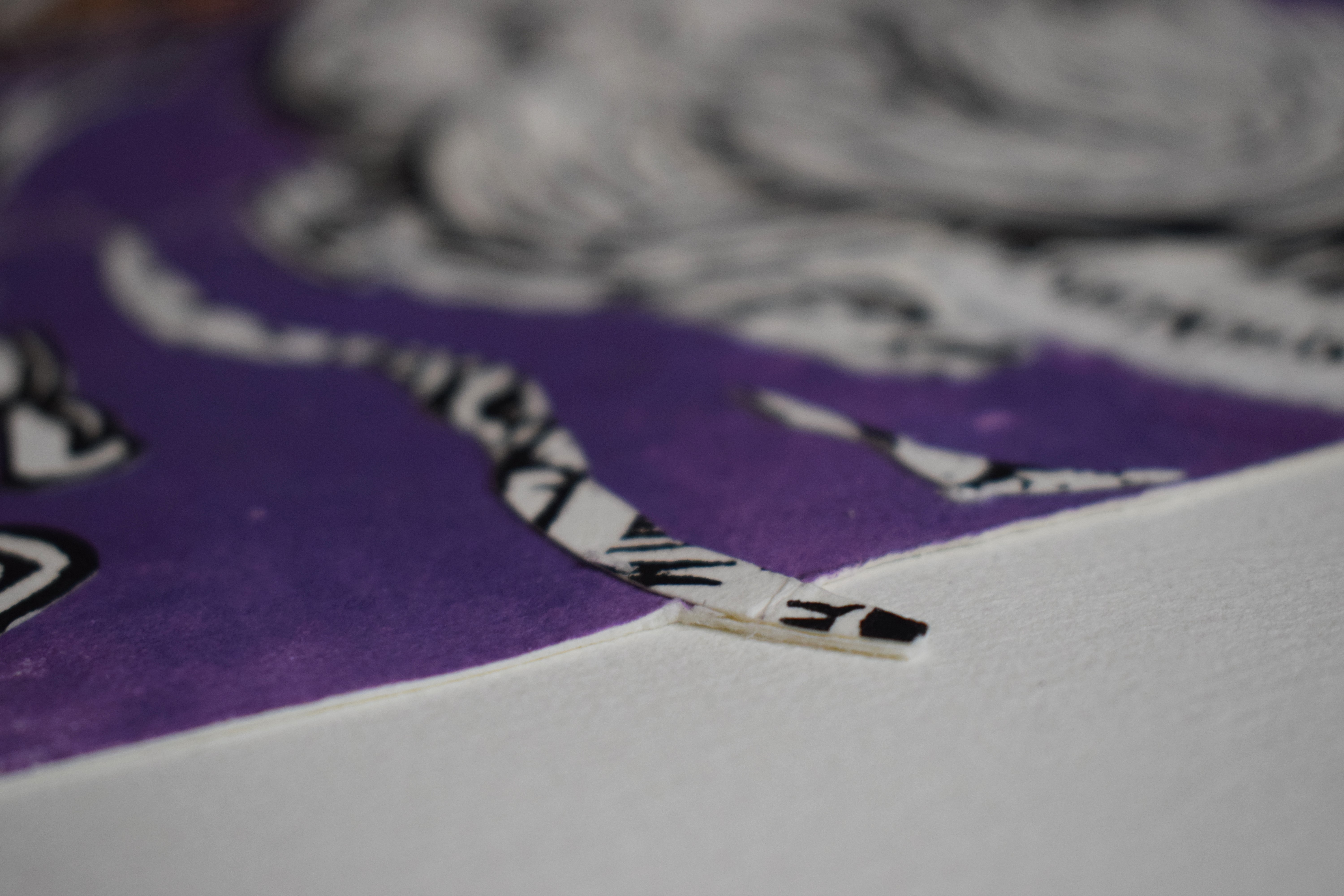 Htjela sam da moje linije koje prikazuju teksturu budu izražajne. Kako sam napredovala u dubljenju ploče linoleuma, zaključila sam da moj interes za teksturu, koji se pojavio pri izradi prošlog linoreza, raste i razvija se.
