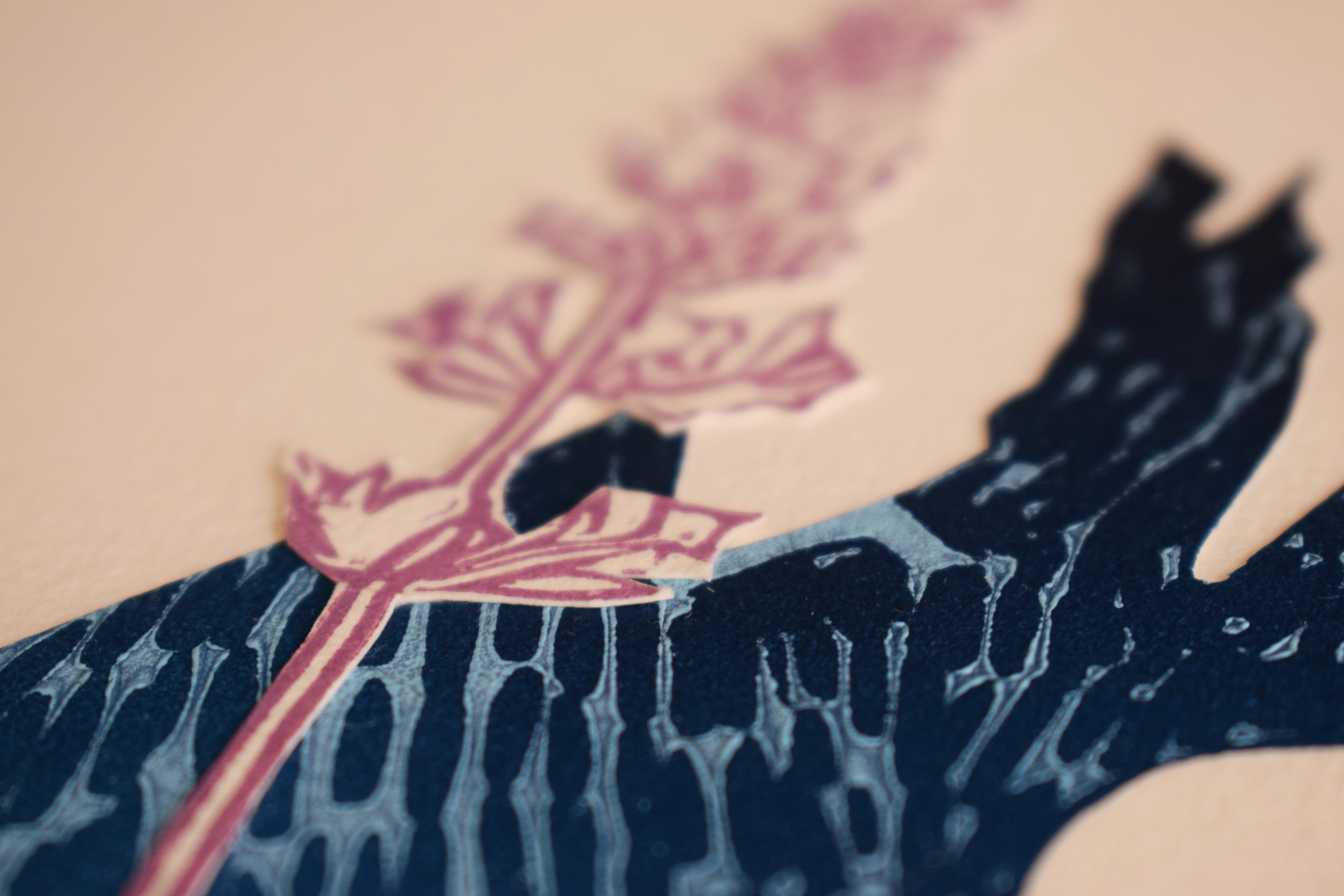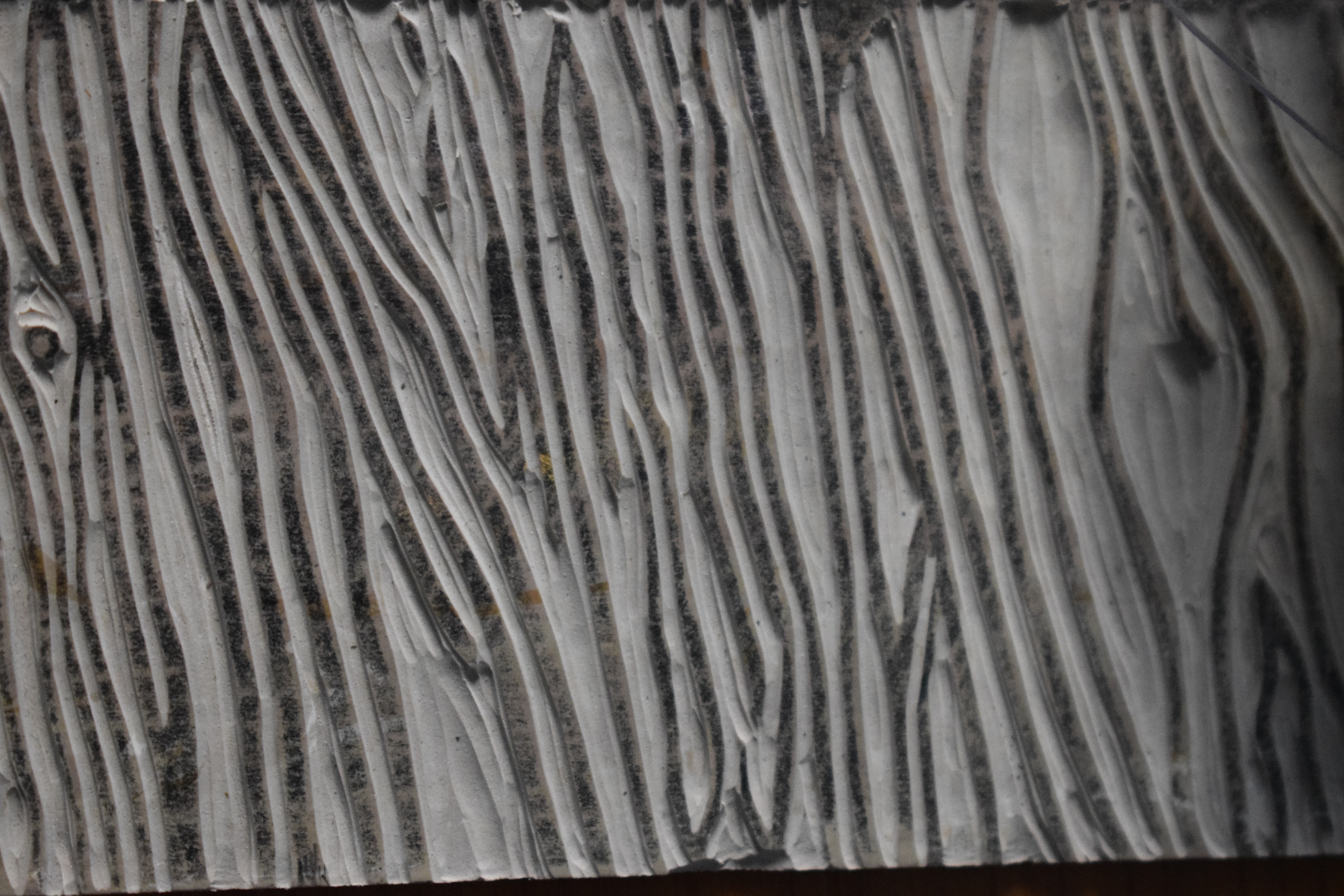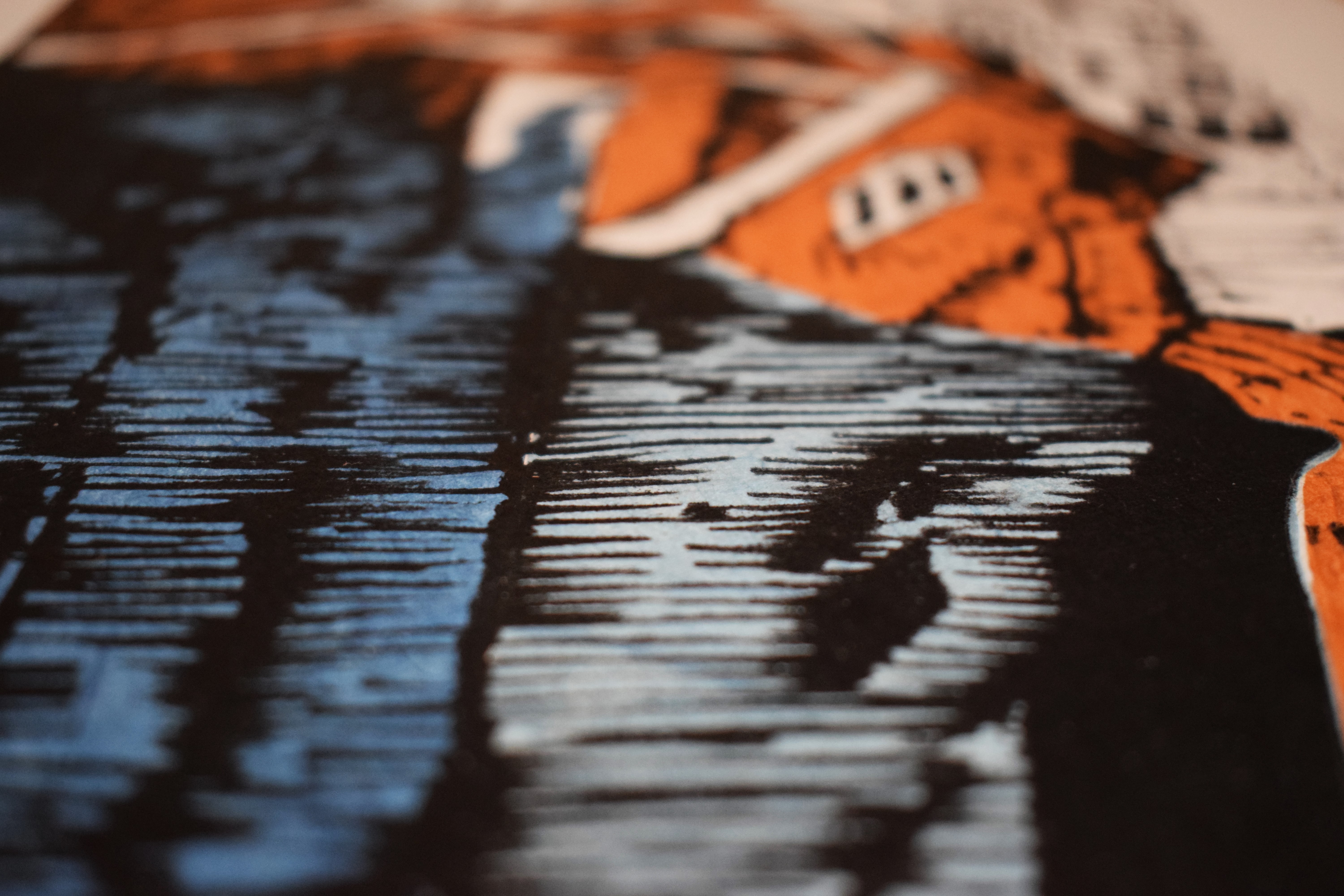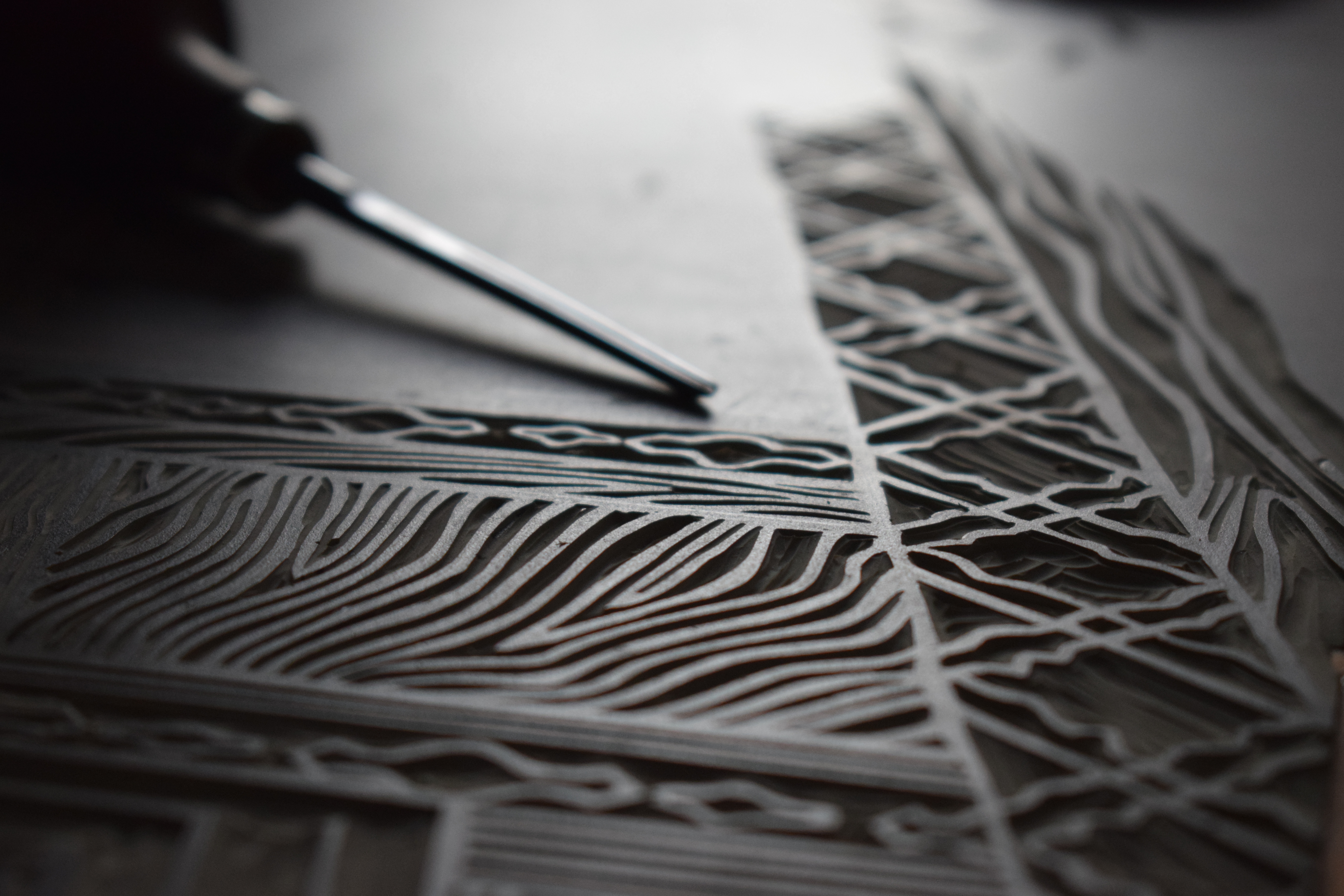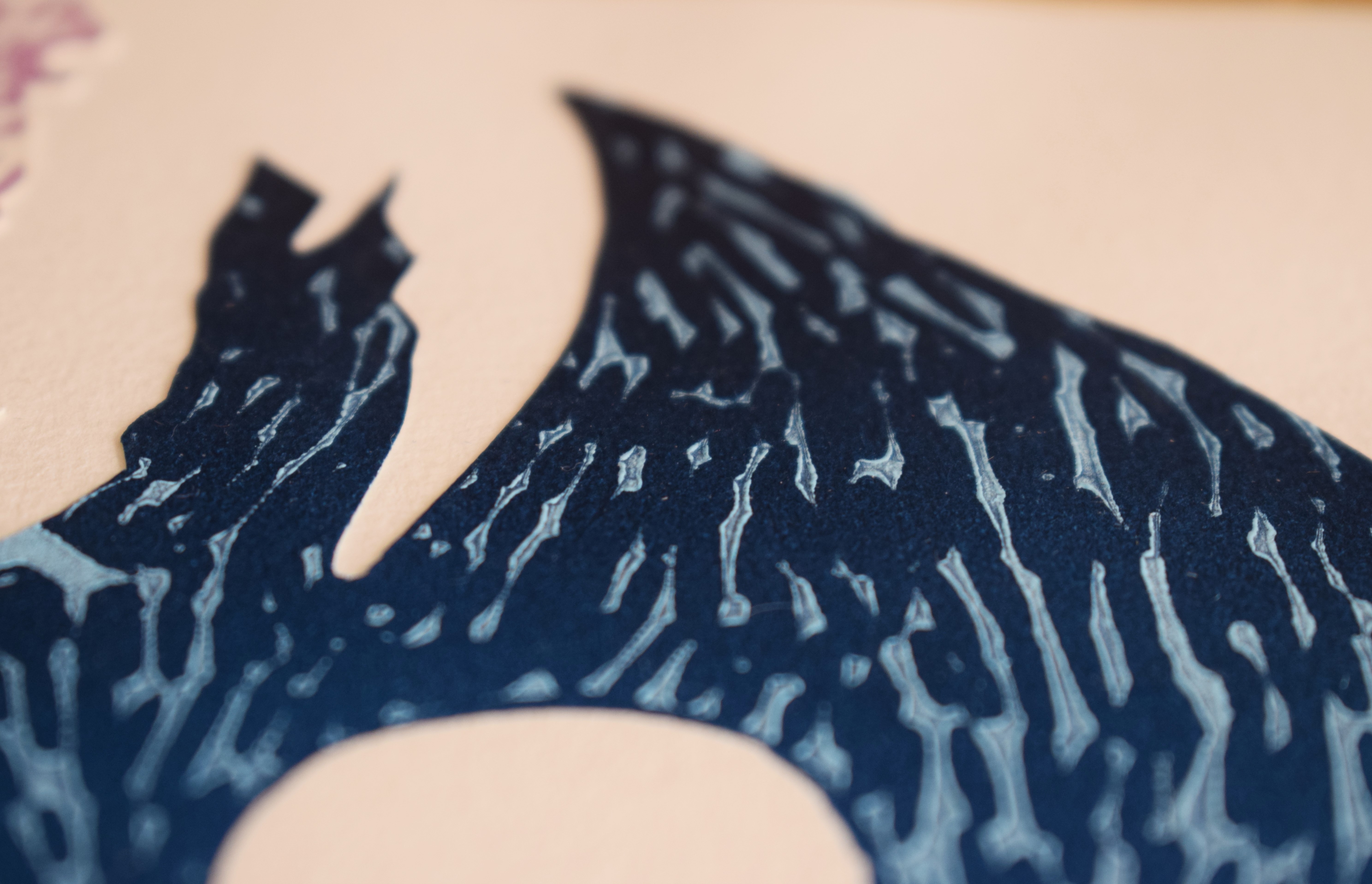 Htjela sam da moje linije koje prikazuju teksturu budu izražajne. Kako sam napredovala u dubljenju ploče linoleuma, zaključila sam da moj interes za teksturu, koji se pojavio pri izradi prošlog linoreza, raste i razvija se.