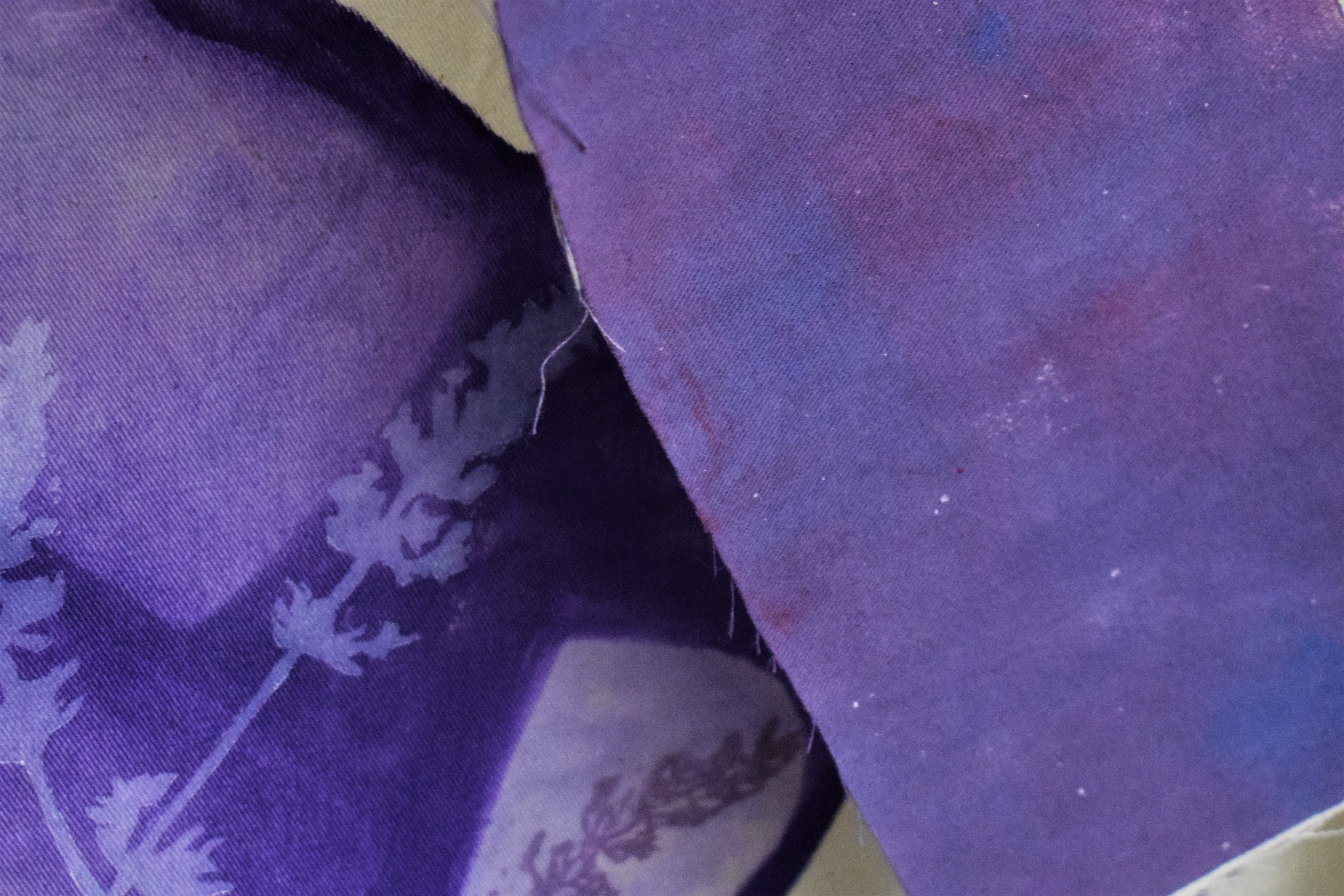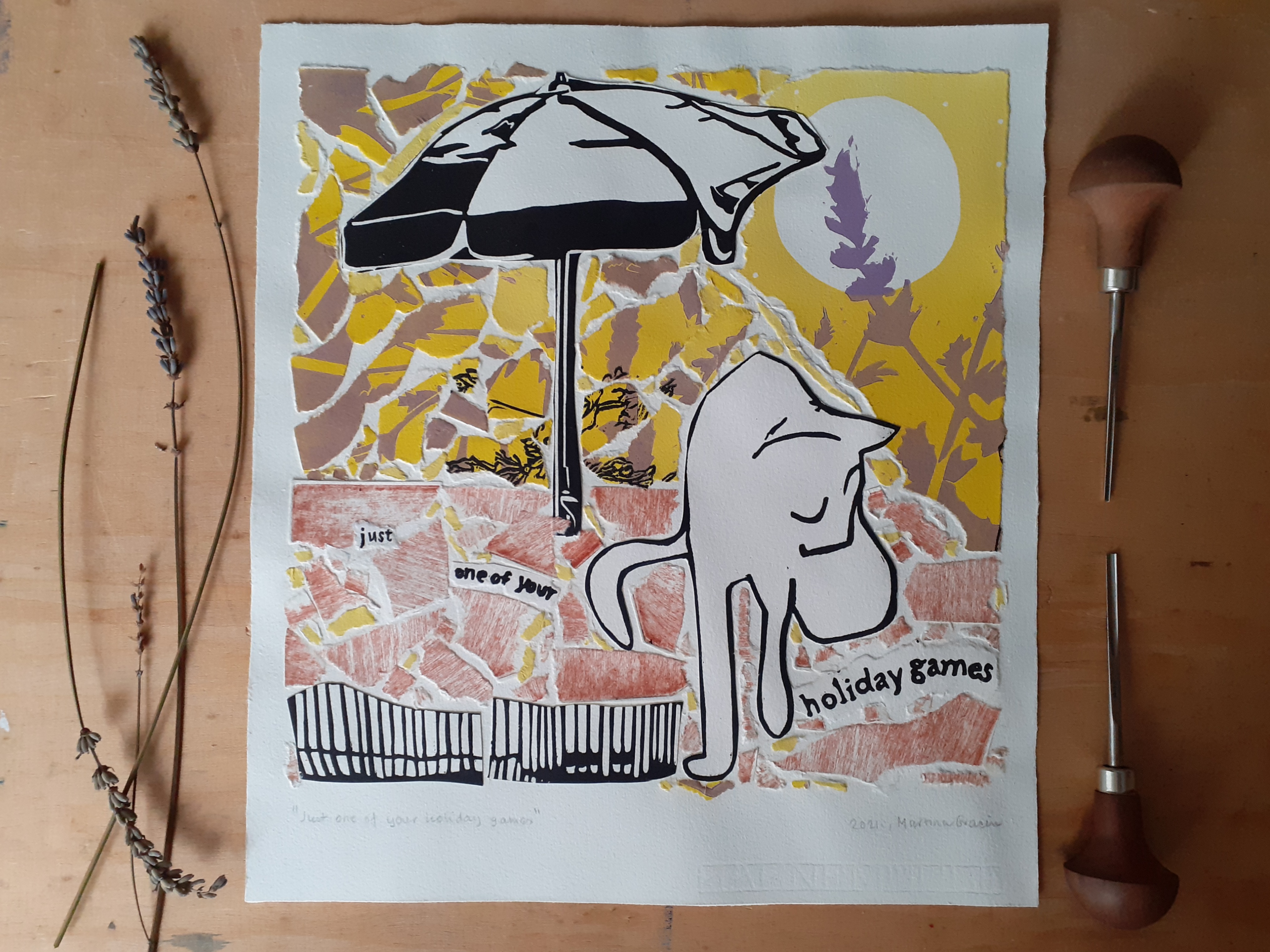 Prvi sam složila koristeći probni otisak za jedan od linoreza s motivom lavande. Tu su i elementi novijih linoreza Skopje i Mačkopis. Plažu sam složila trgajući otpadni element sa grafike napravljene u tehnici dubokog tiska.