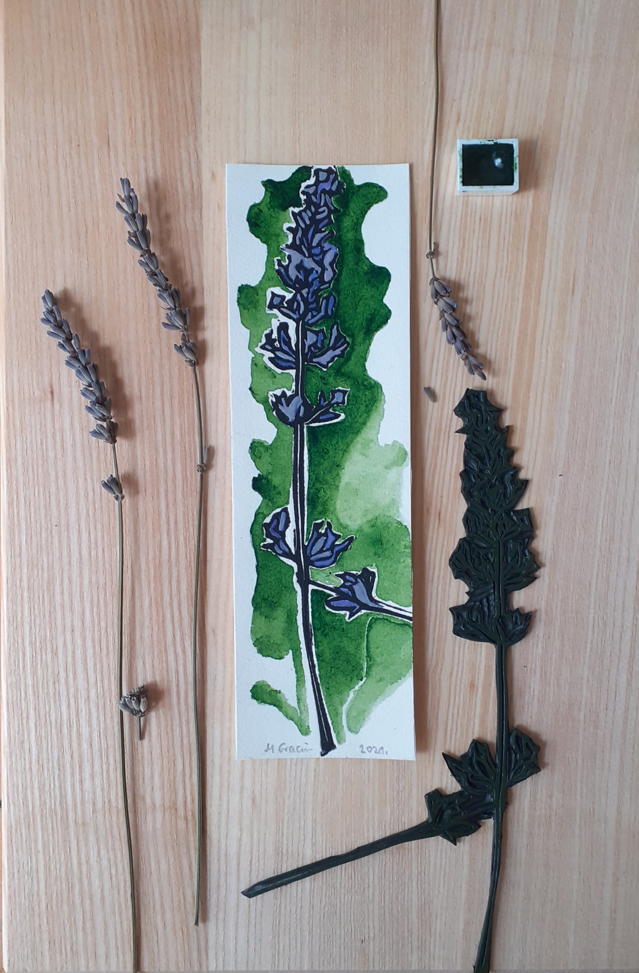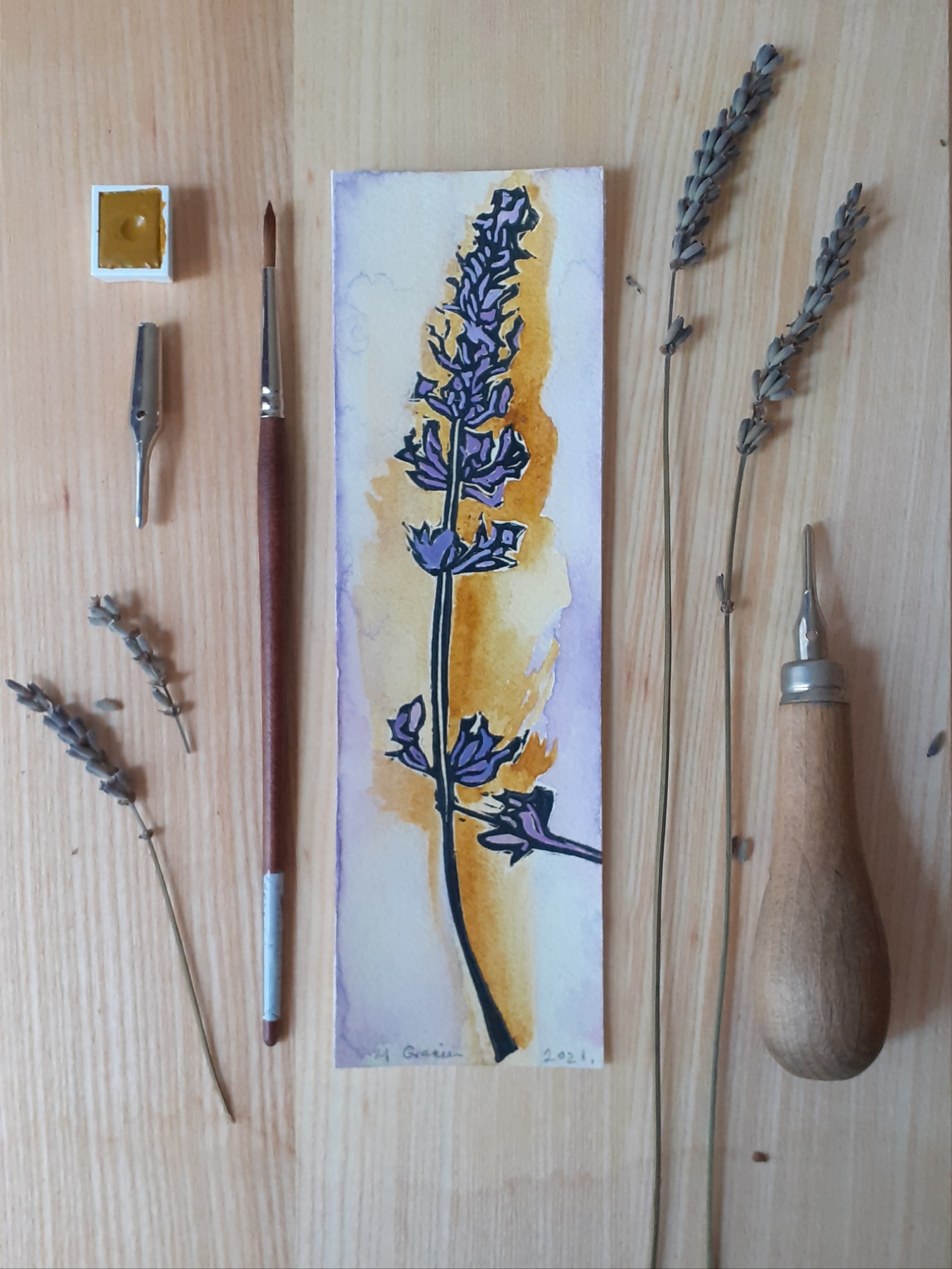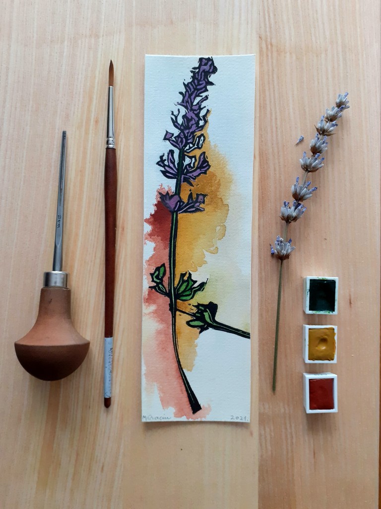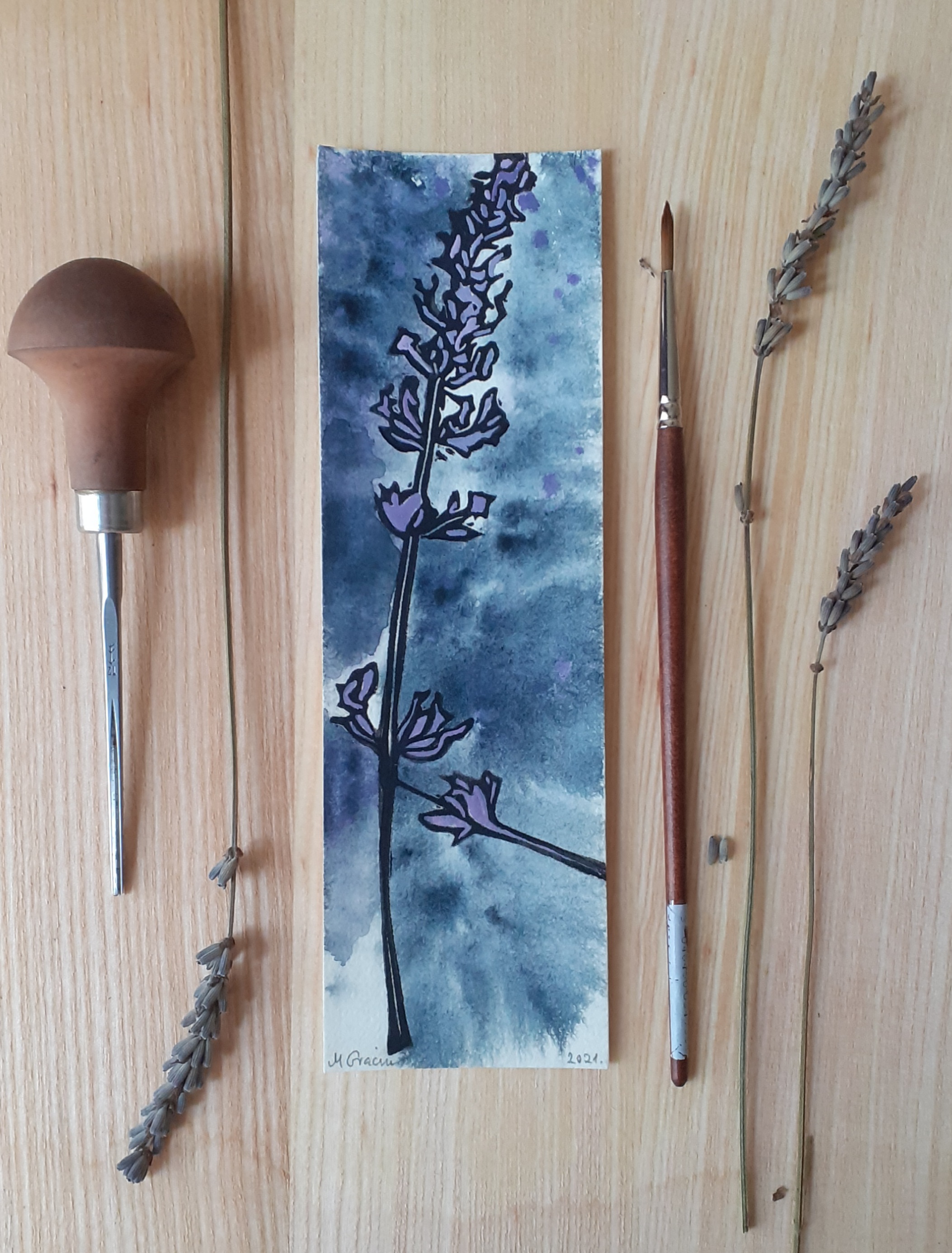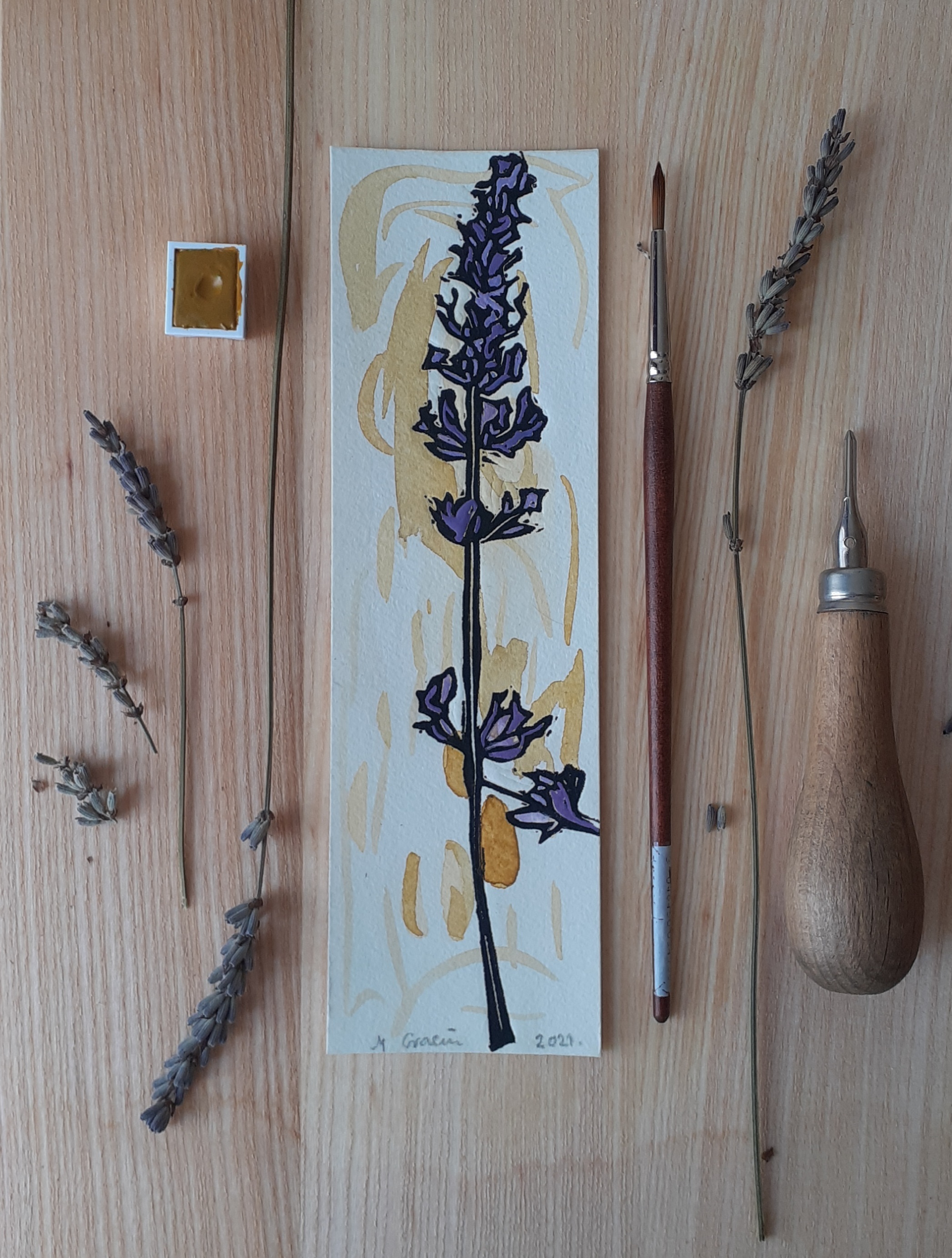 Druga ideja kako iskoristiti ostatak boje za otiskivanje bila je otisnuti neki od manjih linoreza (s motivom lavande, naravno) na manji papir veličine straničnika, popularnog bookmarka. Nakon sušenja boje, kolorirala sam otisak akvarelom i gvašem.