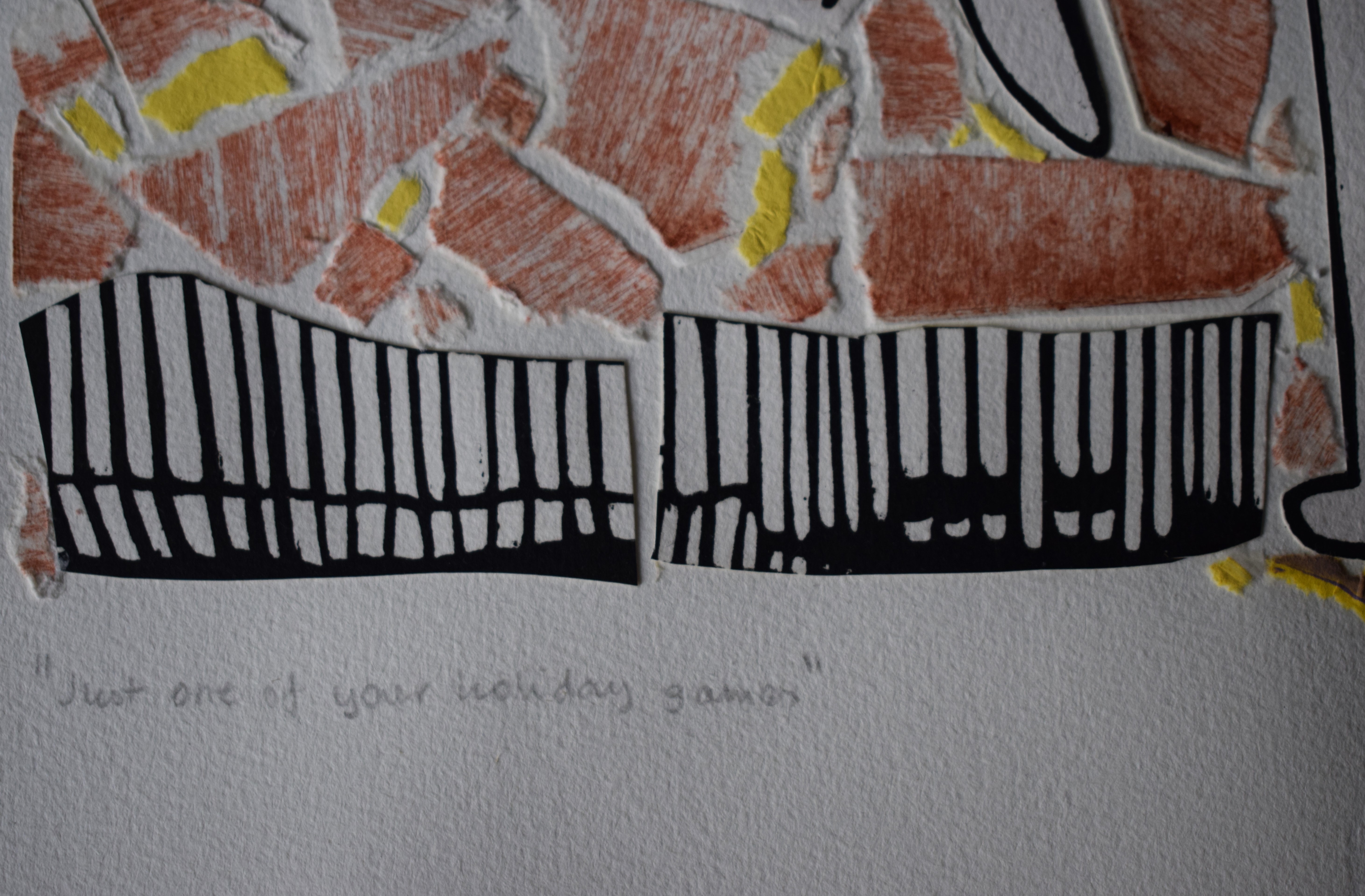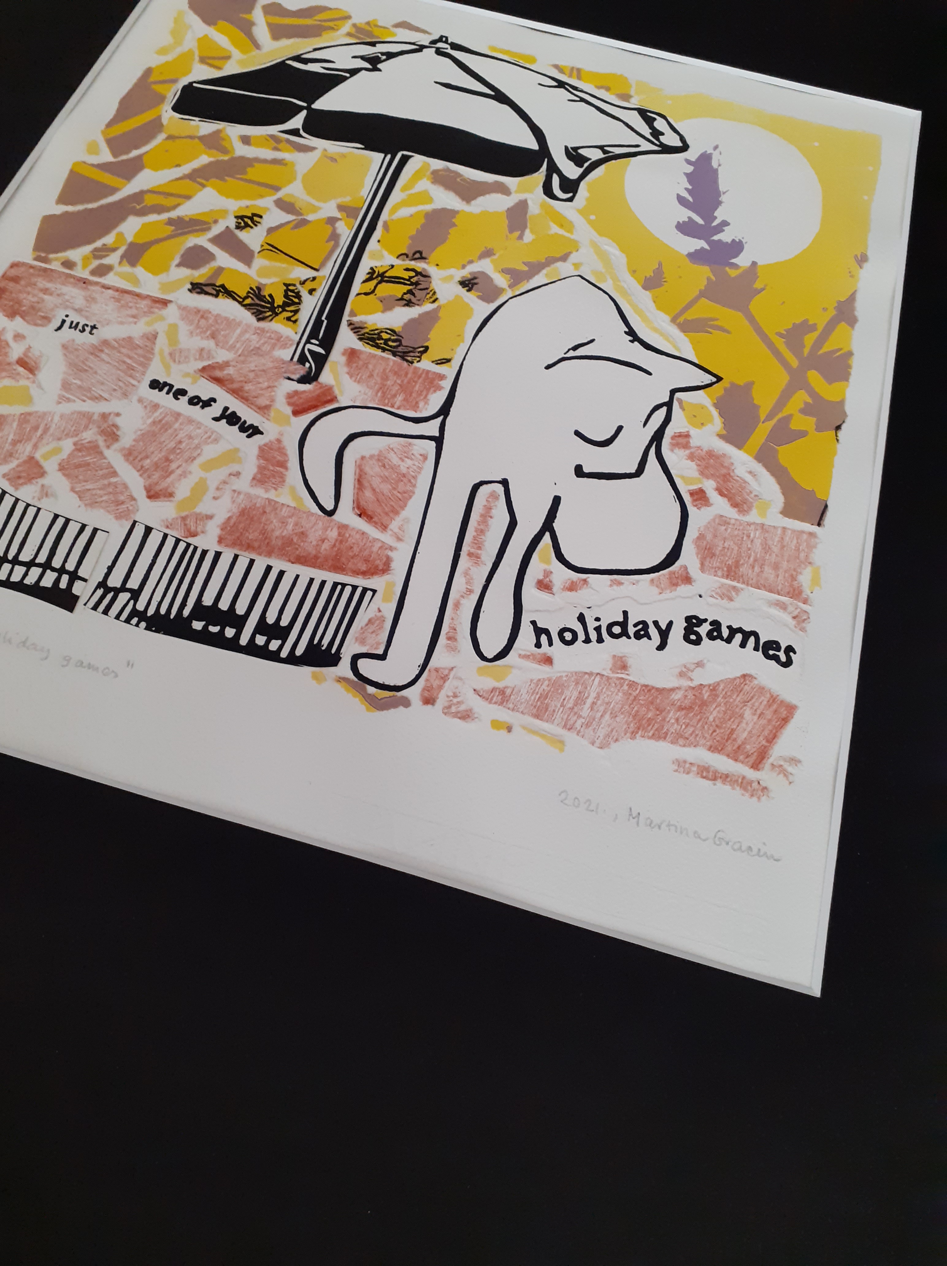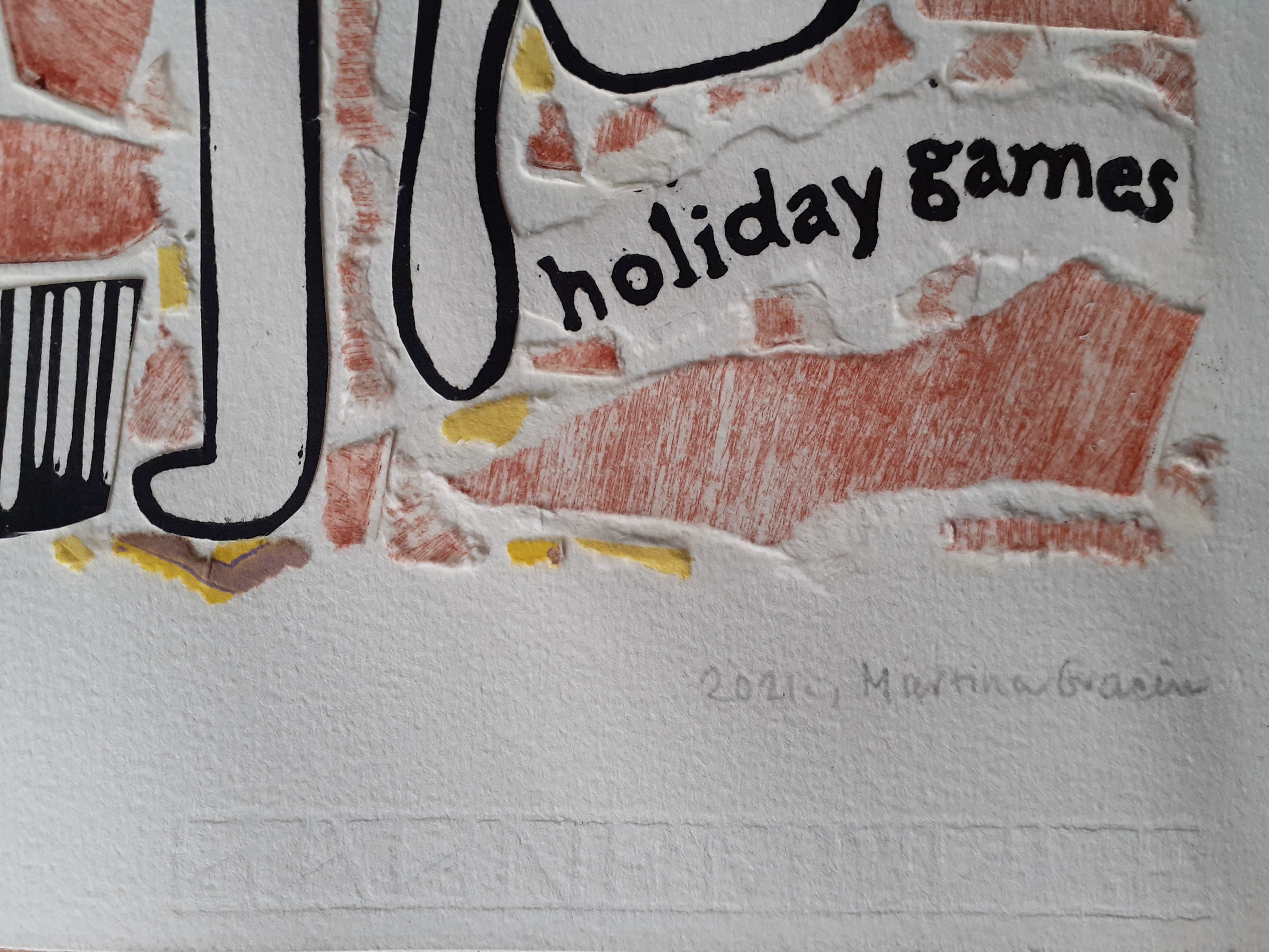 Evo par detalja. Kolaž sam, dakle, sastavila od originalnih otisaka. Tekst sam također uzela sa jednog od otisaka linoreza Mačkopis. Just one of your holiday games dio je teksta Old Possum’s book of Practical Cats T.S. Eliota. Tako sam i nazvala kolaž.