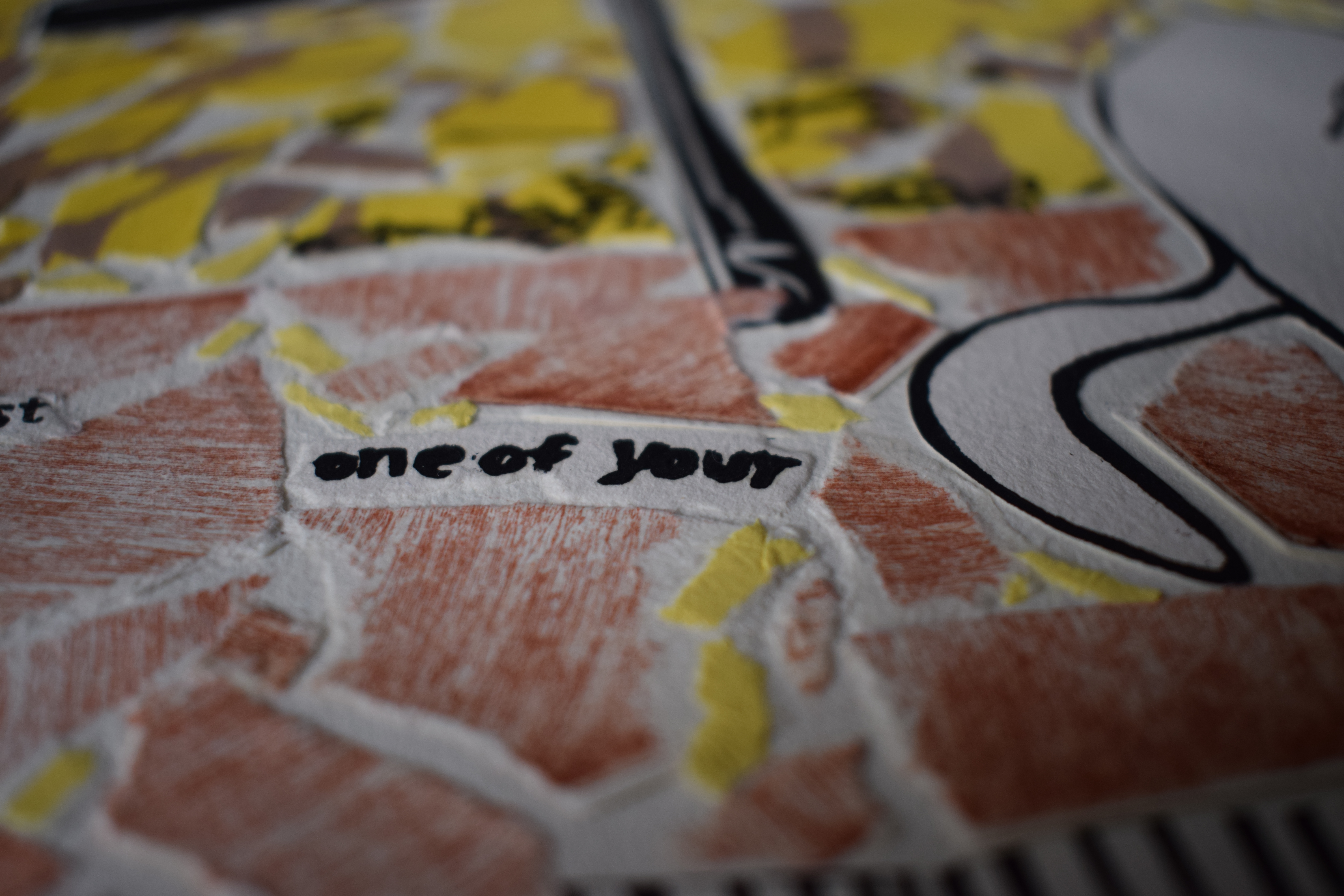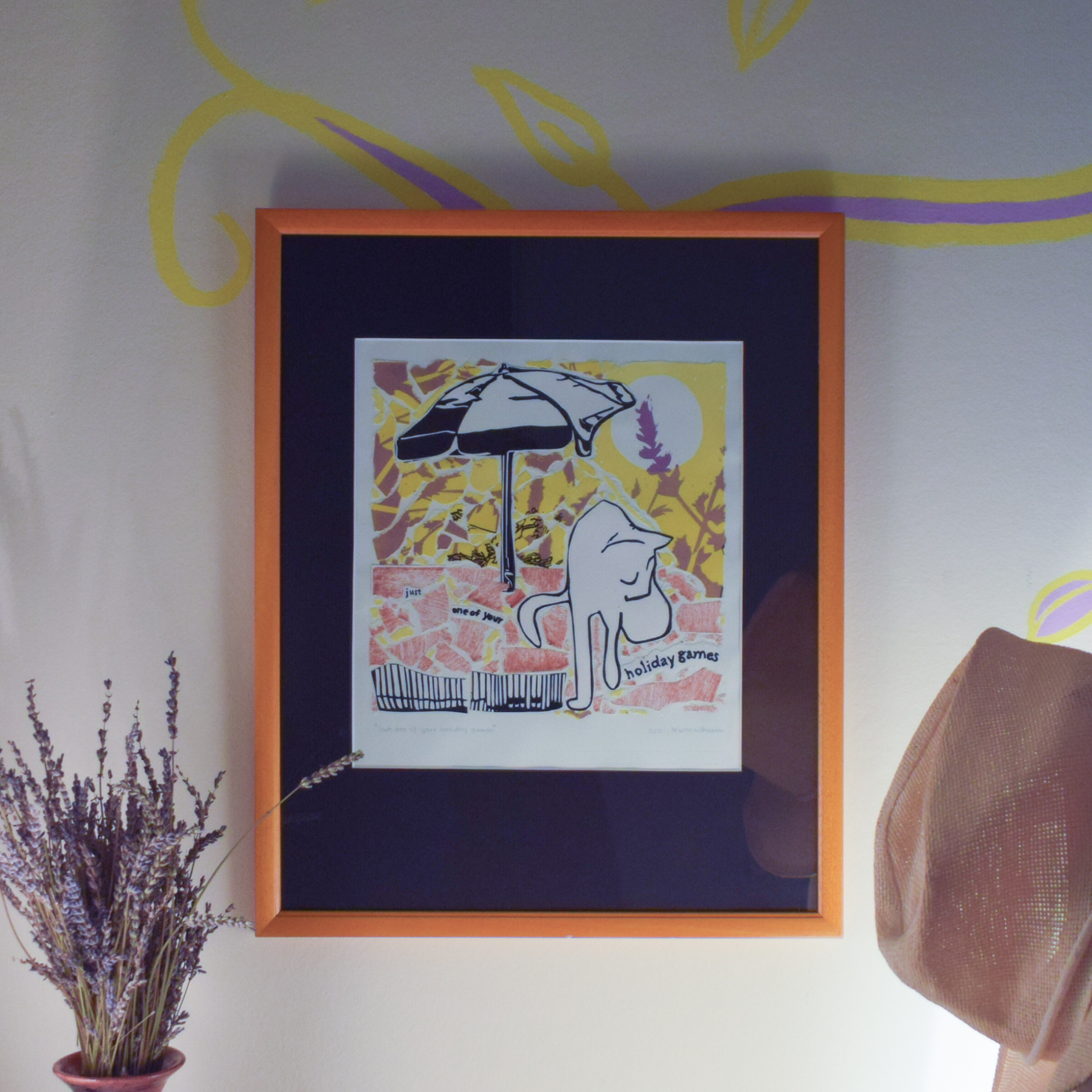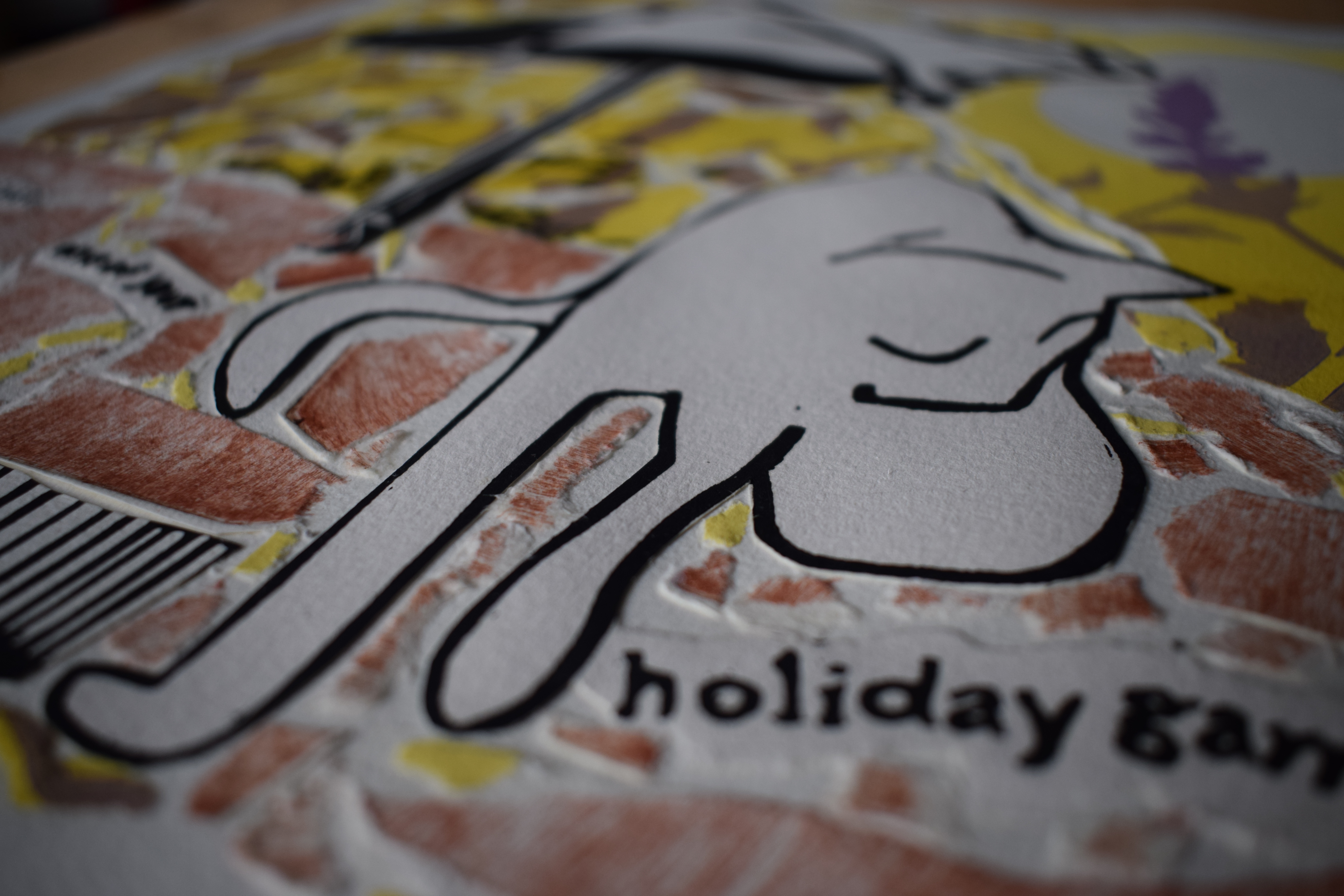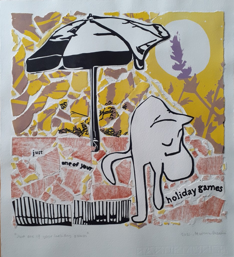 Evo par detalja. Kolaž sam, dakle, sastavila od originalnih otisaka. Tekst sam također uzela sa jednog od otisaka linoreza Mačkopis. Just one of your holiday games dio je teksta Old Possum’s book of Practical Cats T.S. Eliota. Tako sam i nazvala kolaž.