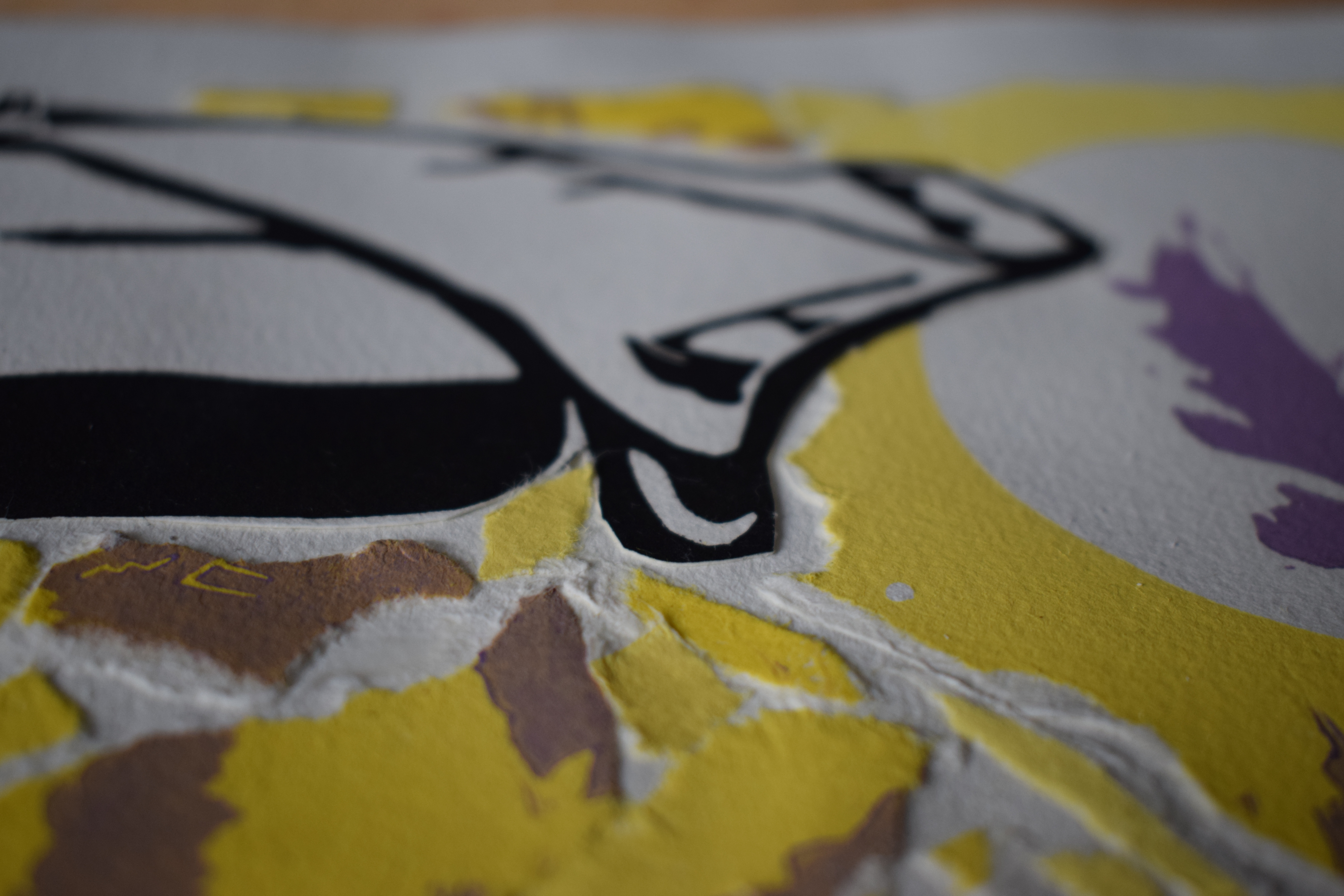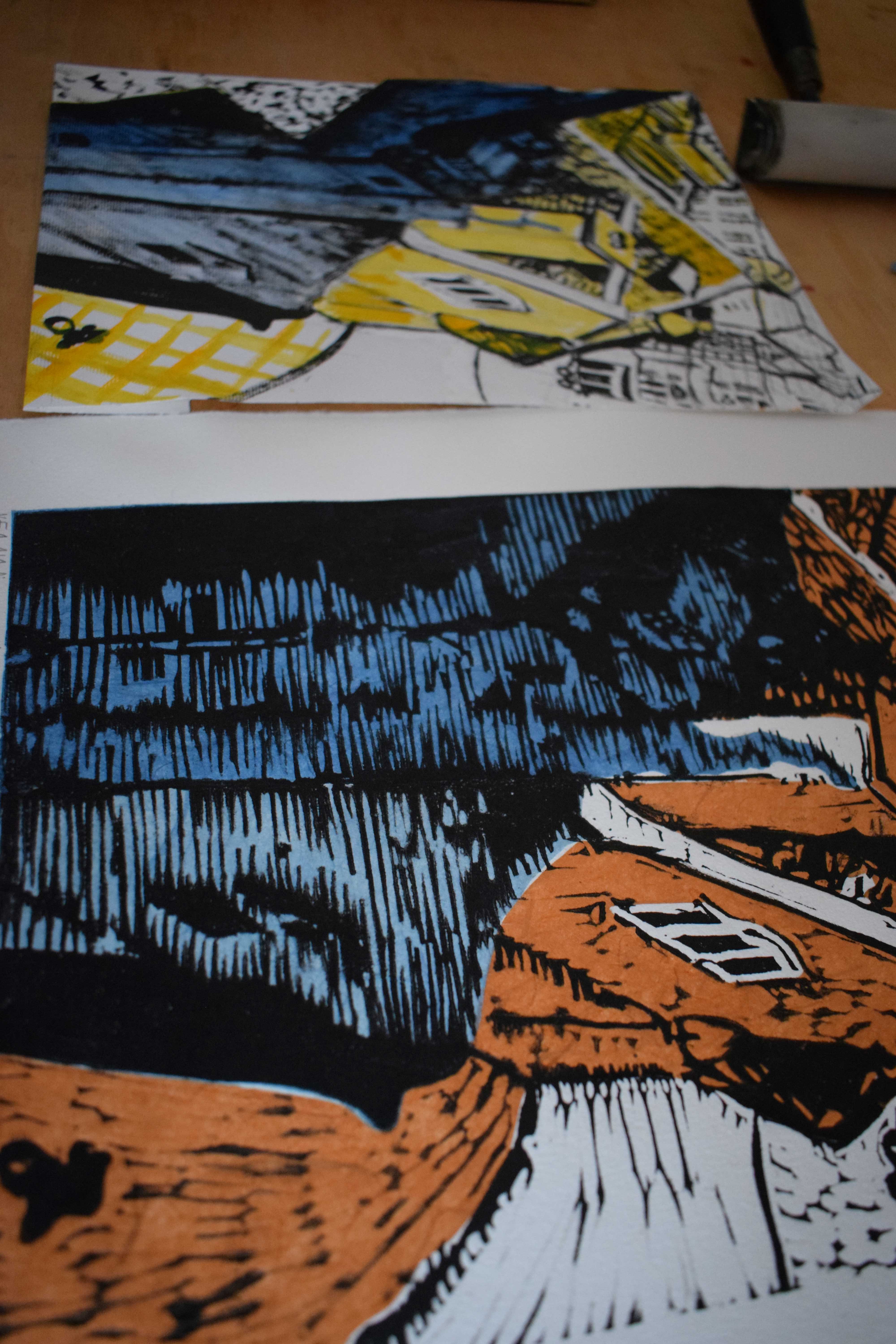 No, ovaj puta nisam stala na otiskivanju ostatka edicije Oxforda. Moja prvotna ideja za taj linorez (ona iz 2014. godine) bila je svoj Oxford napraviti u boji. To se može vidjeti gore, na fotografiji žuto-plave skice. No kako sam, do tada, napravila samo crno-bijelu varijantu, odlučila sam ovom linorezu dodati tehniku cine collé. Cine collé se sastoji od polaganja kineskog rižinog papira (koji se često najprije namaže rižinim ljepilom) na ploču na koju je prethodno nanesena boja za otiskivanje. Nakon toga se stavlja papir i otiskuje. Osim dodavanja boje, cine collé se često koristi i u svrhu mijenjanja teksture papira na nekim dijelovima otiska.