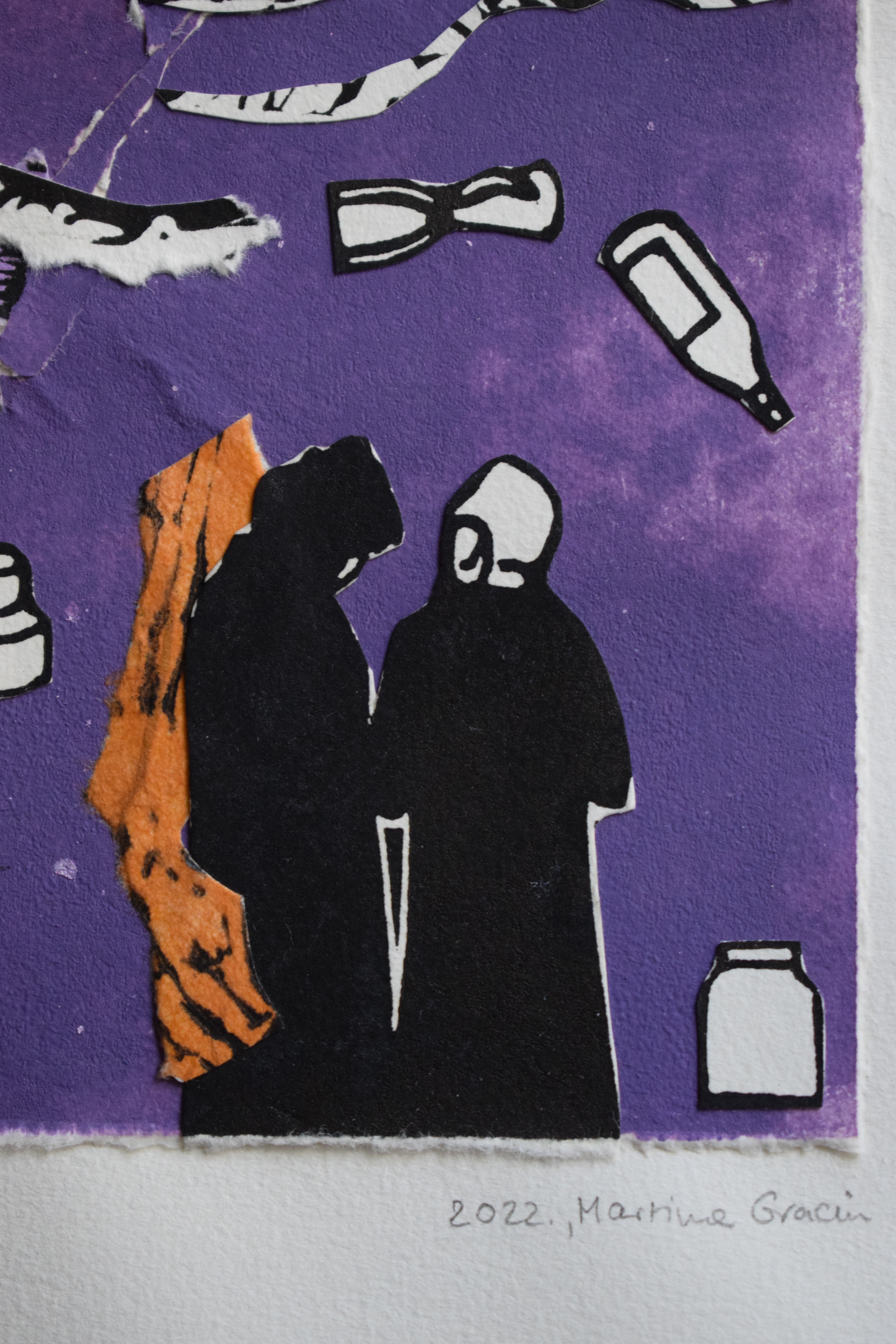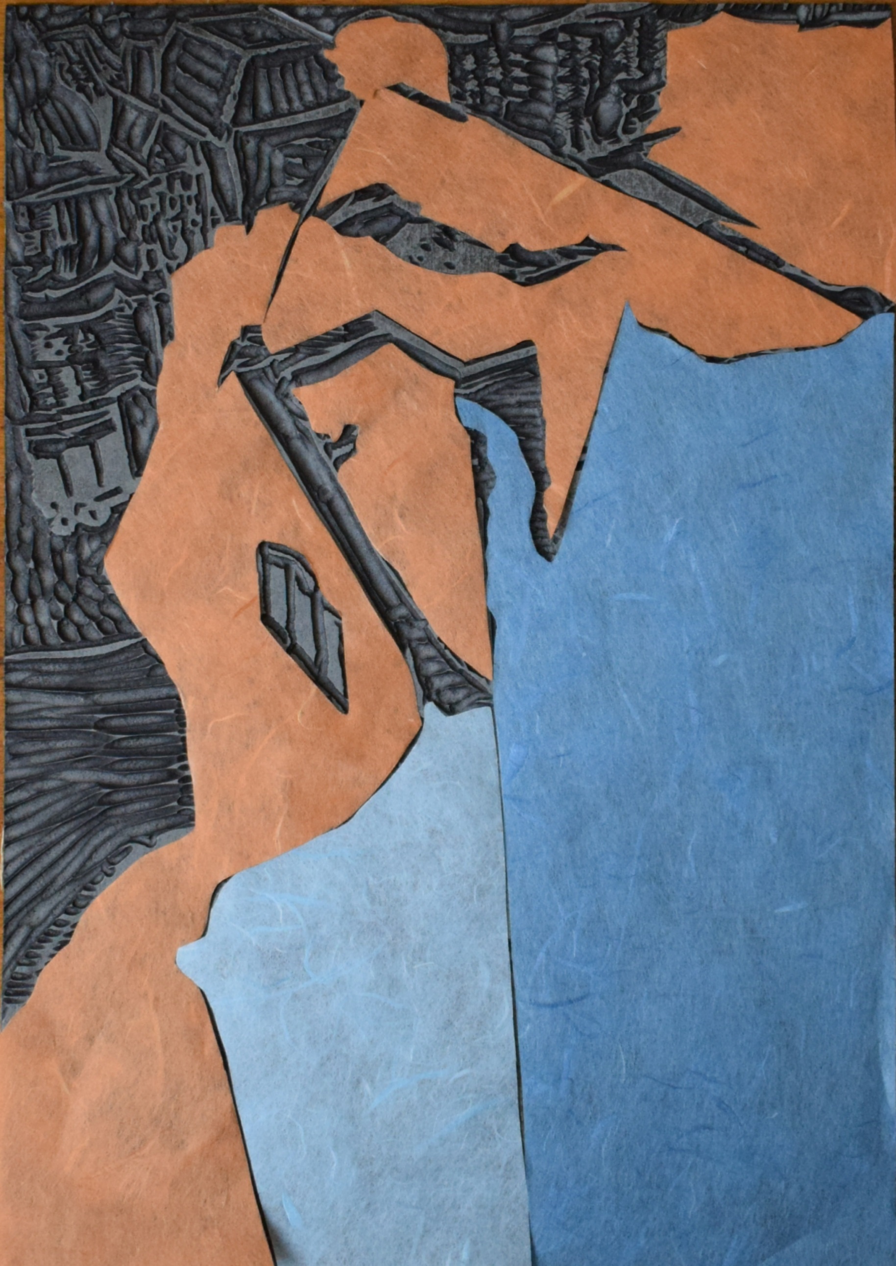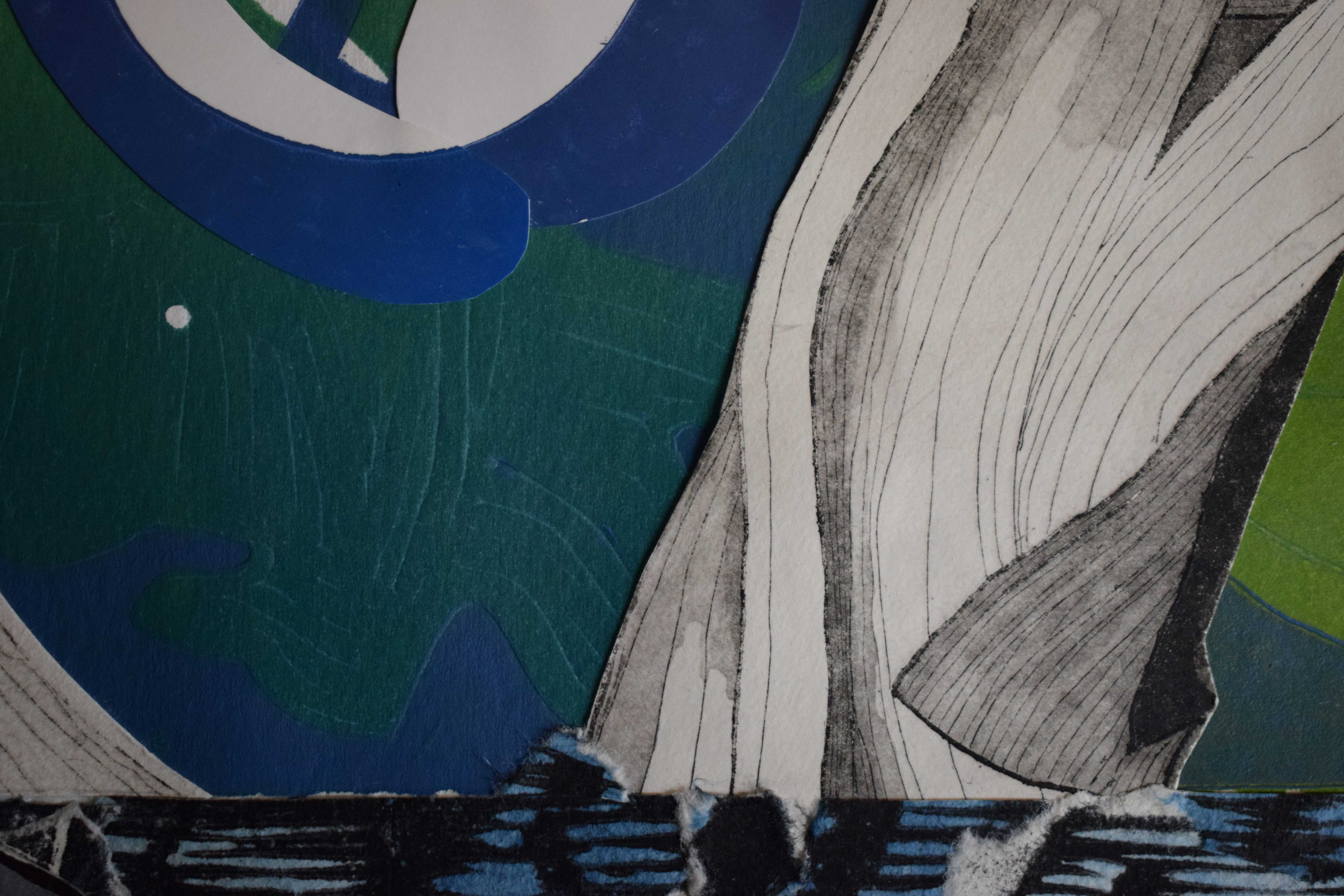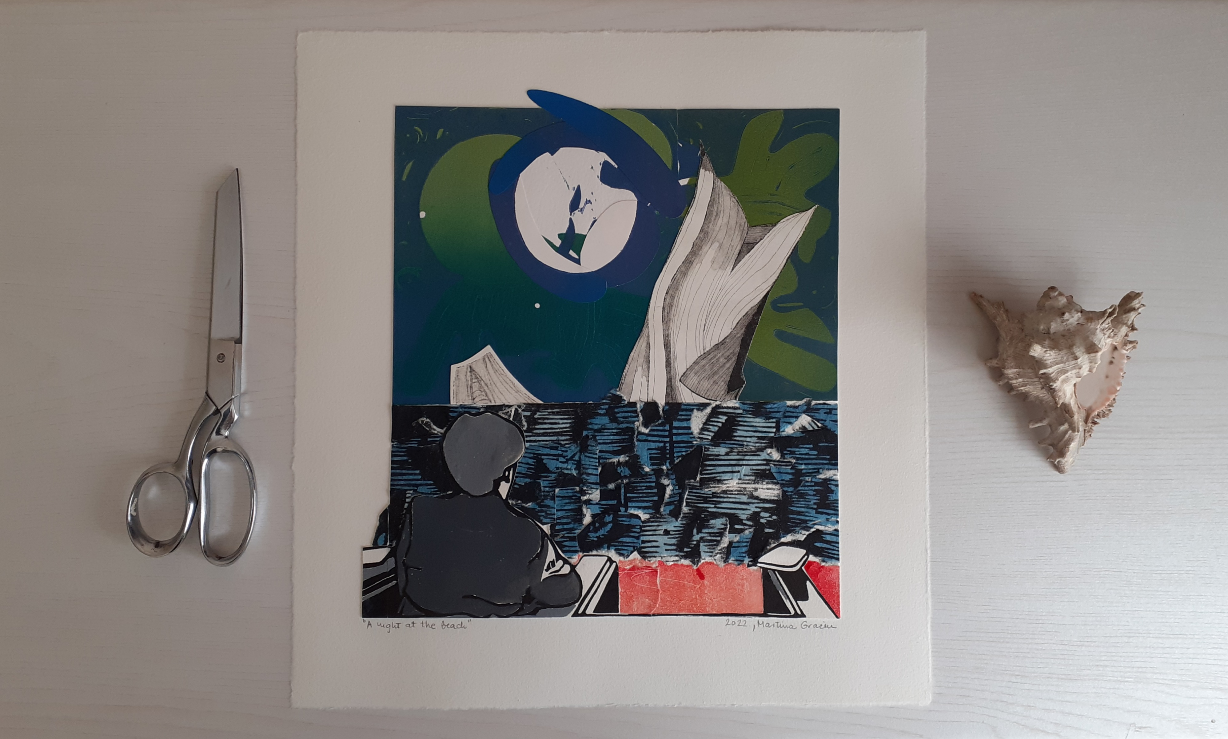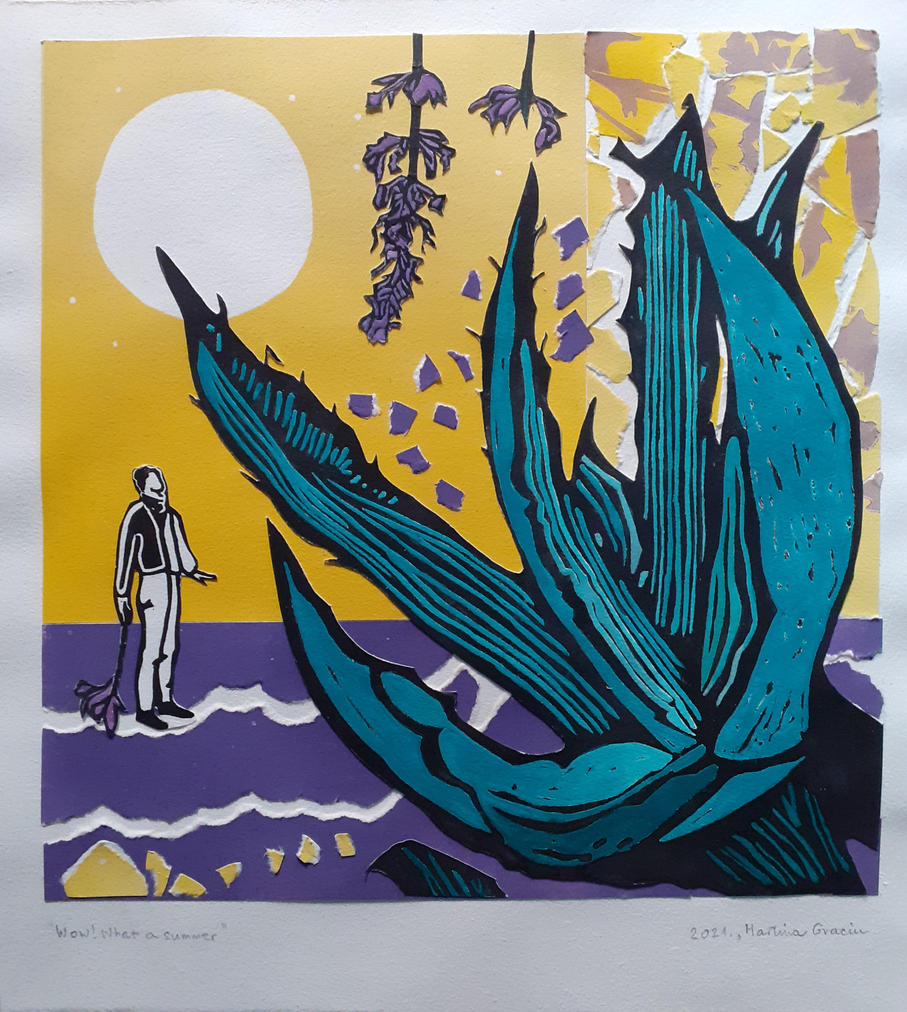 Sljedeći ljetni kolaž bio je malo većih dimenzija. Osim ljetom i toplijim danima, ovaj je kolaž inspiriran i magičnim realizmom. U njemu sam, osim dijelova mojih linoreza i monotipije, upotrijebila i dio grafike koju sam radila u tehnici dubokog tiska (rep).