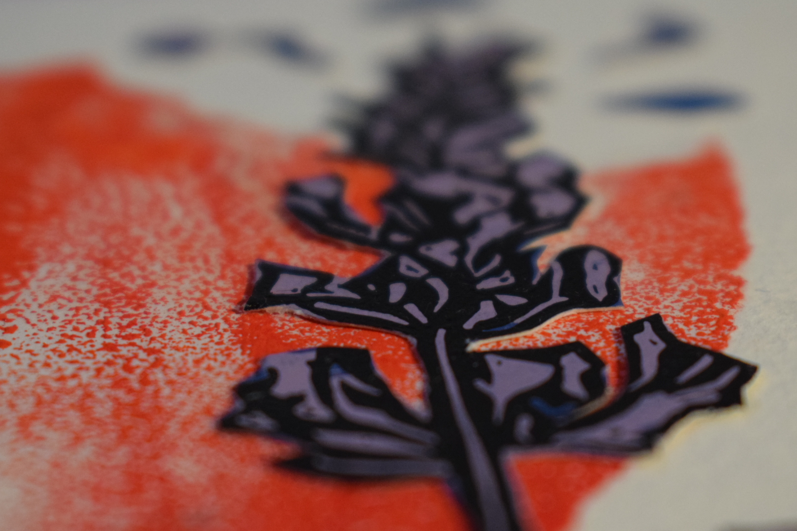 Specifičnost naše ljetne varijante redukcijskog linoreza bilo je otiskivanje sa Lefranc & Bourgeois bojama na bazi vode. U njihovim specifikacijama stoji da se ne mogu otiskivati jedna preko druge, no otkrila sam kako njihovo djelomično prekrivanje otiska na koji su otisnuti svejedno daje zanimljive efekte.
