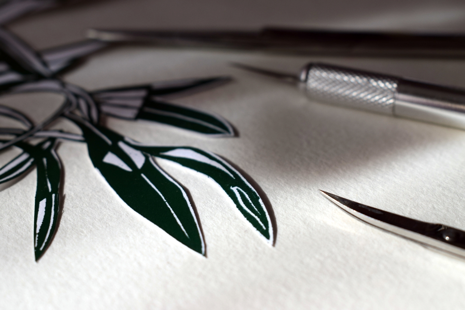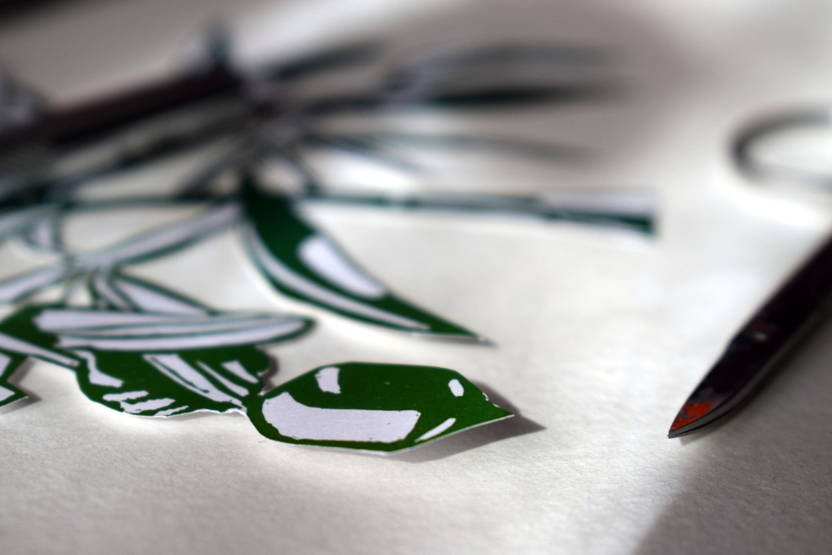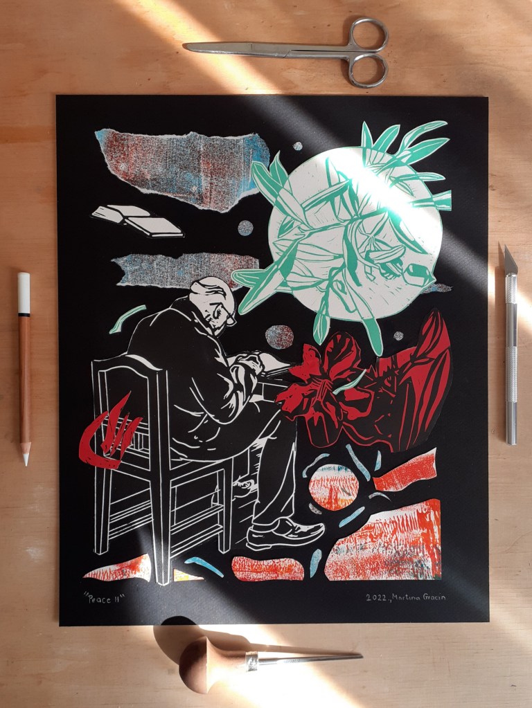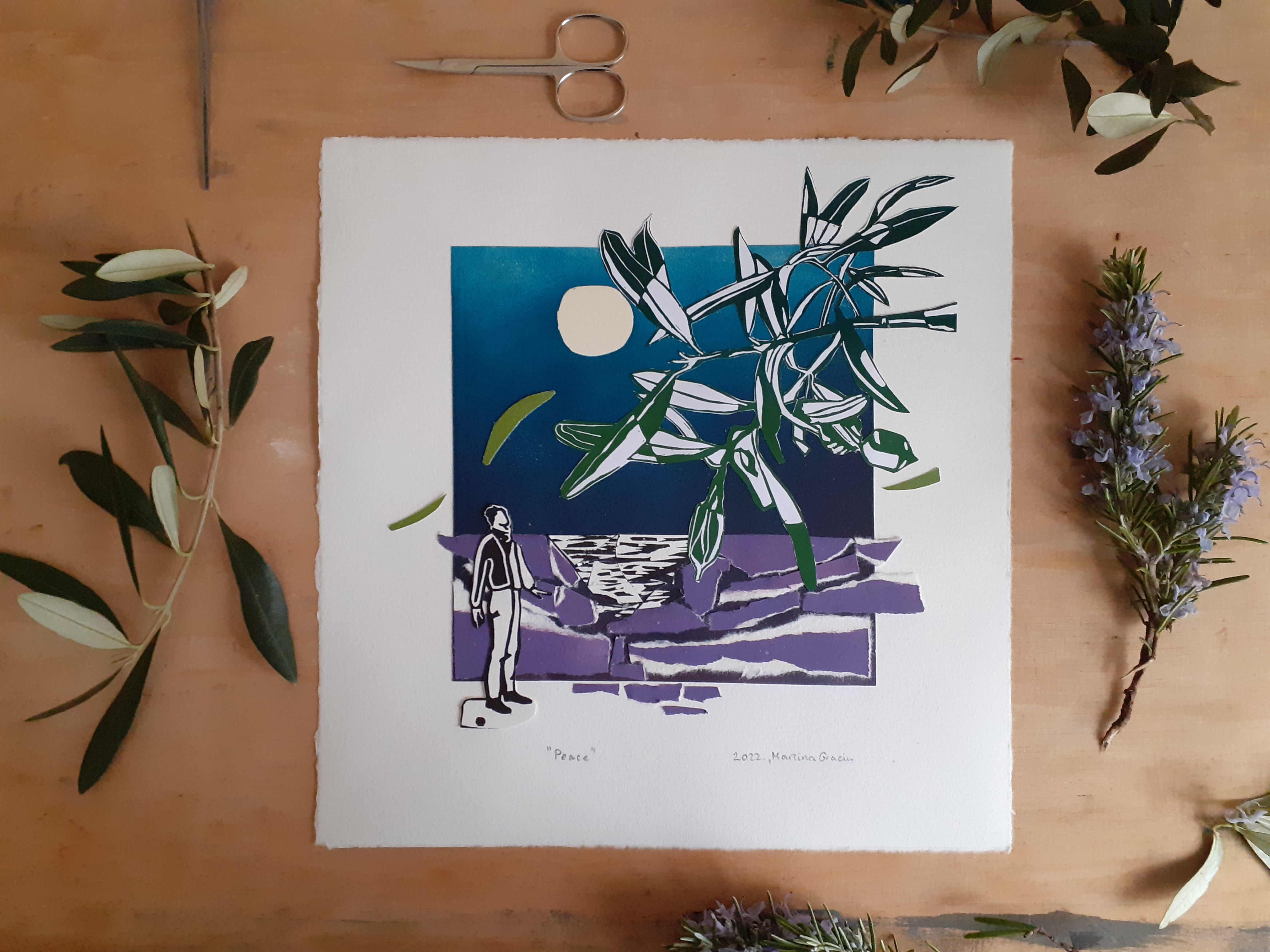 U to vrijeme je započeo rat u Ukrajini. Bez nekog određenog plana, izrezala sam jedan zeleni otisak svog linoreza koji prikazuje maslinovu granu.