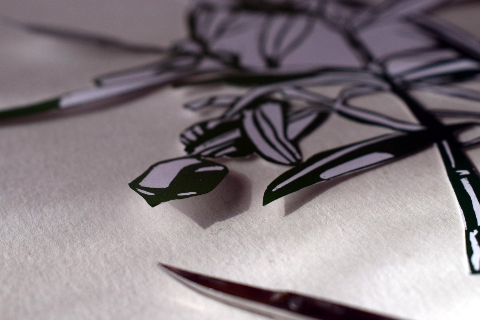 Skica je, zajedno sa mnogim drugima, čekala na red te dvije godine. Tako da je bio odličan osjećaj konačno je prenijeti na linoleum i krenuti na sljedeći korak. Htjela sam da kaktus i tegla u otisku budu crni, a cvijet ružičast, pa se trebalo odlučiti za jedan od načina izrade linoreza u dvije boje. I, budući da sam pri izradi ovog linoreza htjela raditi nešto manje zahtjevno, odlučila sam se za vjerojatno najjednostavniji način. Izdubiti dvije ploče i prisloniti jednu uz drugu pri otiskivanju.