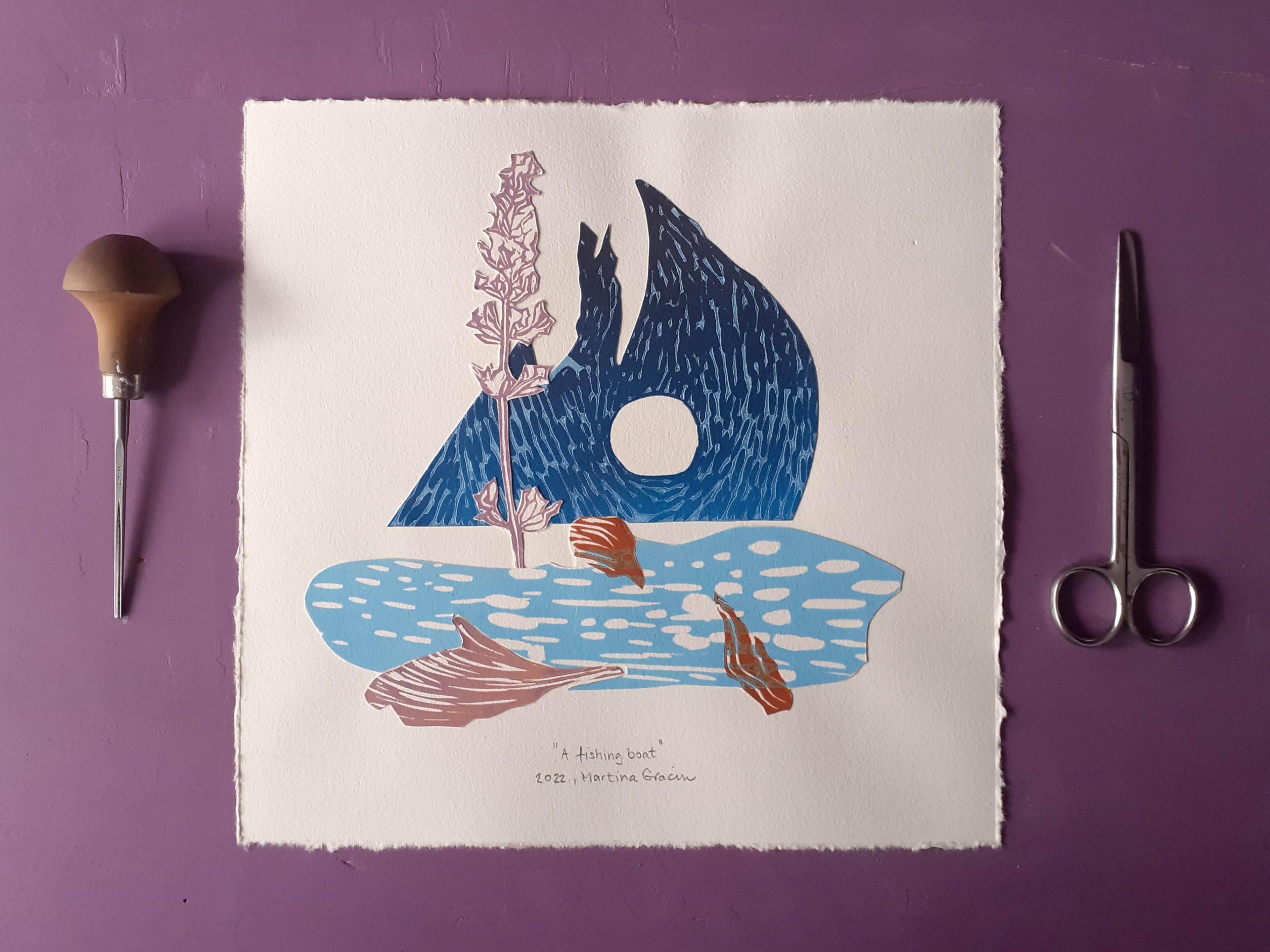 I još jedan morski kolaž. Ideja za ovaj ribarski brod krenula je od plavog jedra. Izrezujući otisak jednog višebojnog linoreza primijetila sam dio koji me odmah podsjetio na neko čudnovato jedro.
