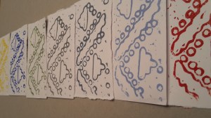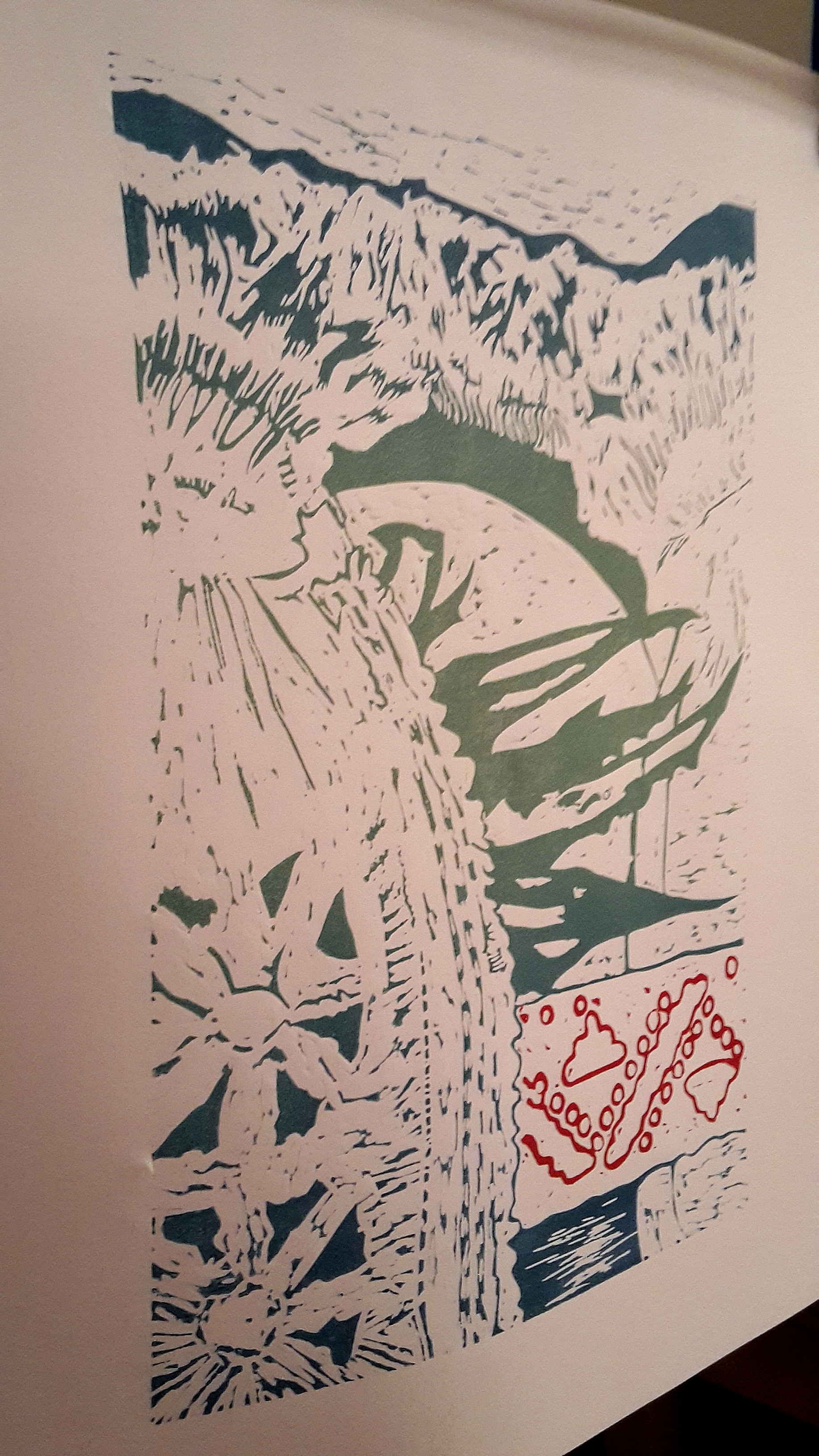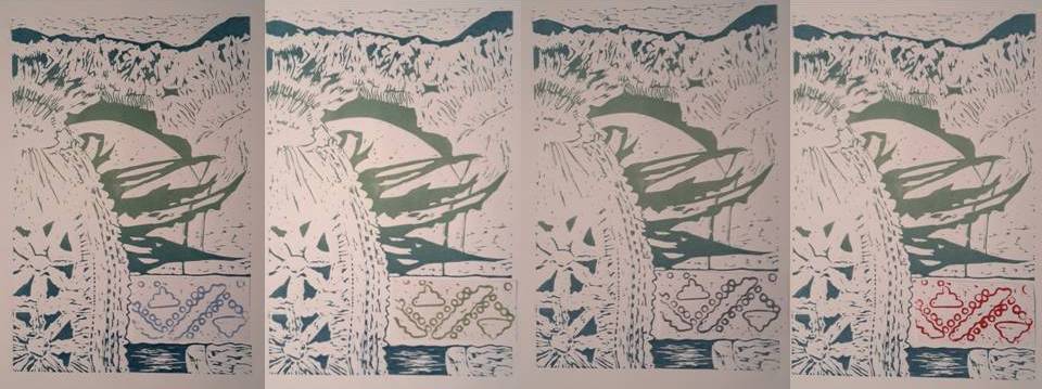 Prvi sam složila koristeći probni otisak za jedan od linoreza s motivom lavande. Tu su i elementi novijih linoreza Skopje i Mačkopis. Plažu sam složila trgajući otpadni element sa grafike napravljene u tehnici dubokog tiska.