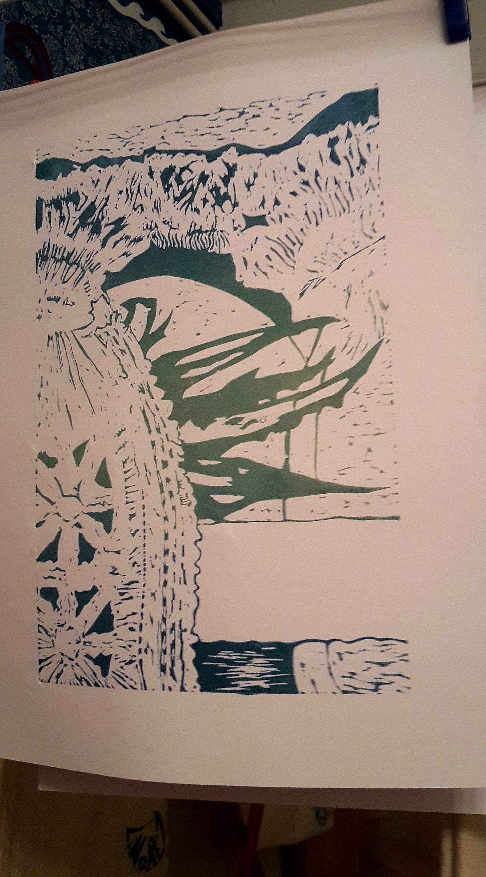I konačno, evo i prvih napora u tom smjeru- izdubila sam ploču u linoleumu i umjesto na papir, otisnula je na platno.