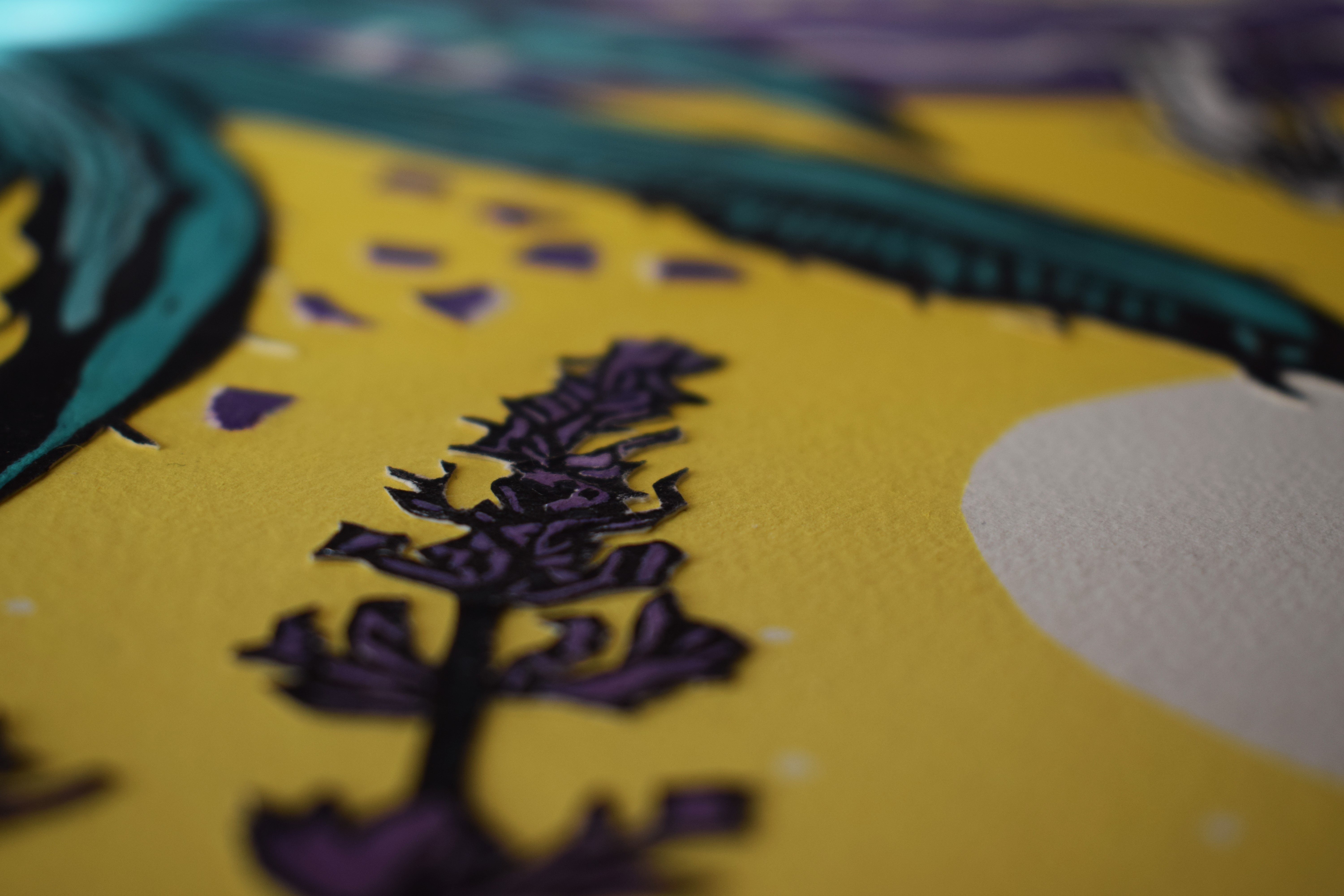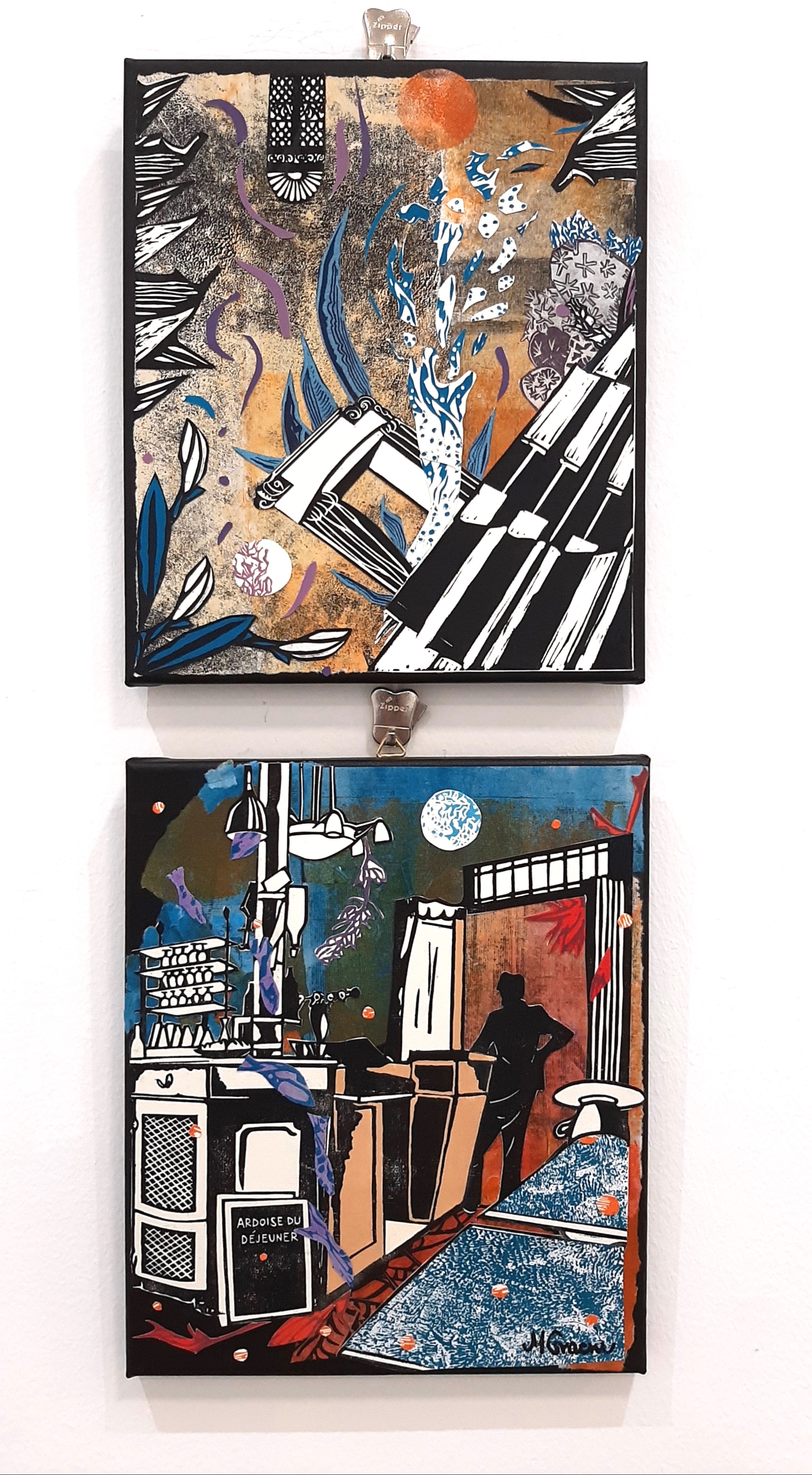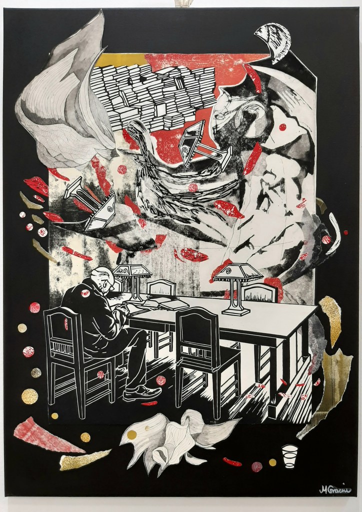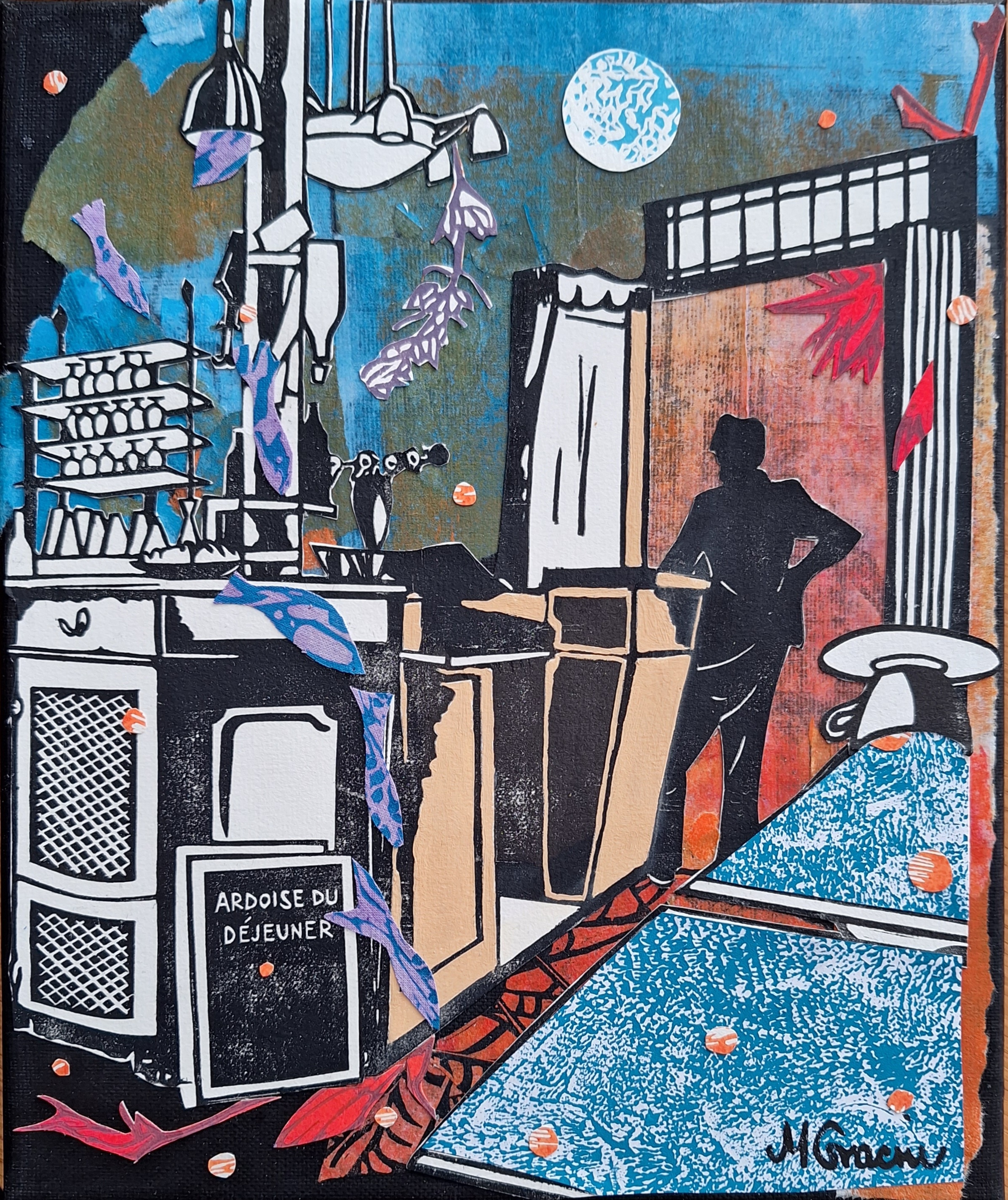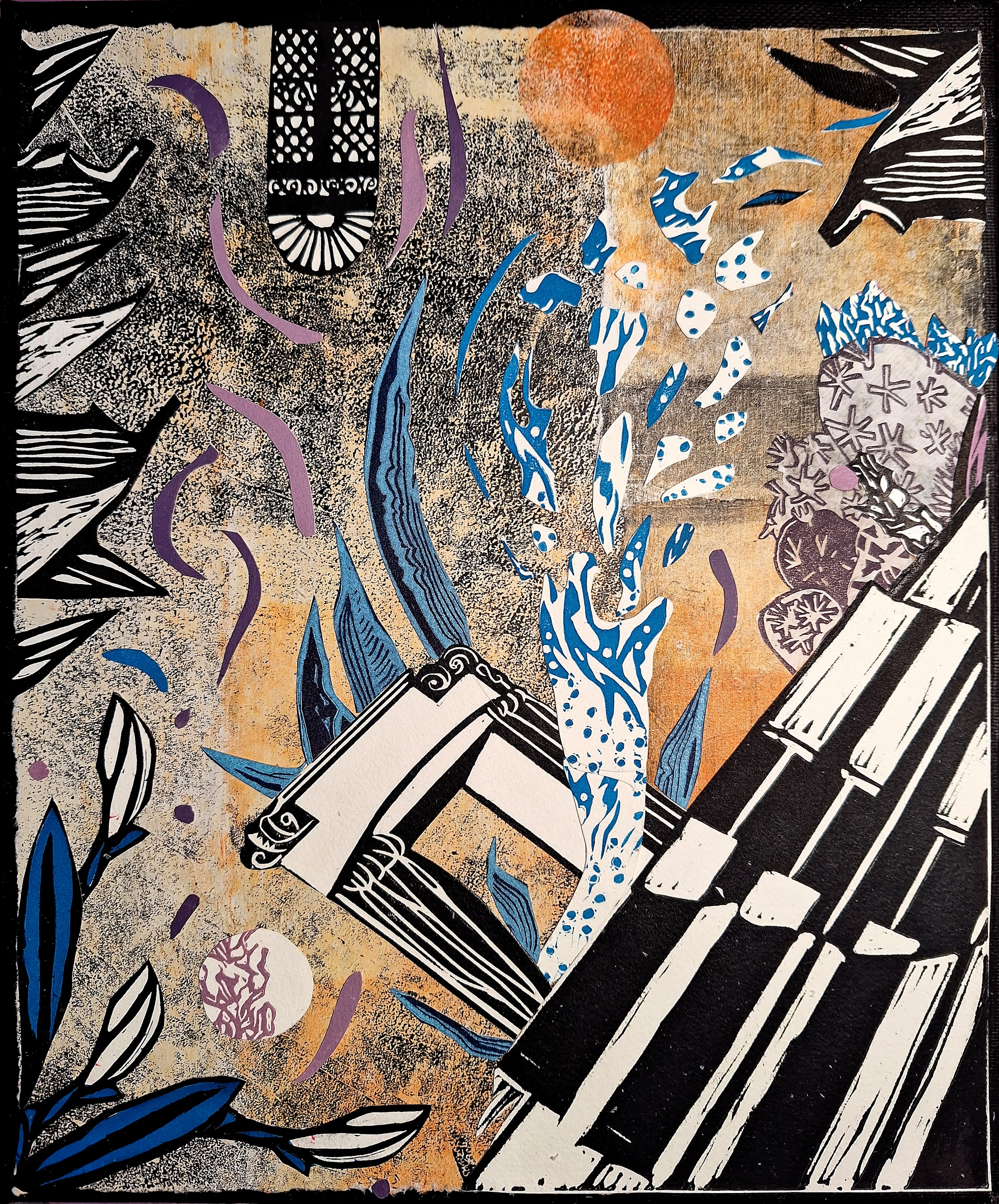 Podloga za rad Beach bar je crno slikarsko platno, a rad predstavlja često magičan doživljaj zalaska sunca u dalmatinskim barovima na plaži. Osnova za Beach bar proizašla je iz mog grafičkog otiska Le Pure café koji prikazuje scenu iz pariškog kafića poznatog svima koji vole sakupljati filmske lokacije. O nastanku grafike Le Pure café možete pročitati u ovom postu. U dalmatinskoj varijanti kafića s jednog od lustera visi velika lavanda, a iz drugog isplivavaju ribe. One ulaze u more koje se ograničilo na stolove, a izliveno je iz preokrenute šalice. Crno bijelu strukturu rada daju, dakle, elementi otisnuti u tehnici linoreza. U toj su tehnici također otisnuti i mjesec, ribe i lavanda. Nebo i more sastavljeni su od monotipija.