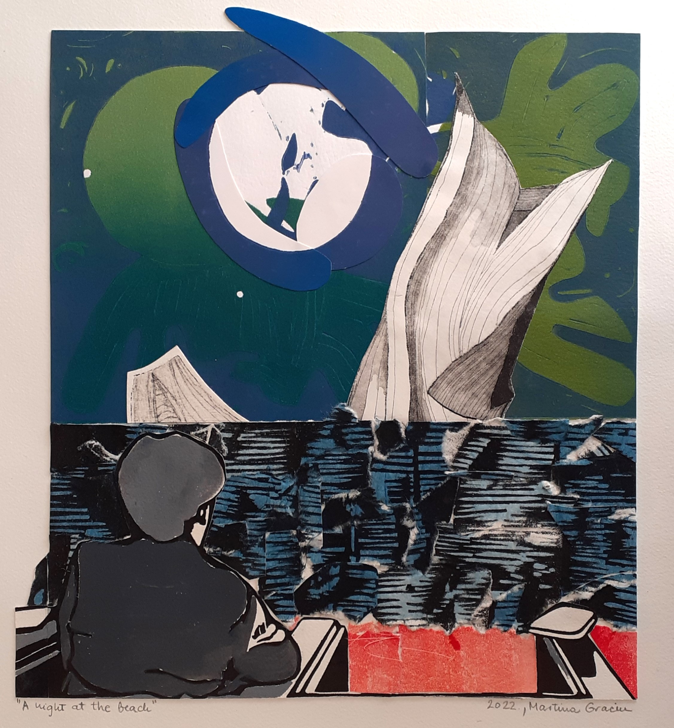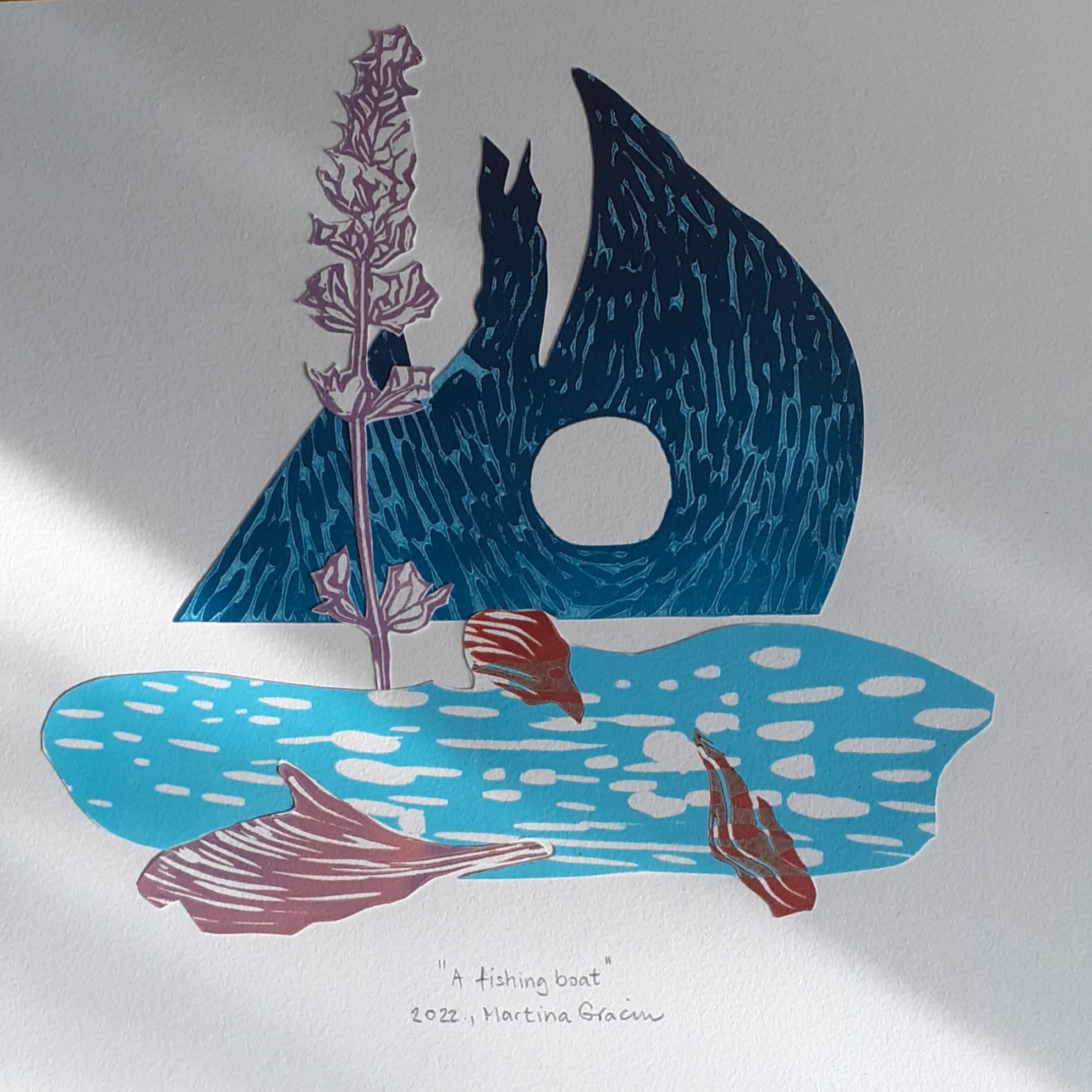 Evo još radova s dalmatinskim motivima. A fishing boat, mali ribarski brod s lavandom kao jarbolom. Neuobičajeni jarbol i ostali dijelovi rada moj doživljaj Dalmacije premještaju u područje snova. Kao iz nekog čudnog sna je i rad A night at the beach. To je prikaz noćnog promatranja neobične nemani koja uranja i izranja na horizontu. Nešto više o elementima izrade ovih radova pisala sam ovdje.