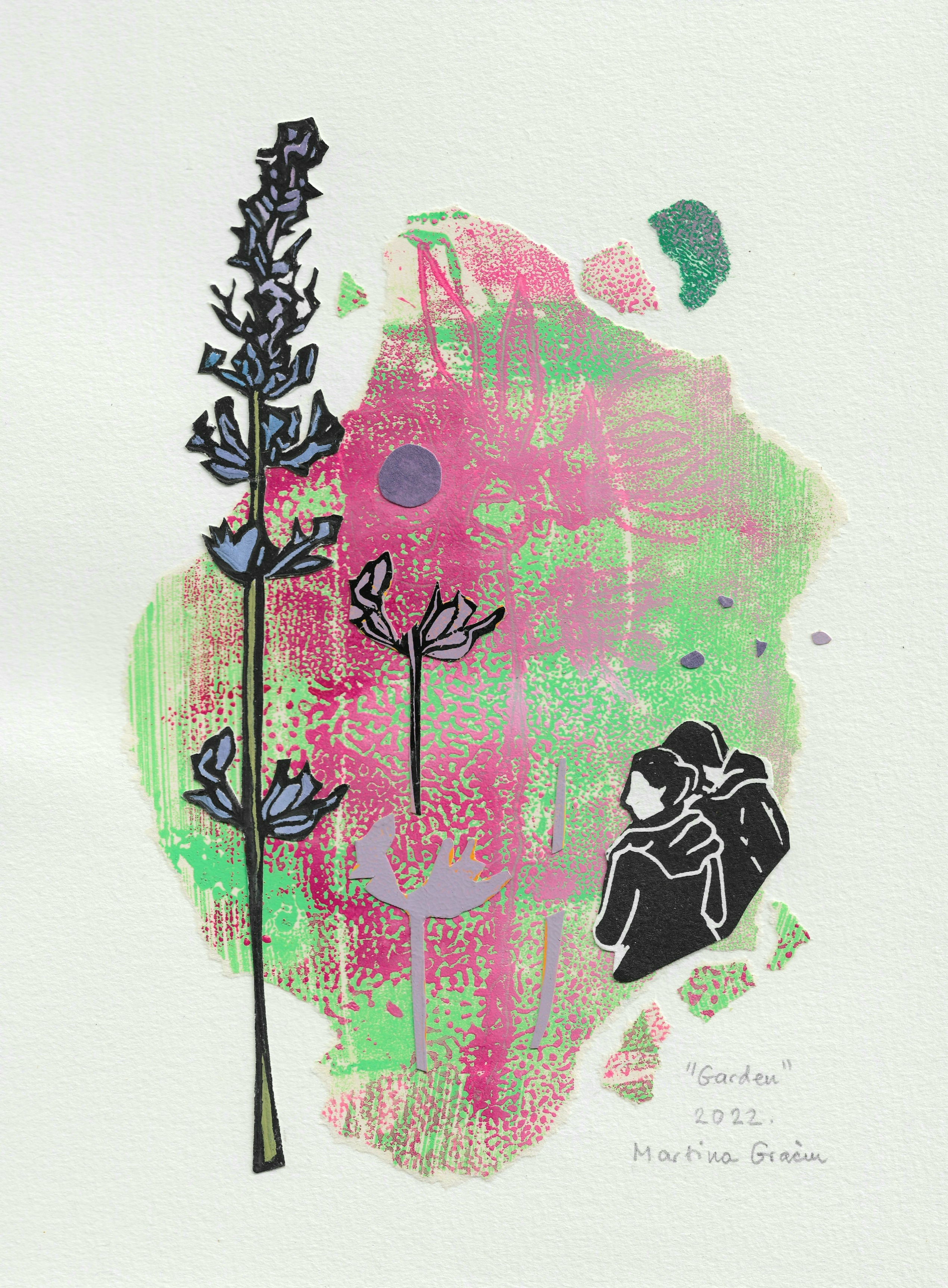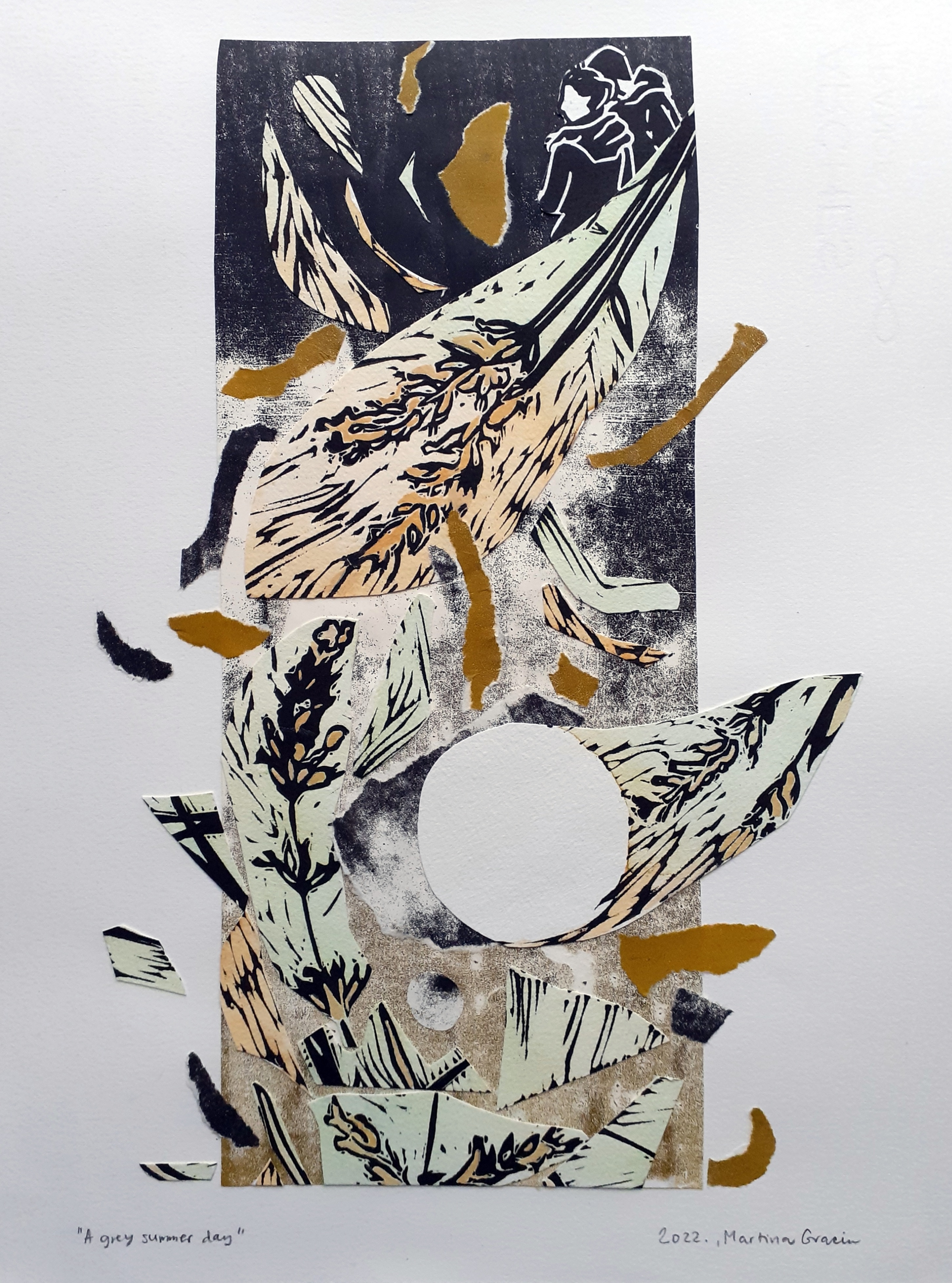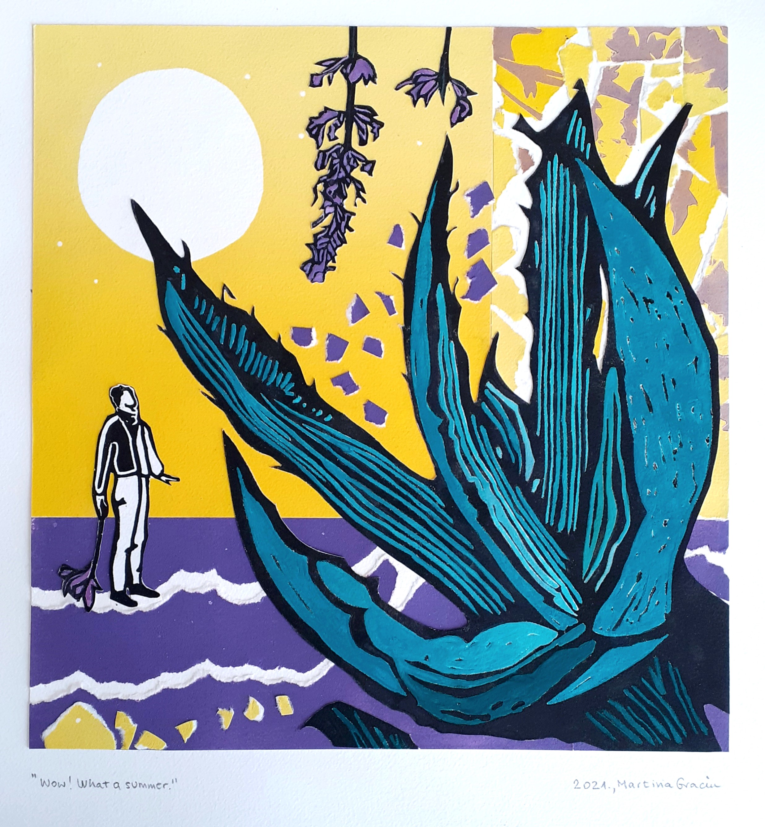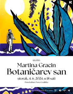 Za plakat moje izložbe „Botaničarev san” upotrijebljen je rad iz 2021. godine. Rad sam bila nazvala Wow! What a summer., a napravila sam ga od kombinacije otisaka nekih od mojih ranijih grafika. O samoj tehničkoj izradi ovog rada možete više pročitati ovdje, u jednom od prethodnih postova. Kao predložak dizajneru za plakat i kao prvi u postavu izložbe, ovaj rad tematski najavljuje ostatak izložbe. No, iako svojim nazivom upućuje na fascinaciju ljetom, tematika moje izložbe više je bila vezana za razmišljanje i doživljavanje vizualnih i emotivnih percepcija mojih obiteljskih korijena.